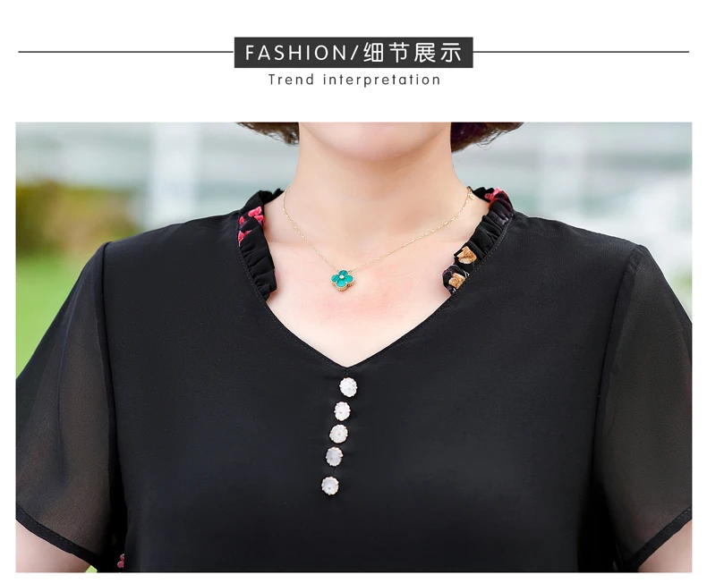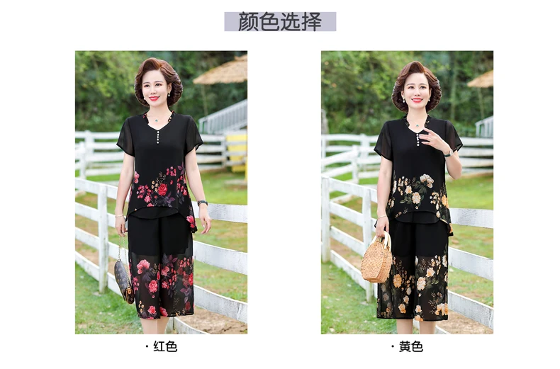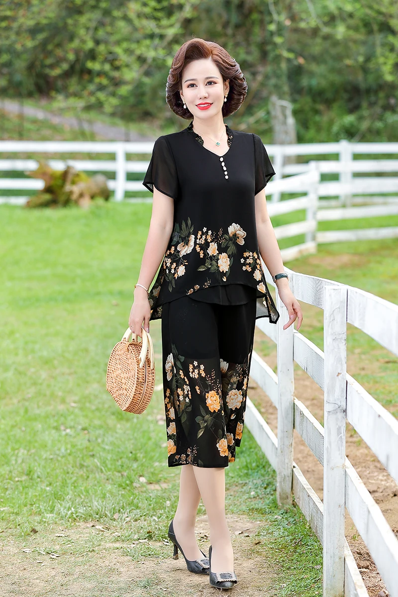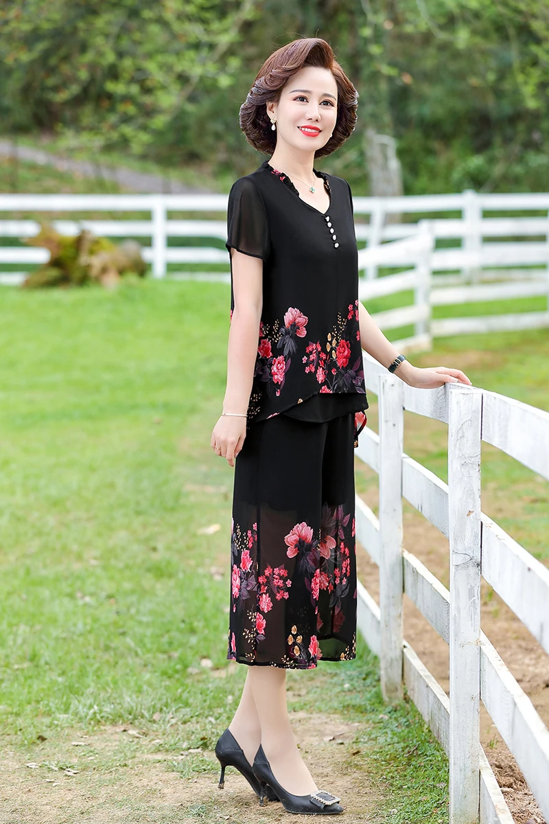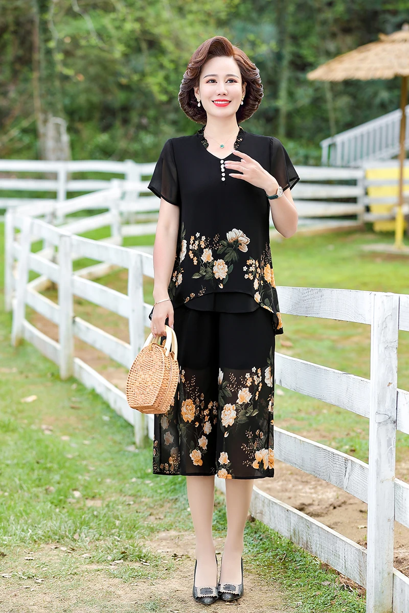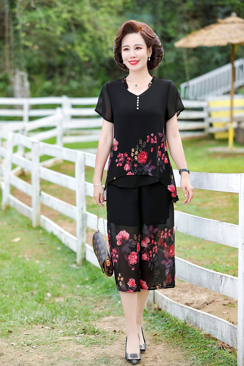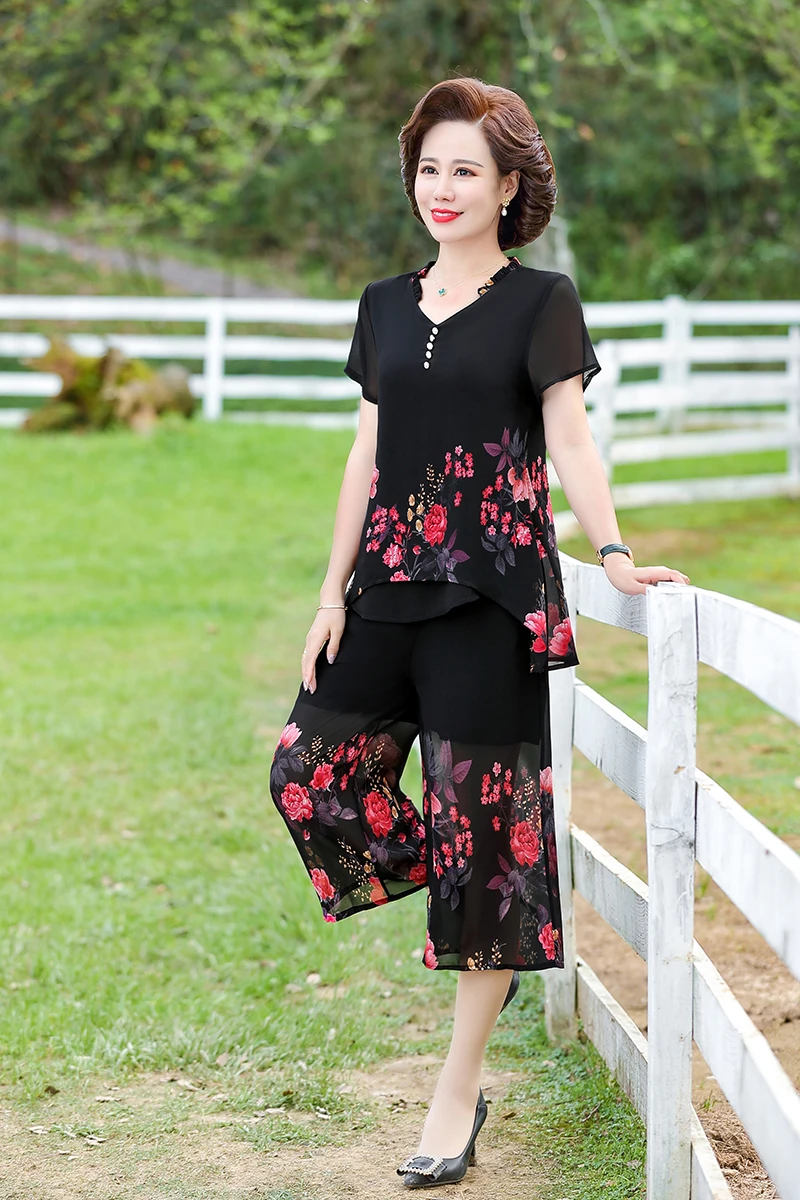 Elegant floral Middle-aged Womens Summer Suits Short Sleeve Chiffon T-shirt Top &Wide-leg Pants 2 Pcs Sets 5XL