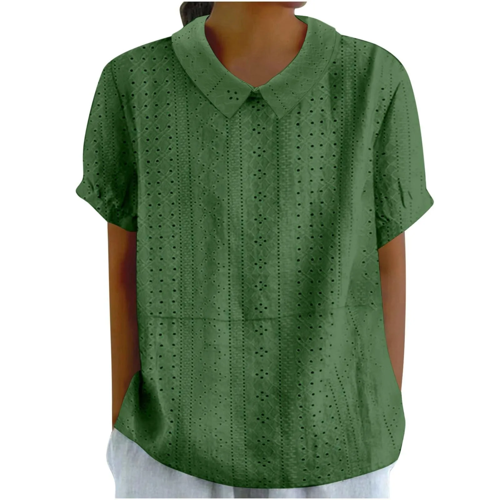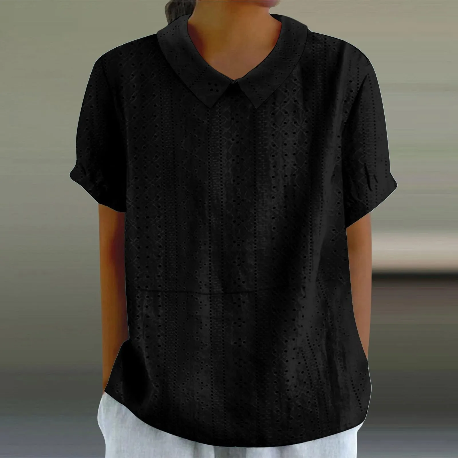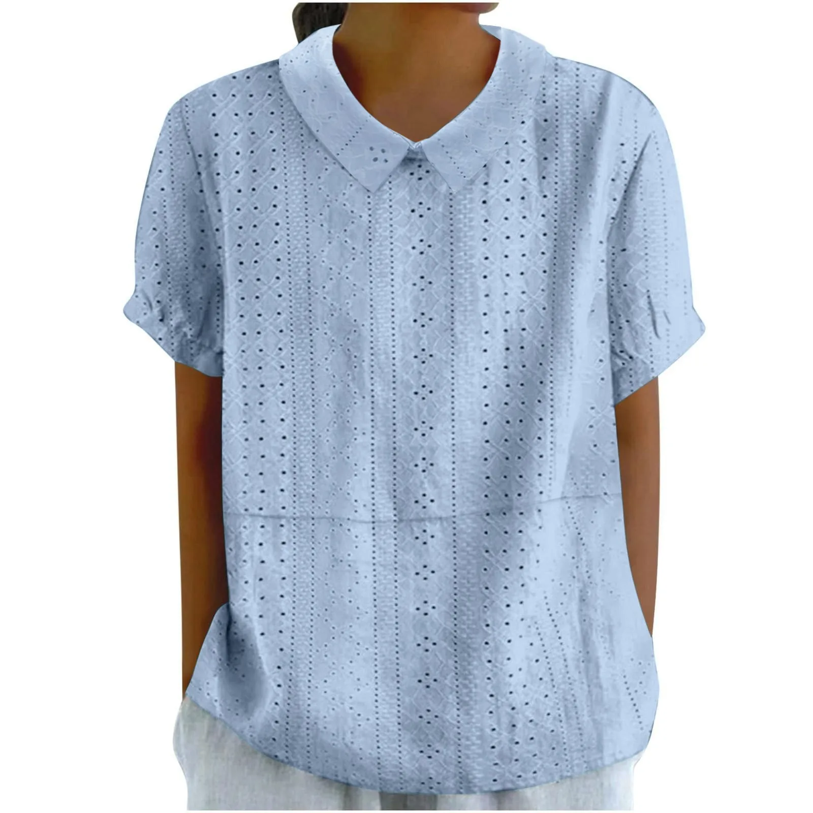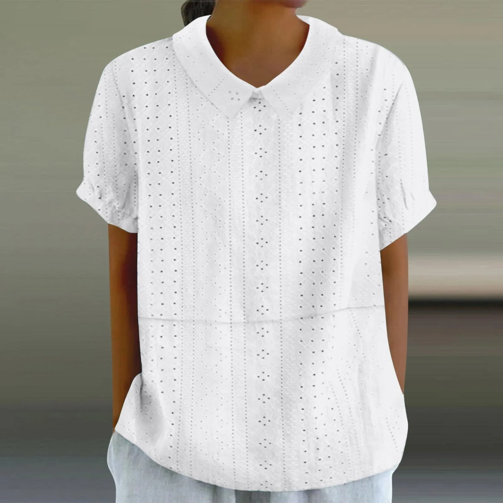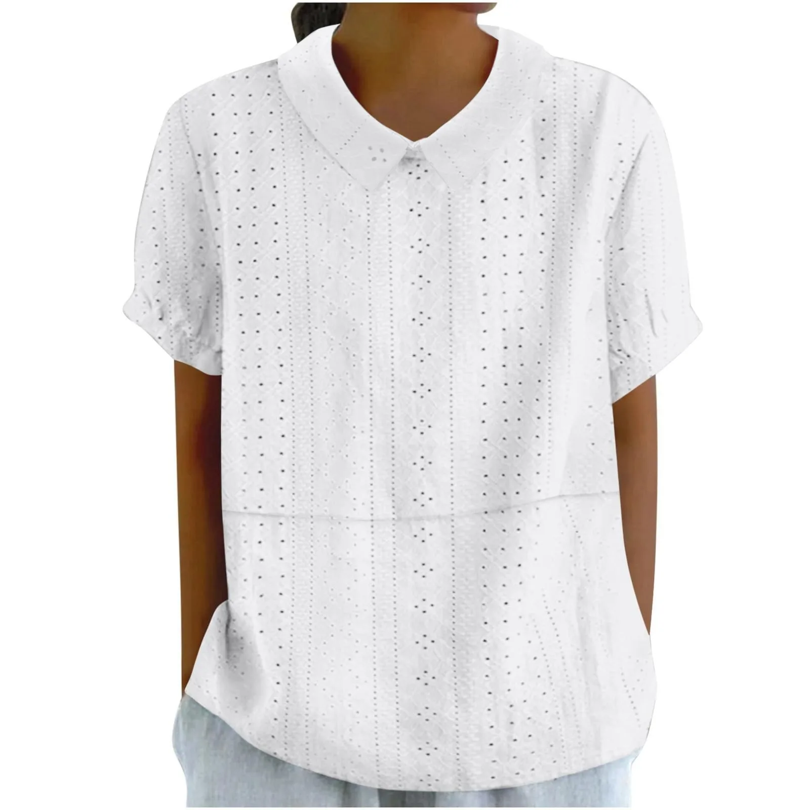 Elegant Hollow Turn-Down Collar Blouse Shirt Top Button Short Sleeve Women Blouse Casual Summer Fashion Female Tops