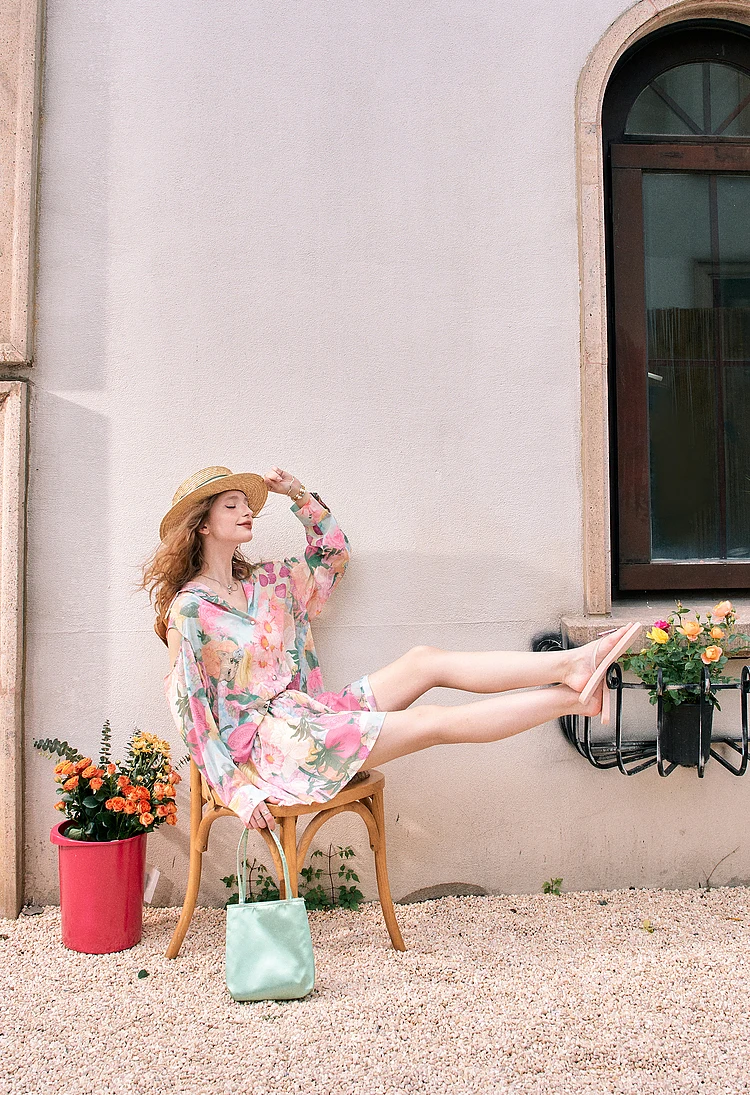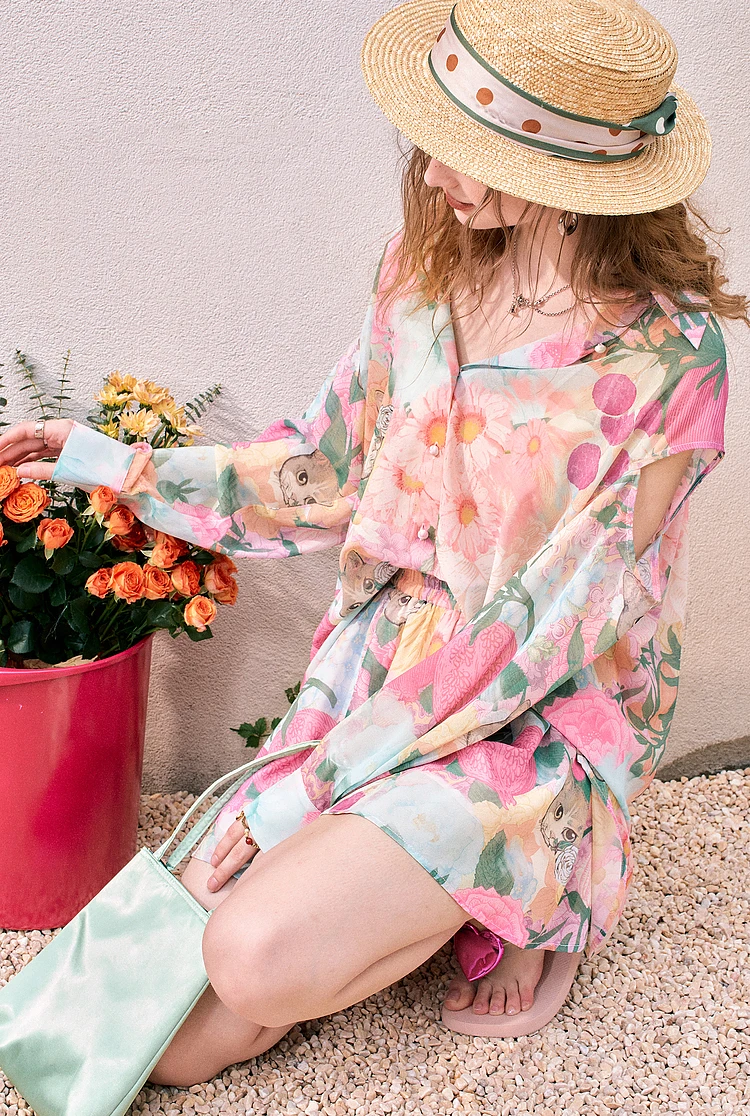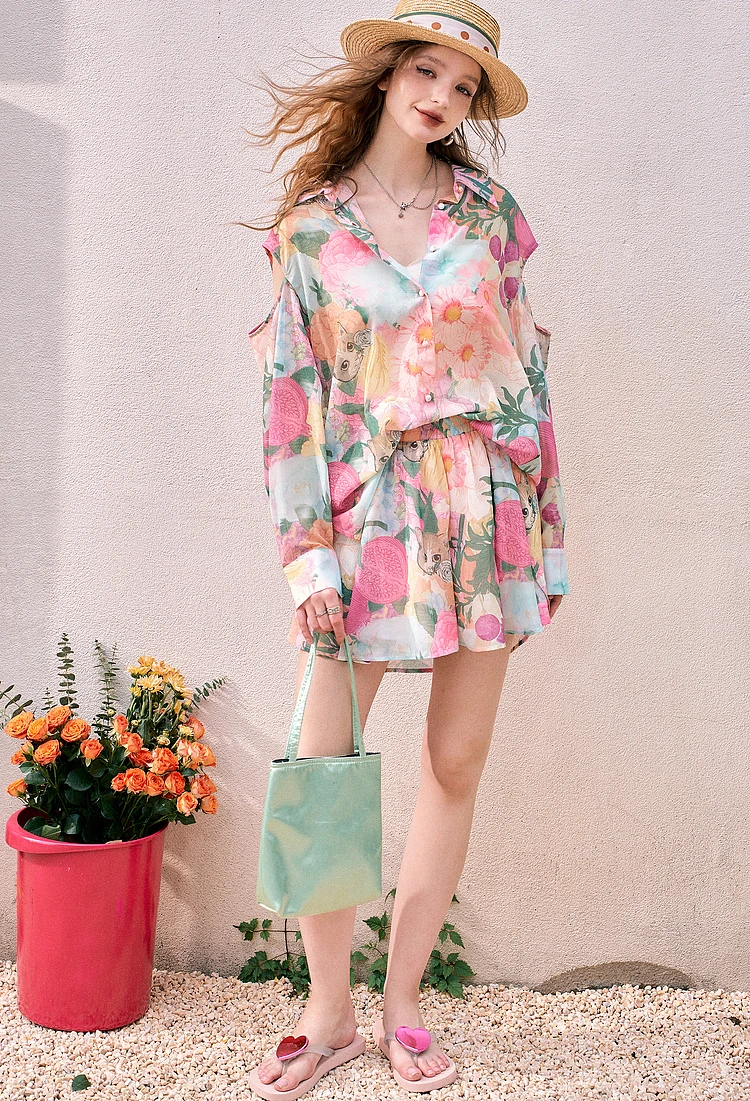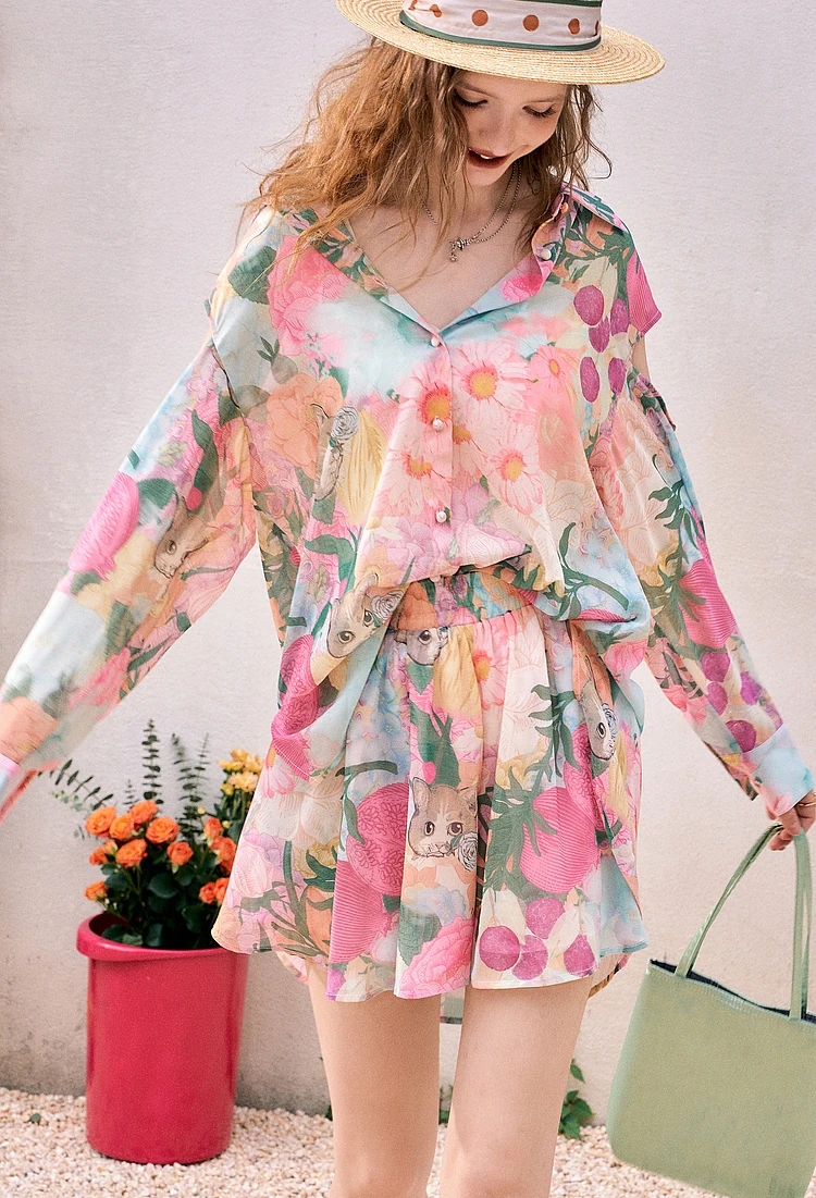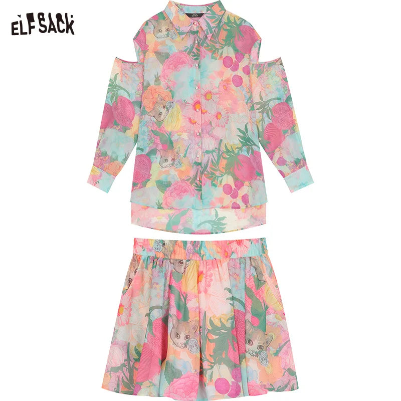 ELFSACK 2024 Summer New Lazy style printed pink holiday style themed shorts two piece suit for women