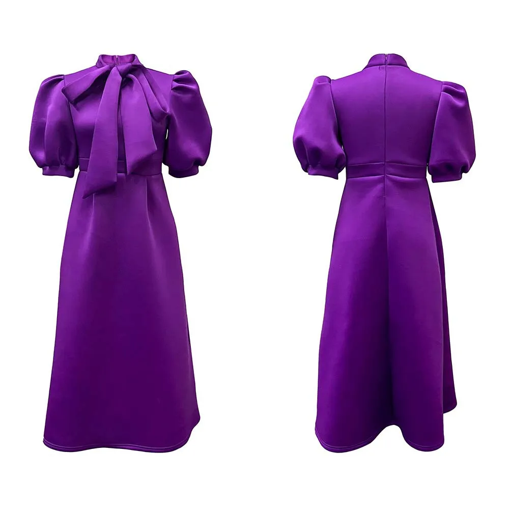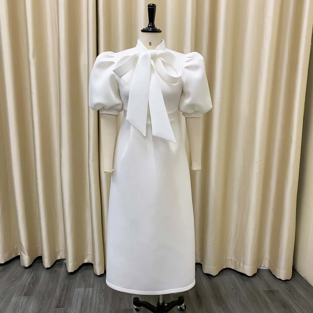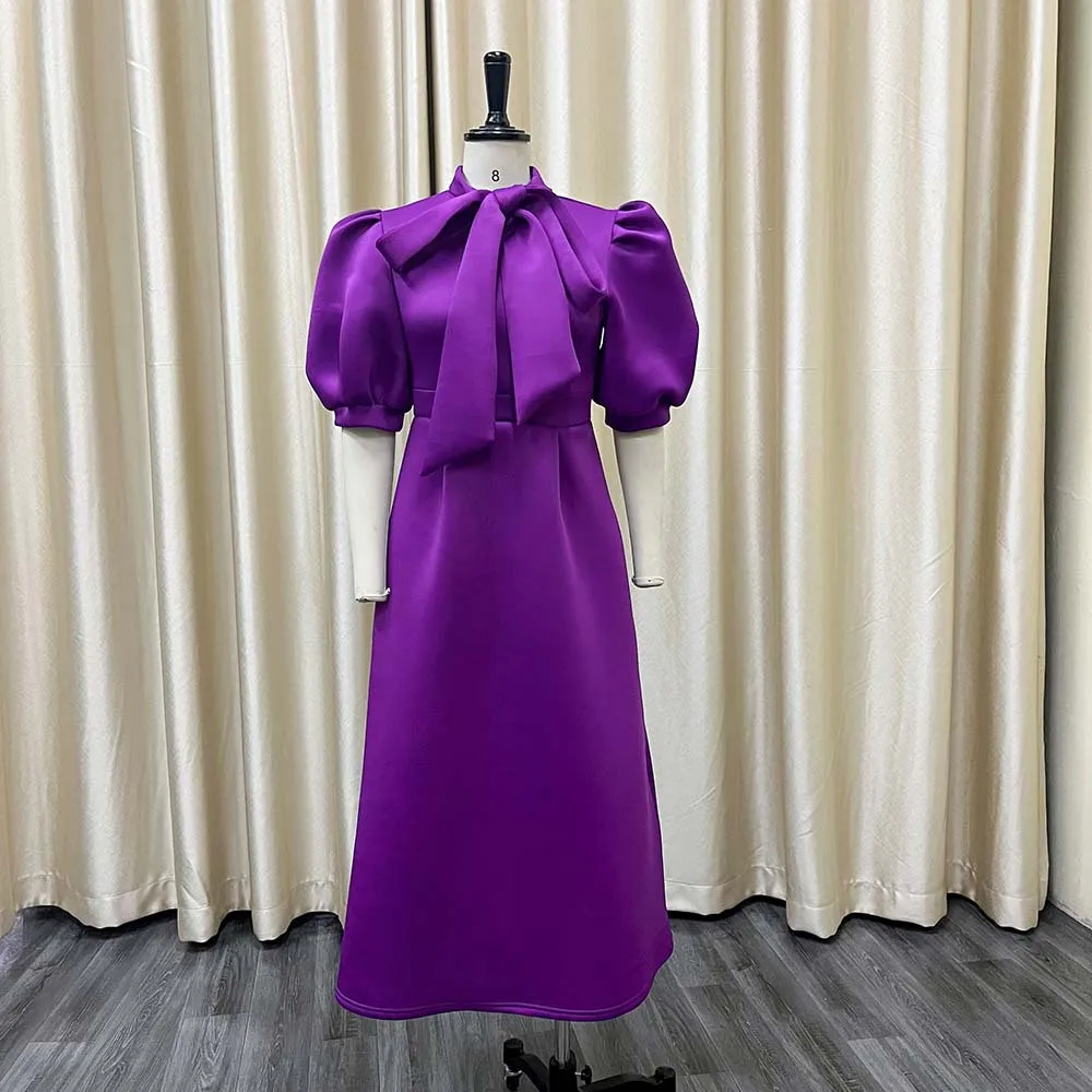 FairyShely 2025 Puff Short Sleeve Plus Size Dress Women Solid Bow Large Big Dresses Summer Lady O-Neck Party Tight Curvy Dress