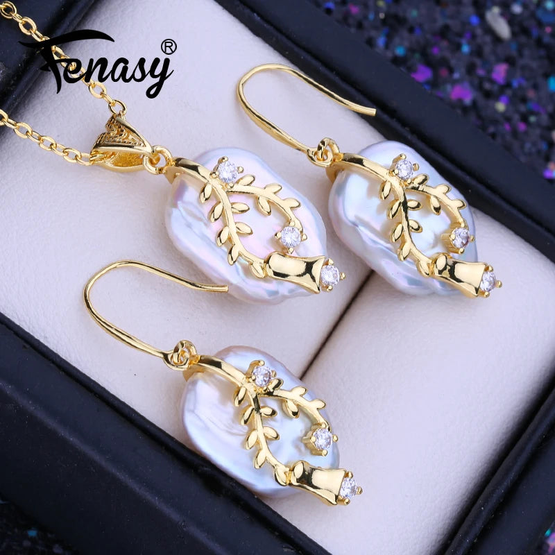 FENASY Natural Freshwater Big Baroque Pearl Jewelry Sets 18K Gold Plated Pendant Necklaces Wedding Drop Earrings Gifts For Women