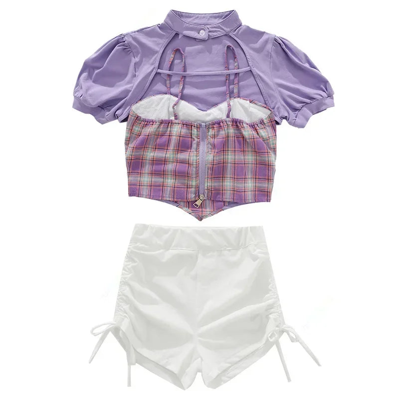 Girls Summer Jazz Dance Costume Plaid Tops Shorts K-pop Clothing Hip Hop Dance Outfit for Children Cheerleading Clothes Kids AB