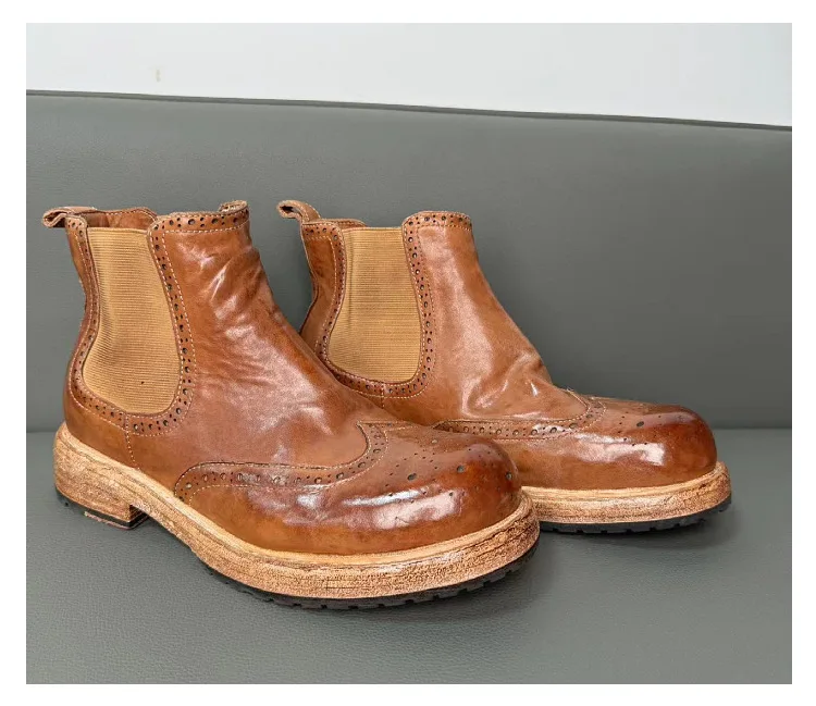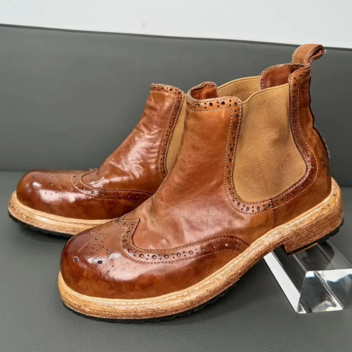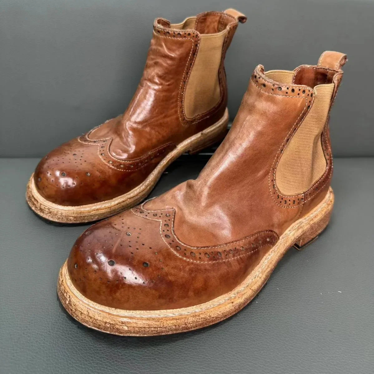 Goodyear-welding New Horse Leather Men's Chelsea Boots with Elastic Sleeves Wearing Block Carved Shoes Men's Leather Shoes
