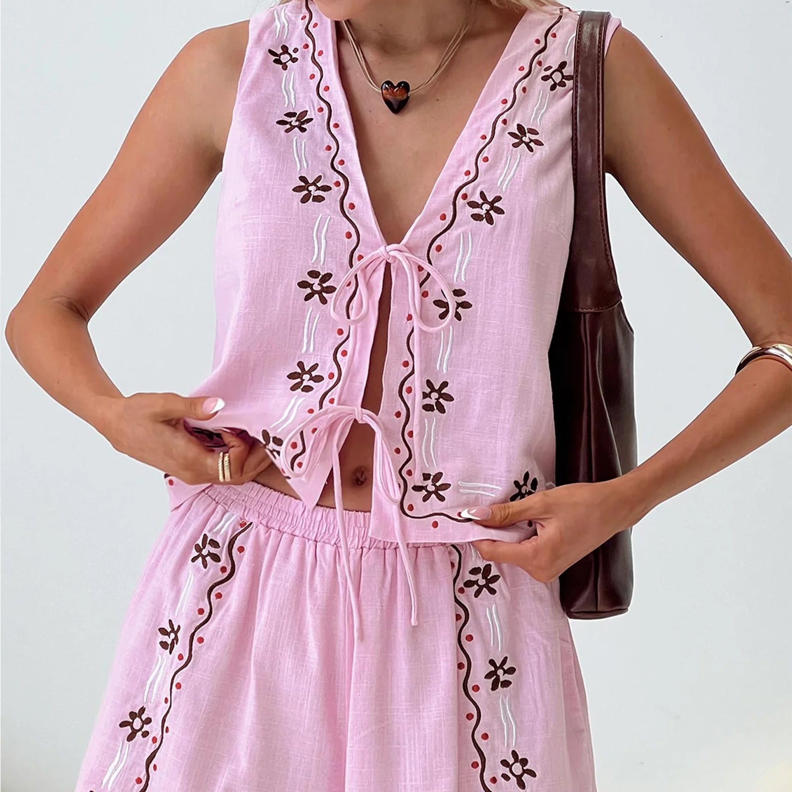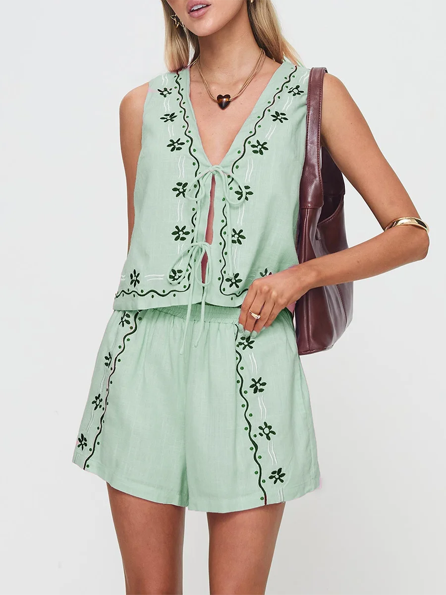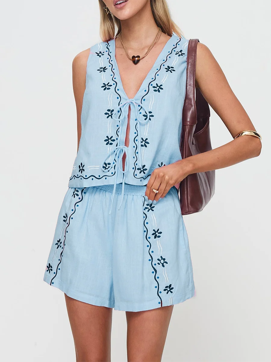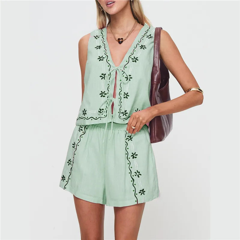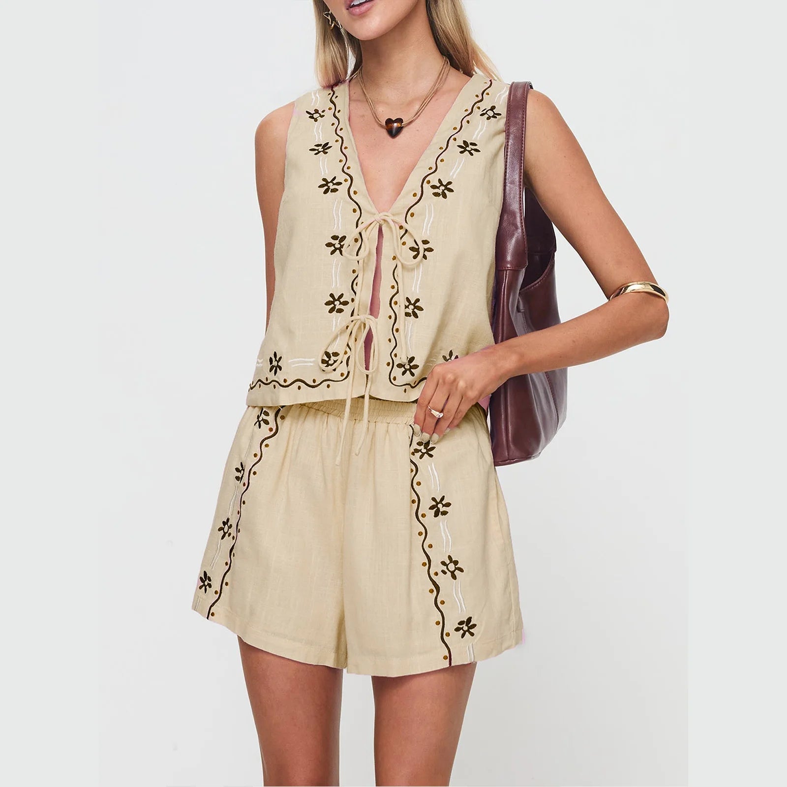 hirigin Women Summer Shorts Outfits Embroidery Tie-Up Front V-Neck Sleeveless Tank Tops Elastic Waist Shorts 2Pieces Clothes Set