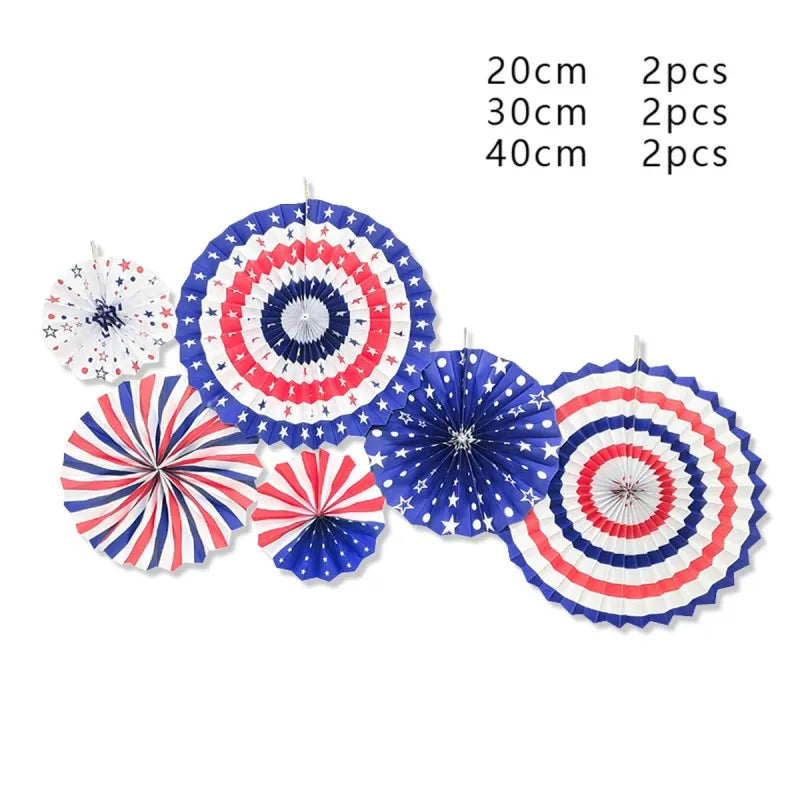 BEAUTIFUL AND PATRIOTIC CIRCULAR PAPER FANS. Six red, white and blue fans in 9 different stars-and-stripes designs and three sizes (8", 12" and 16") for use as hanging decorations.