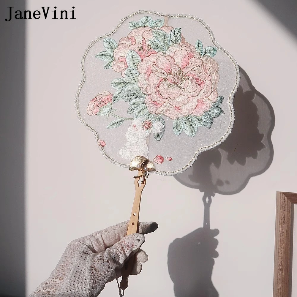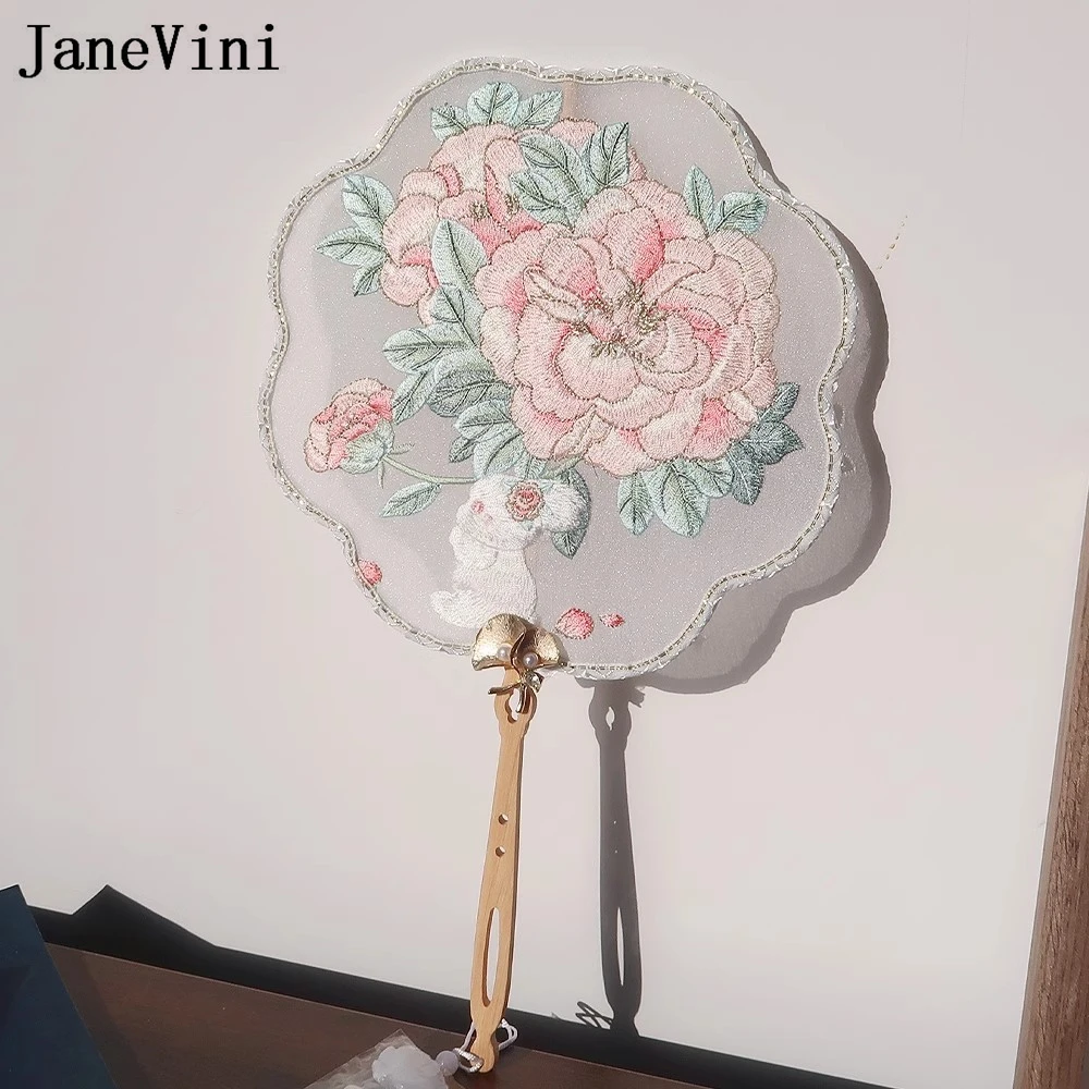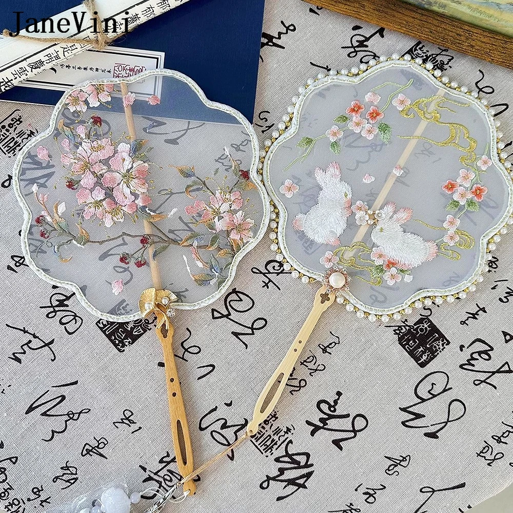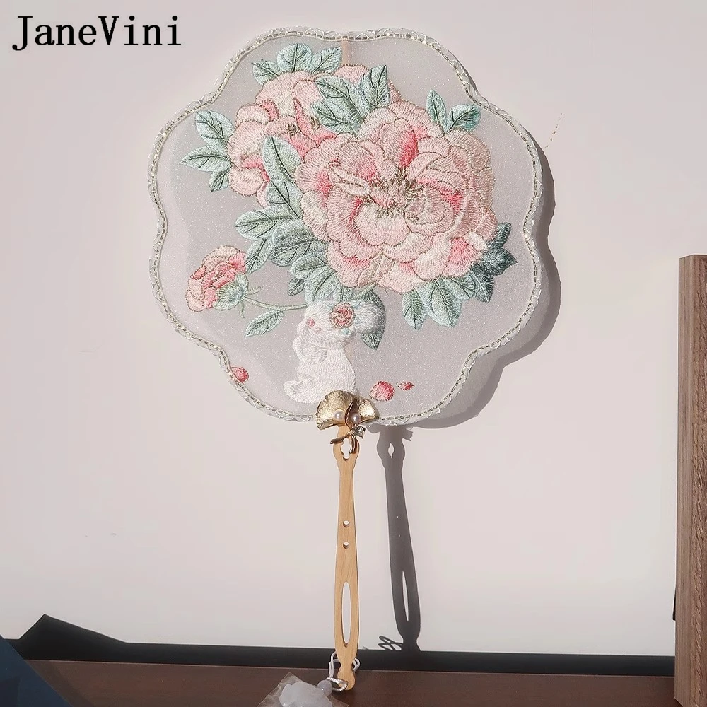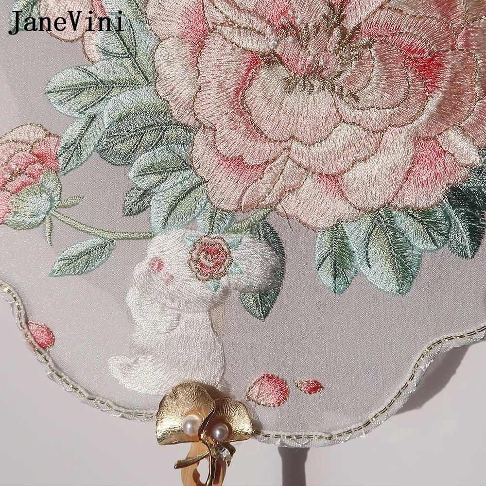 JaneVini Delicate Embroidery Flowers Rabbit Wedding Bride Fan Handmade Hanfu Xiuhe Bridal Fan Bouquet Accessories Handicraft