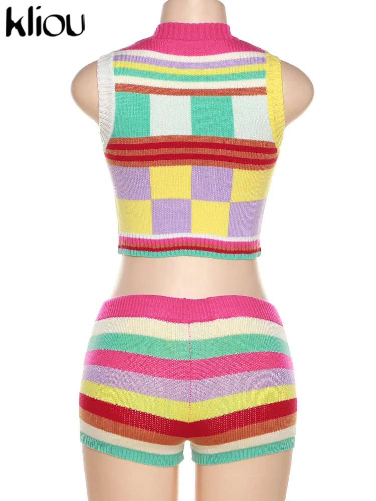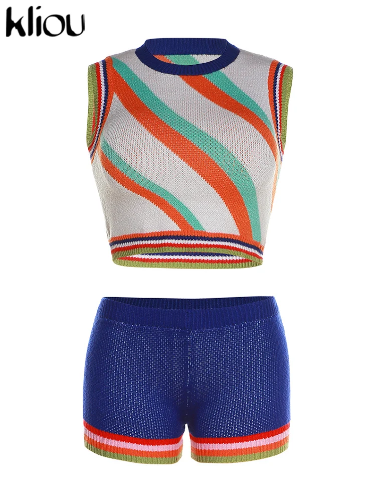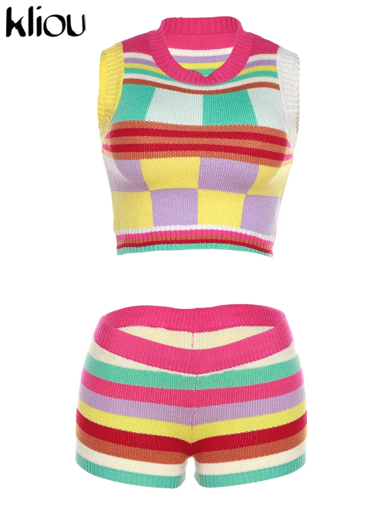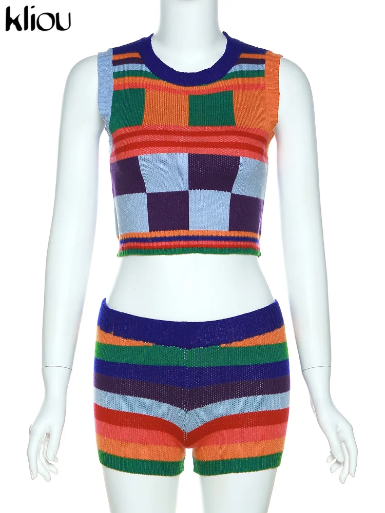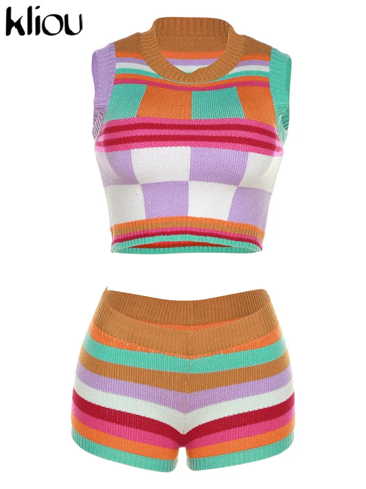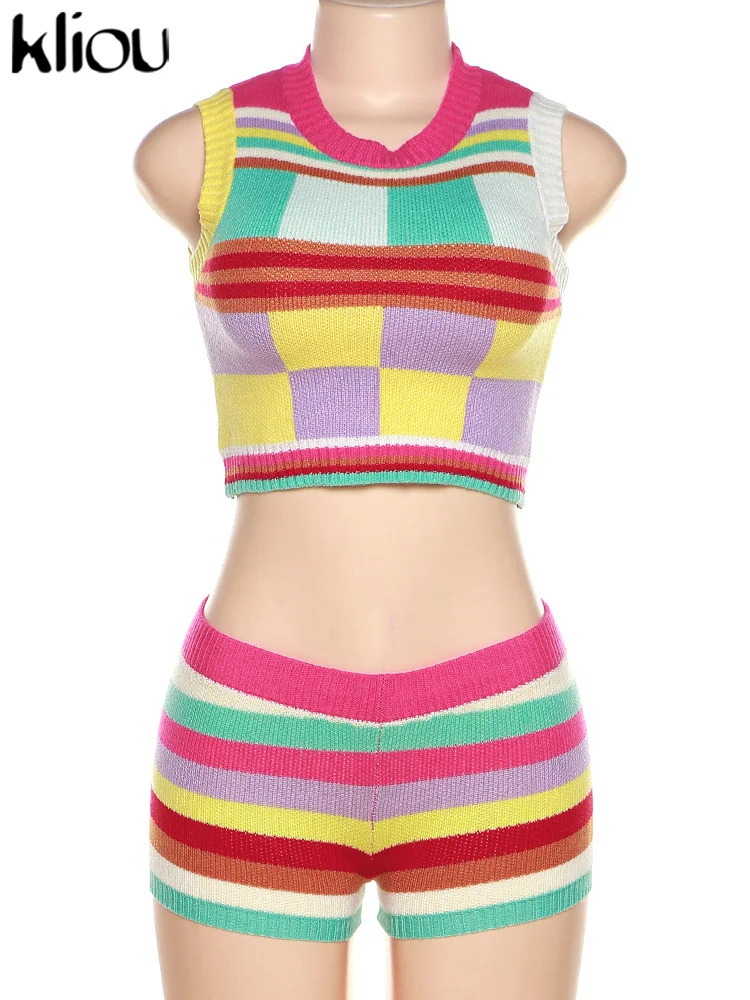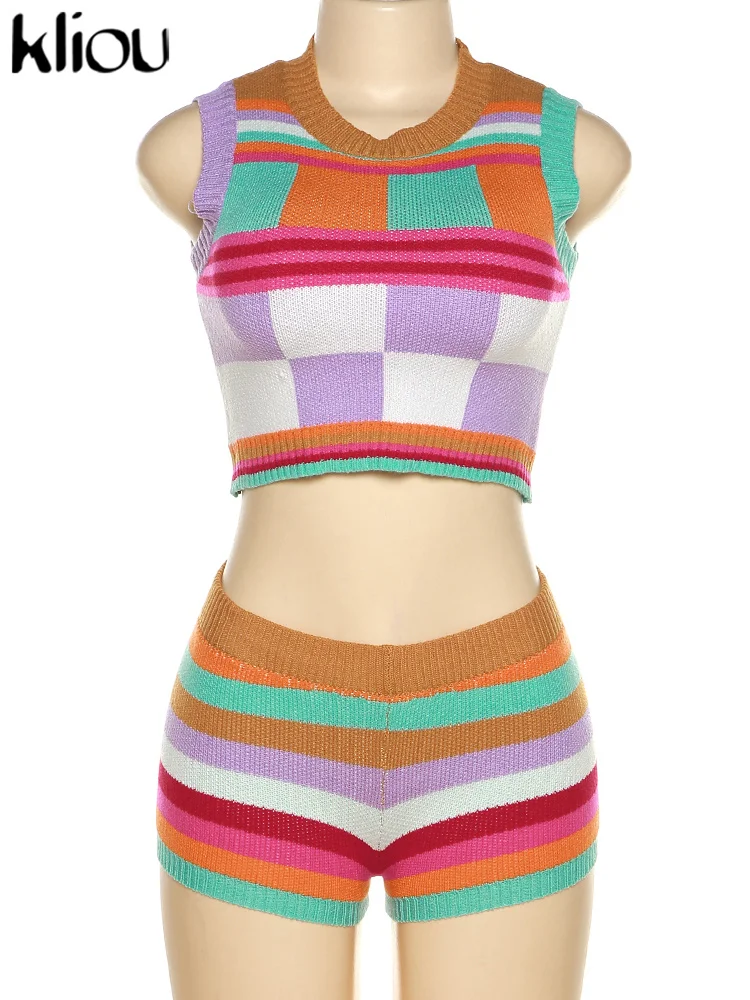 Kliou Knitted Multi-Color Stitching Shorts Two Piece Set Women Outfits Slim O-neck Tops Tank+Mini Pants Girl Casual Crochet Suit