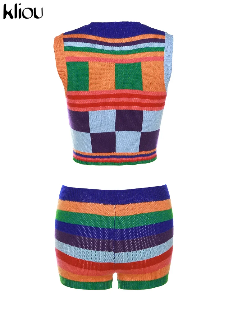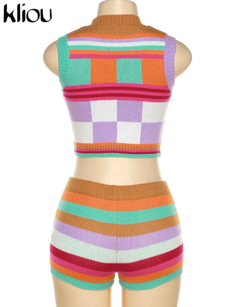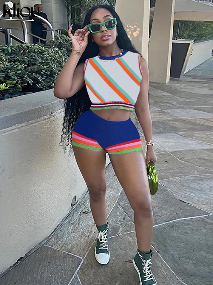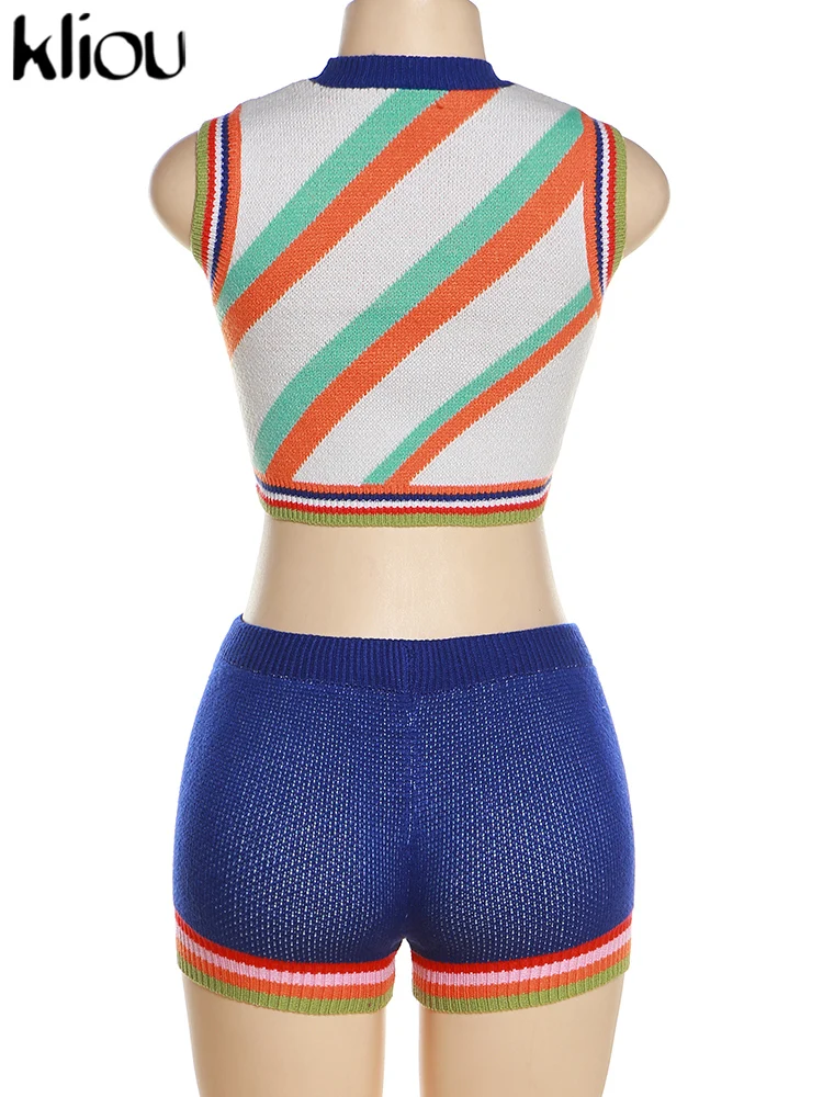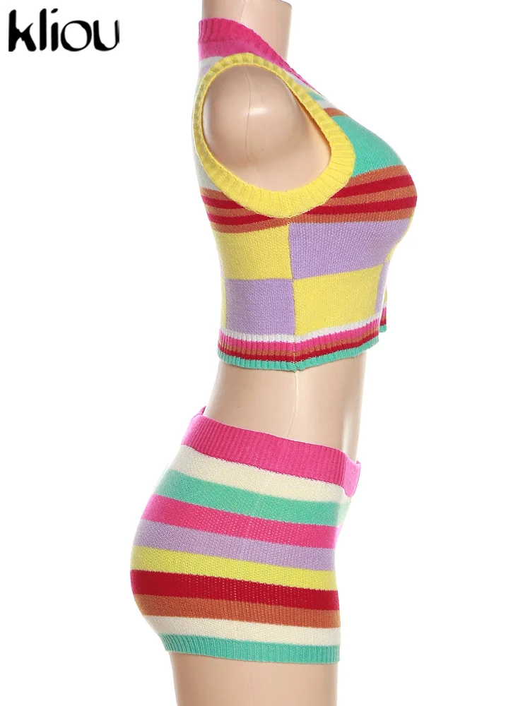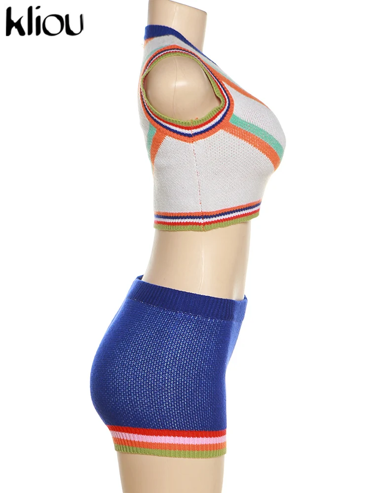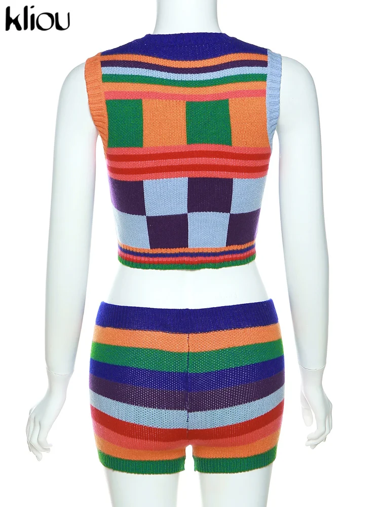 Kliou Knitted Multi-Color Stitching Shorts Two Piece Set Women Outfits Slim O-neck Tops Tank+Mini Pants Girl Casual Crochet Suit