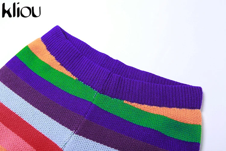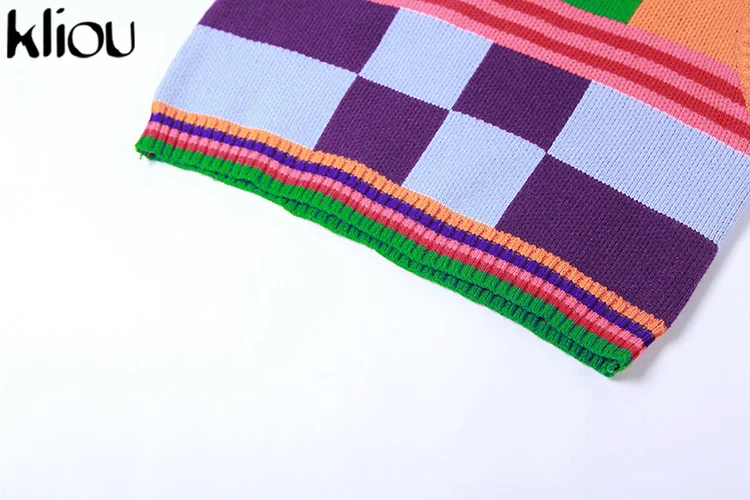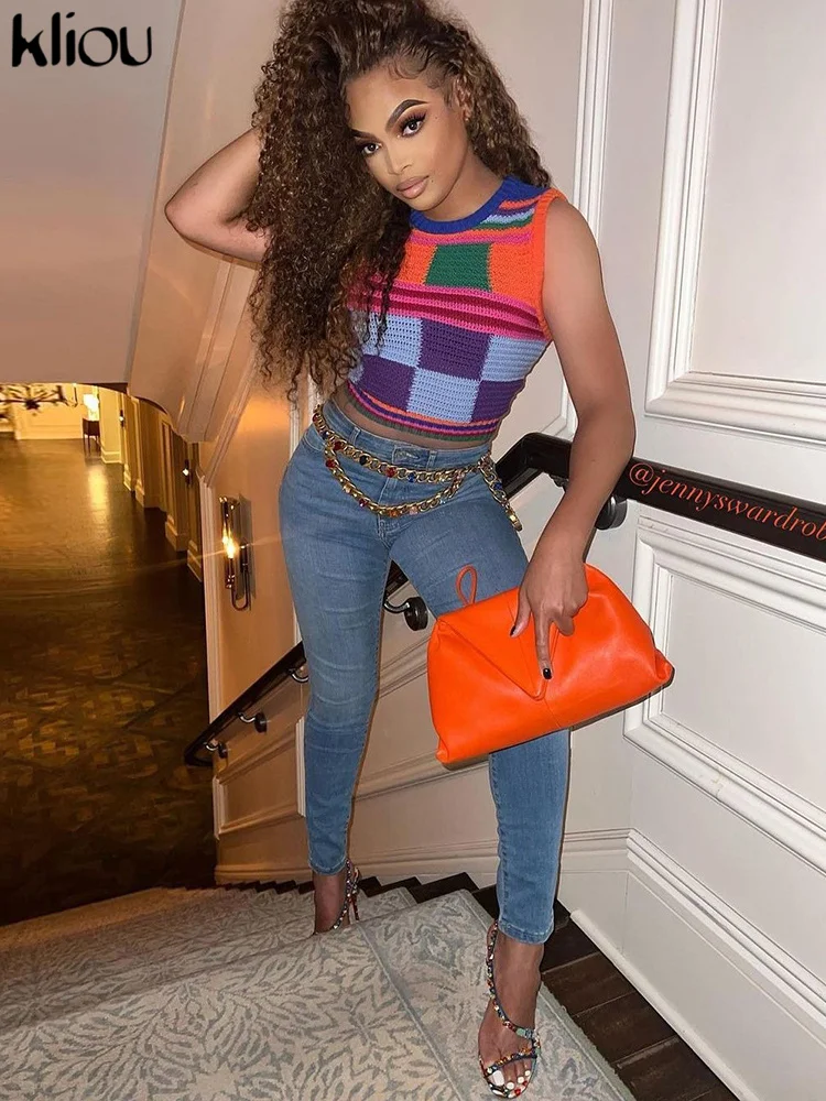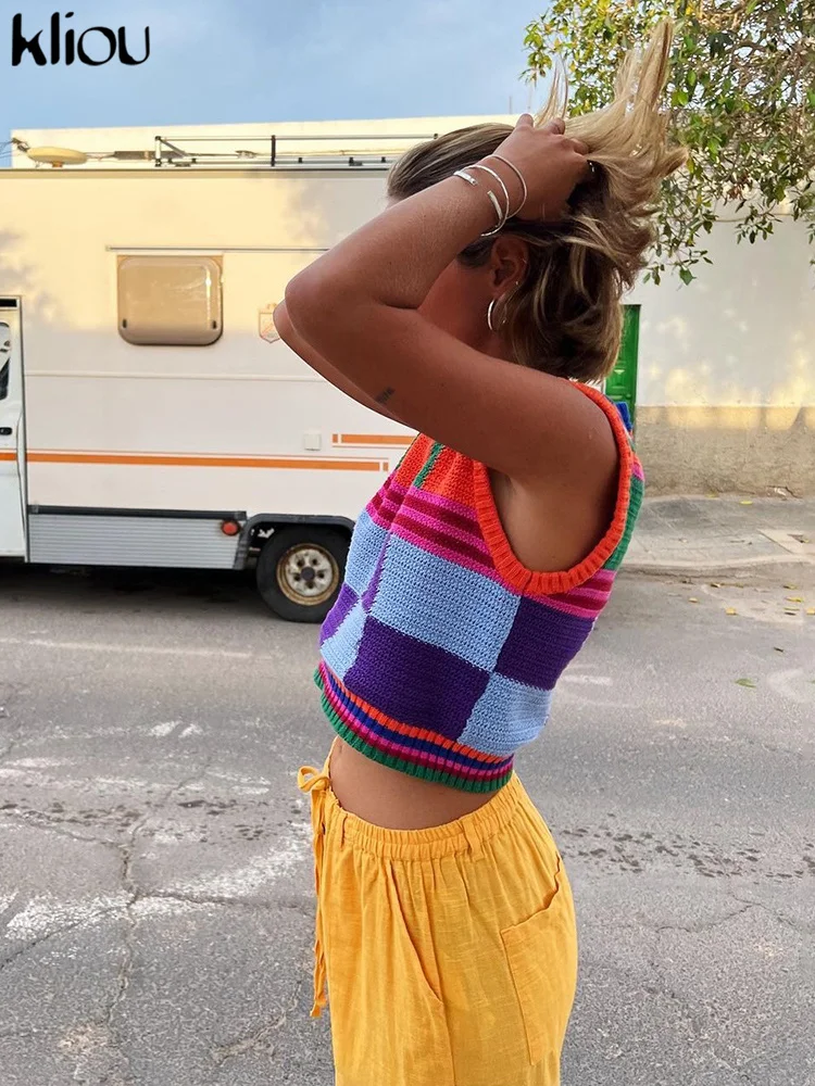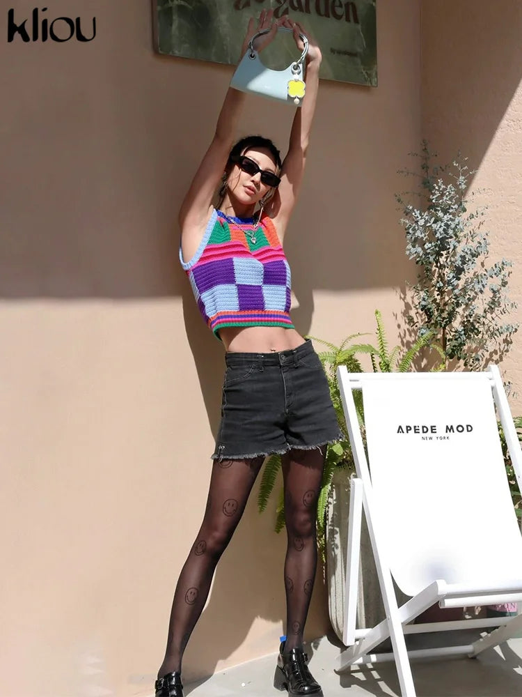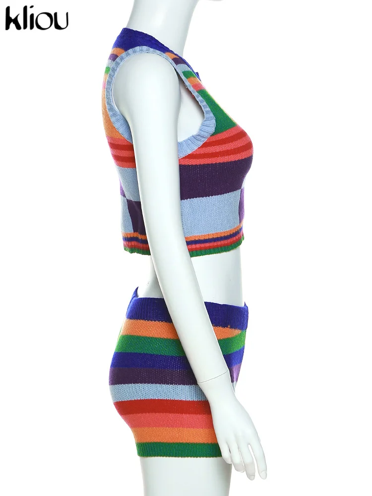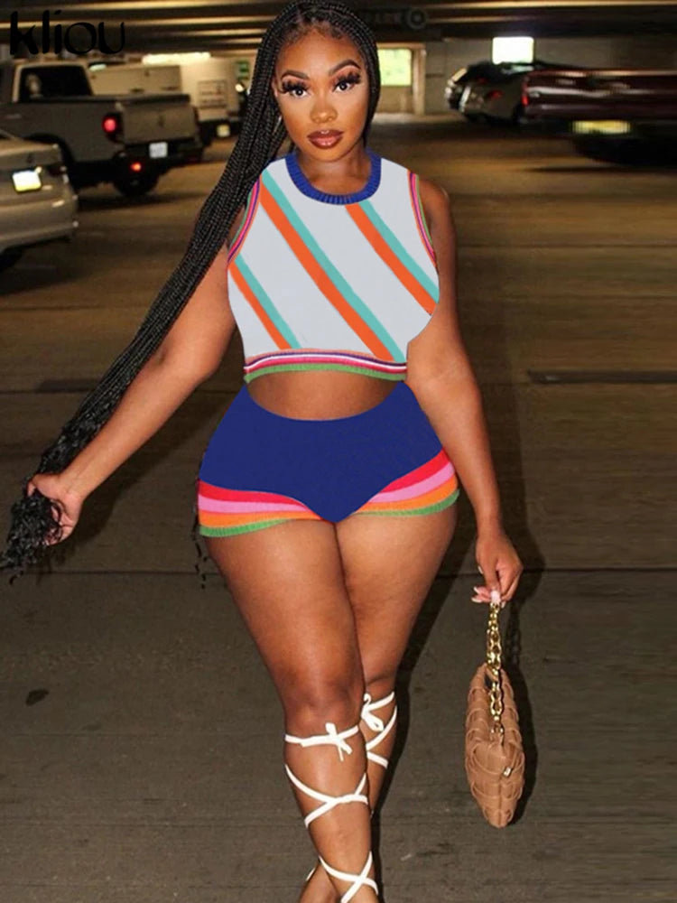 Kliou Knitted Multi-Color Stitching Shorts Two Piece Set Women Outfits Slim O-neck Tops Tank+Mini Pants Girl Casual Crochet Suit