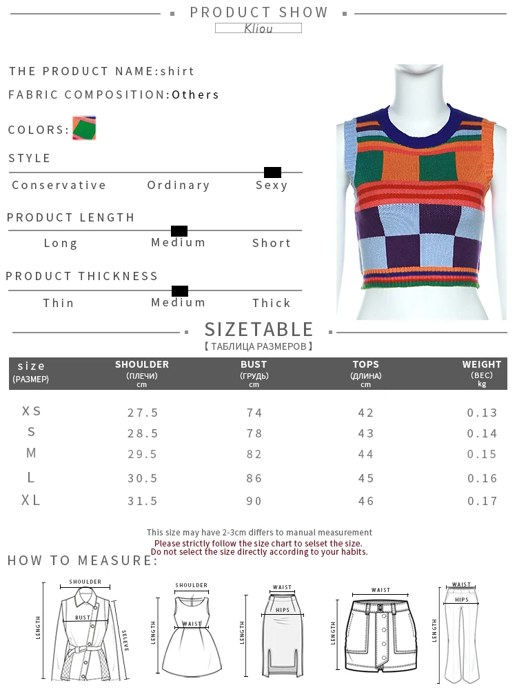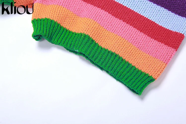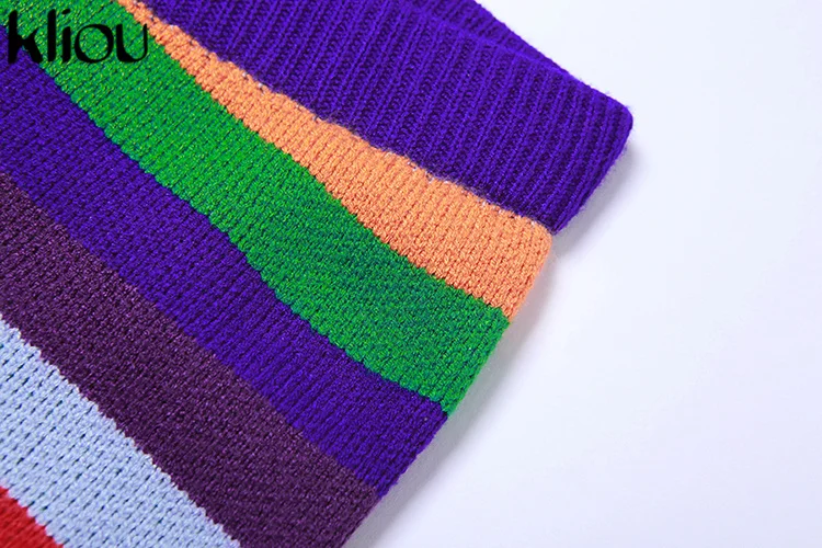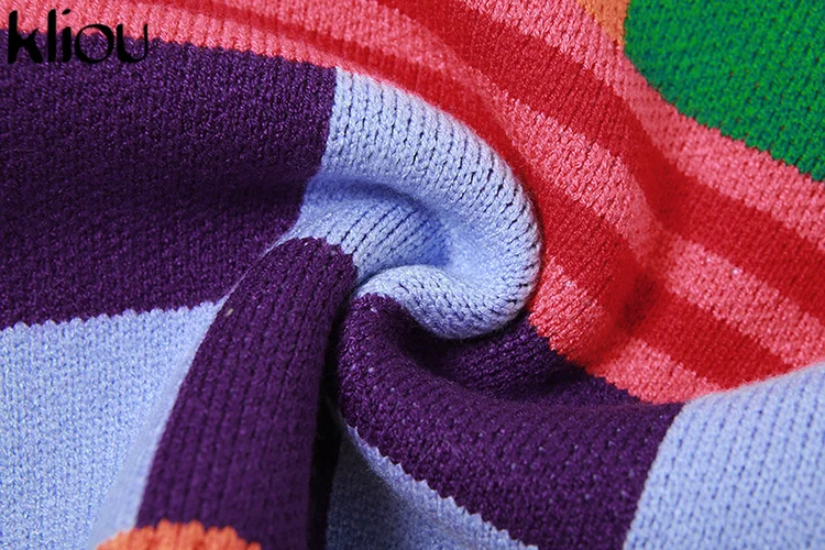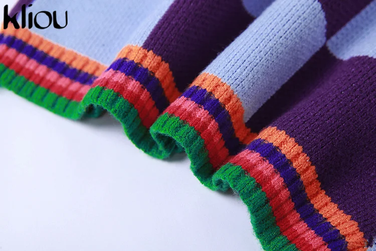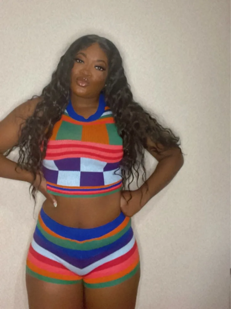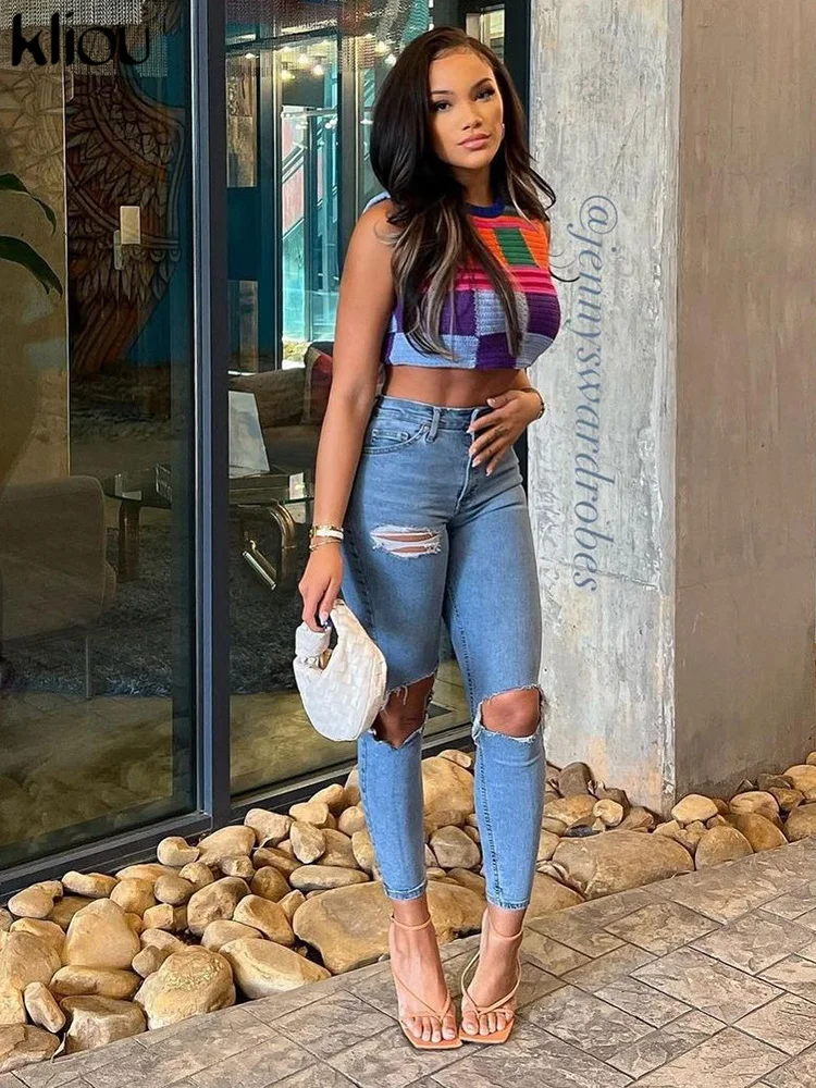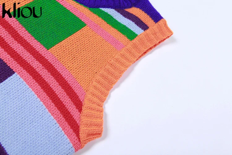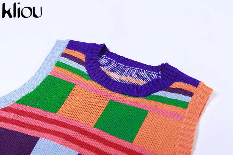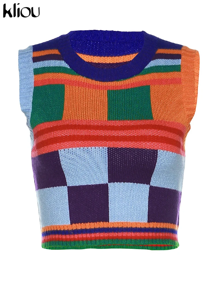 Kliou Knitted Multi-Color Stitching Shorts Two Piece Set Women Outfits Slim O-neck Tops Tank+Mini Pants Girl Casual Crochet Suit