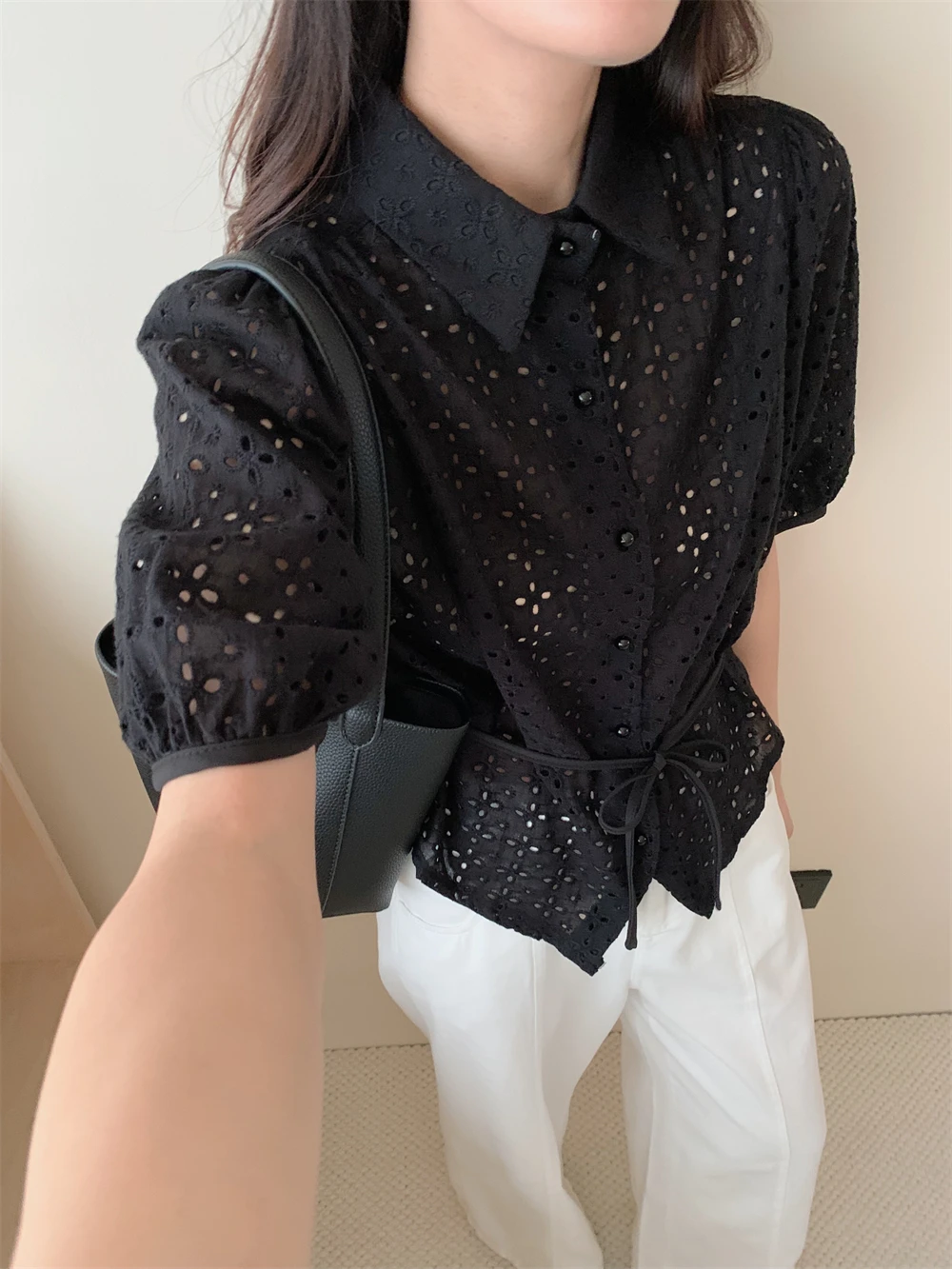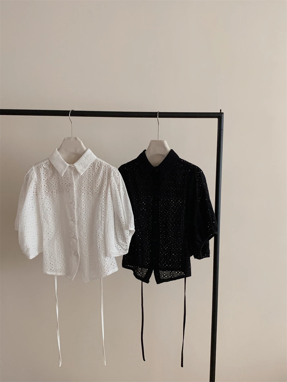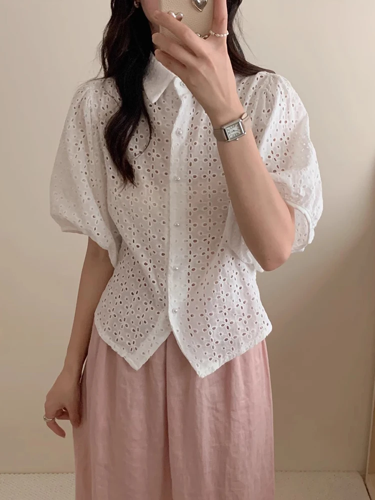 Korejpaa Korean Fashion Woman Shirt Vintage Clothes 2025 Spring Turn-down Collar Hollow Out Embroidery Jacquard White Shirts