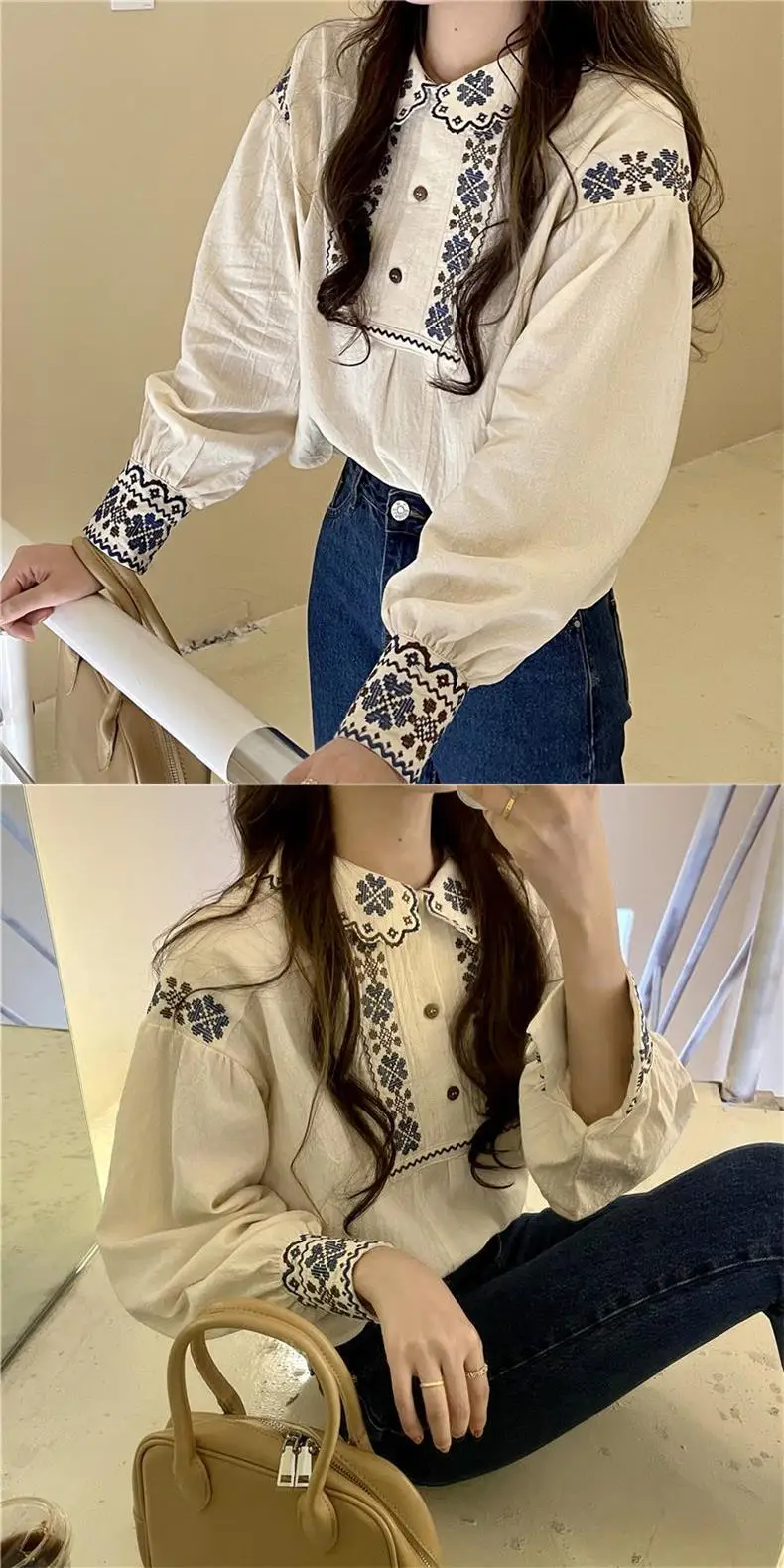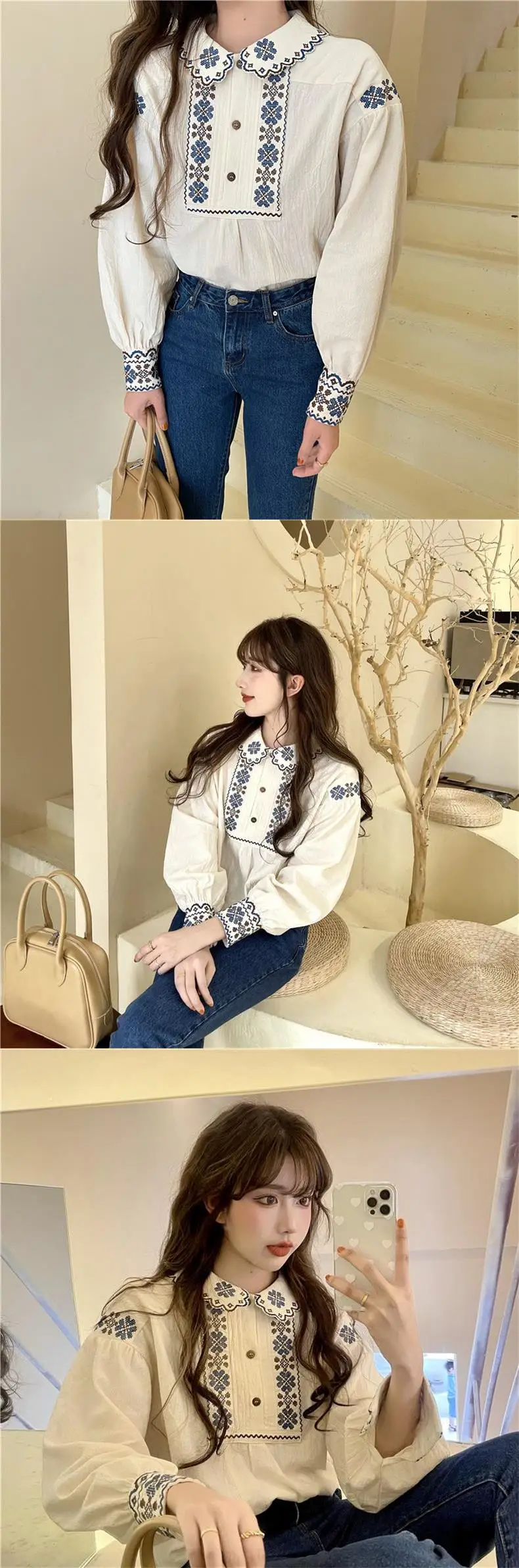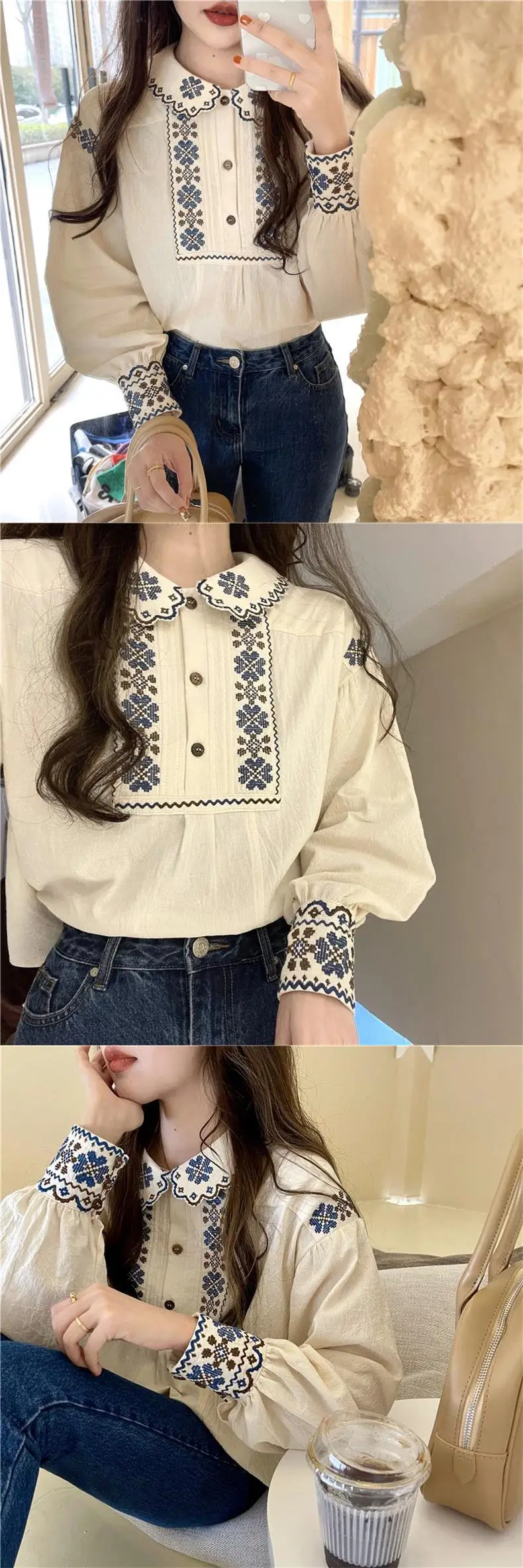 Korobov Vintage Autumn Shirts Embroidery Lapel Long-sleeved Blouses Female Camisas Puffed Sleeve Doll Collar Top Korean Fashion