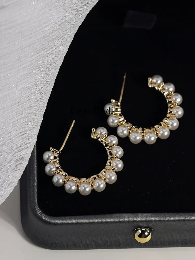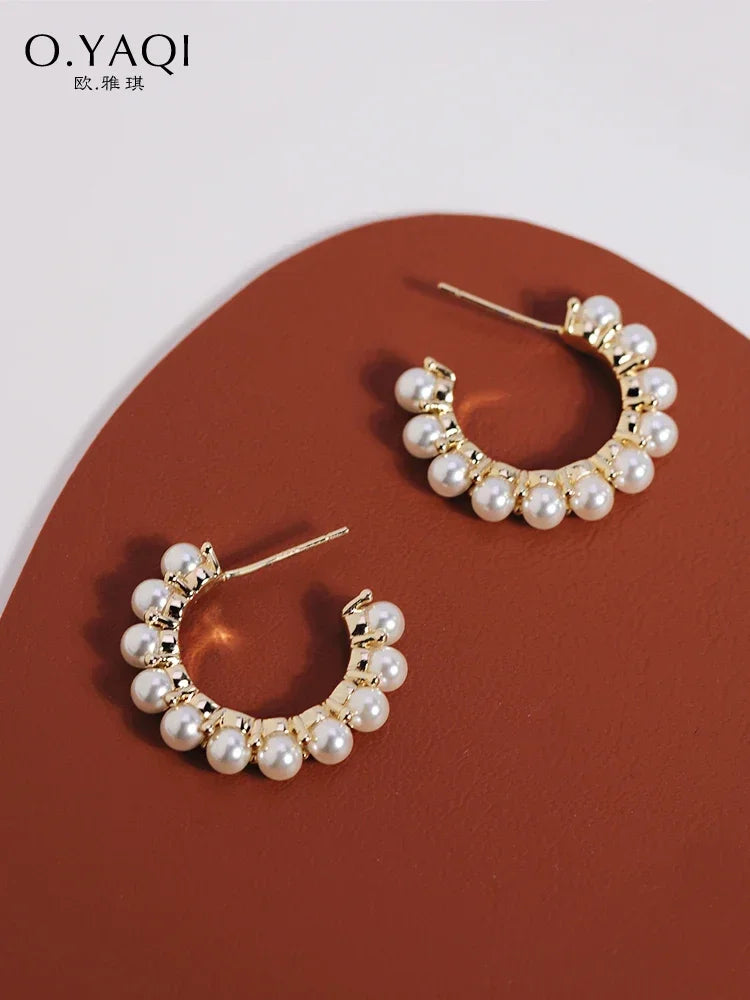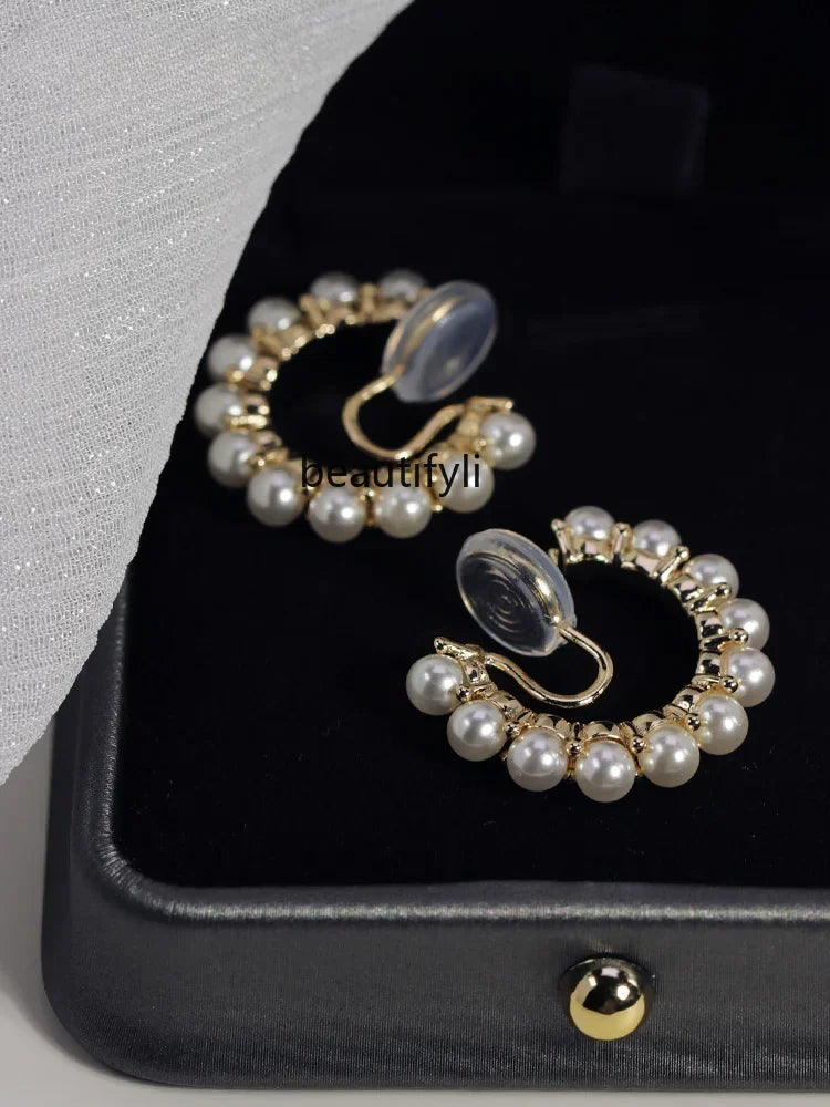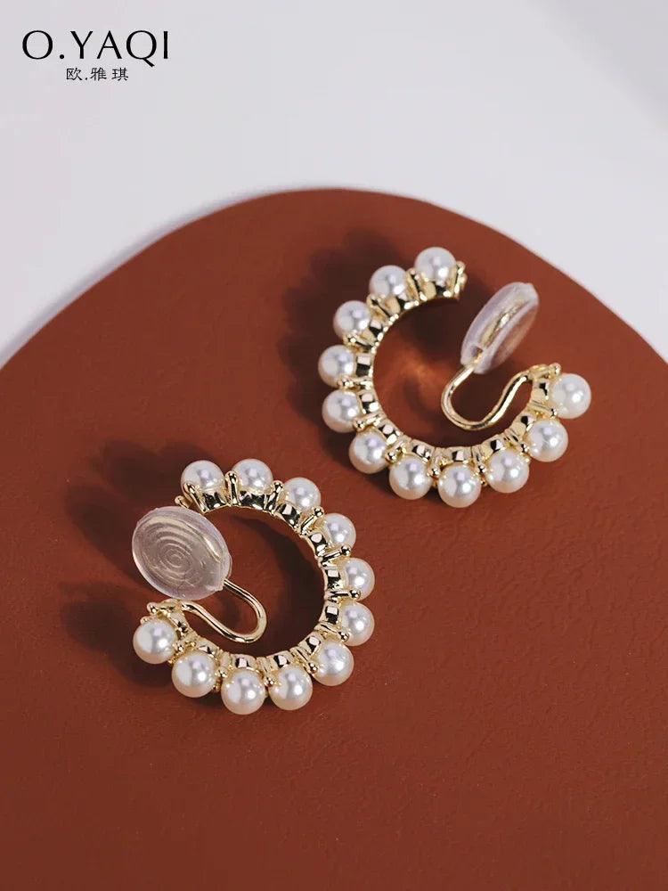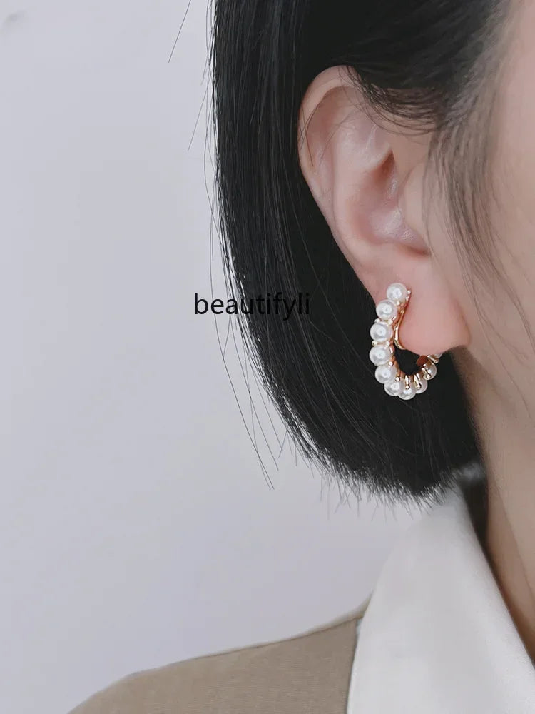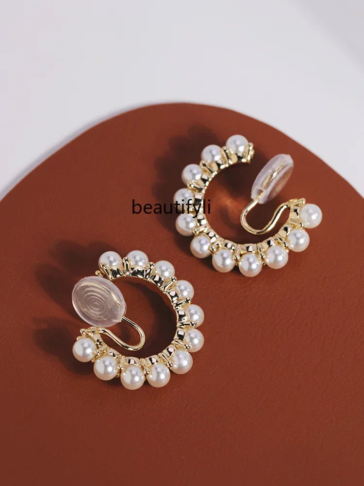 L11 yj Elegant Pearl C- Shaped Ear Clip Gentle High-Grade Silver Needle Ear Studs without Pierced Female Circle Earrings