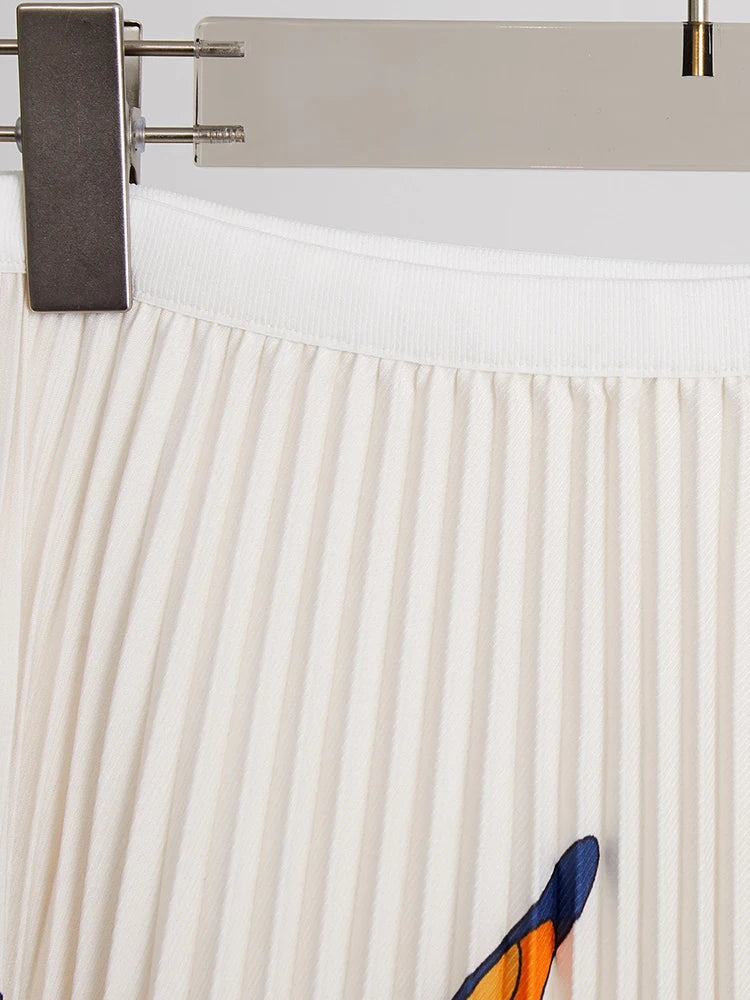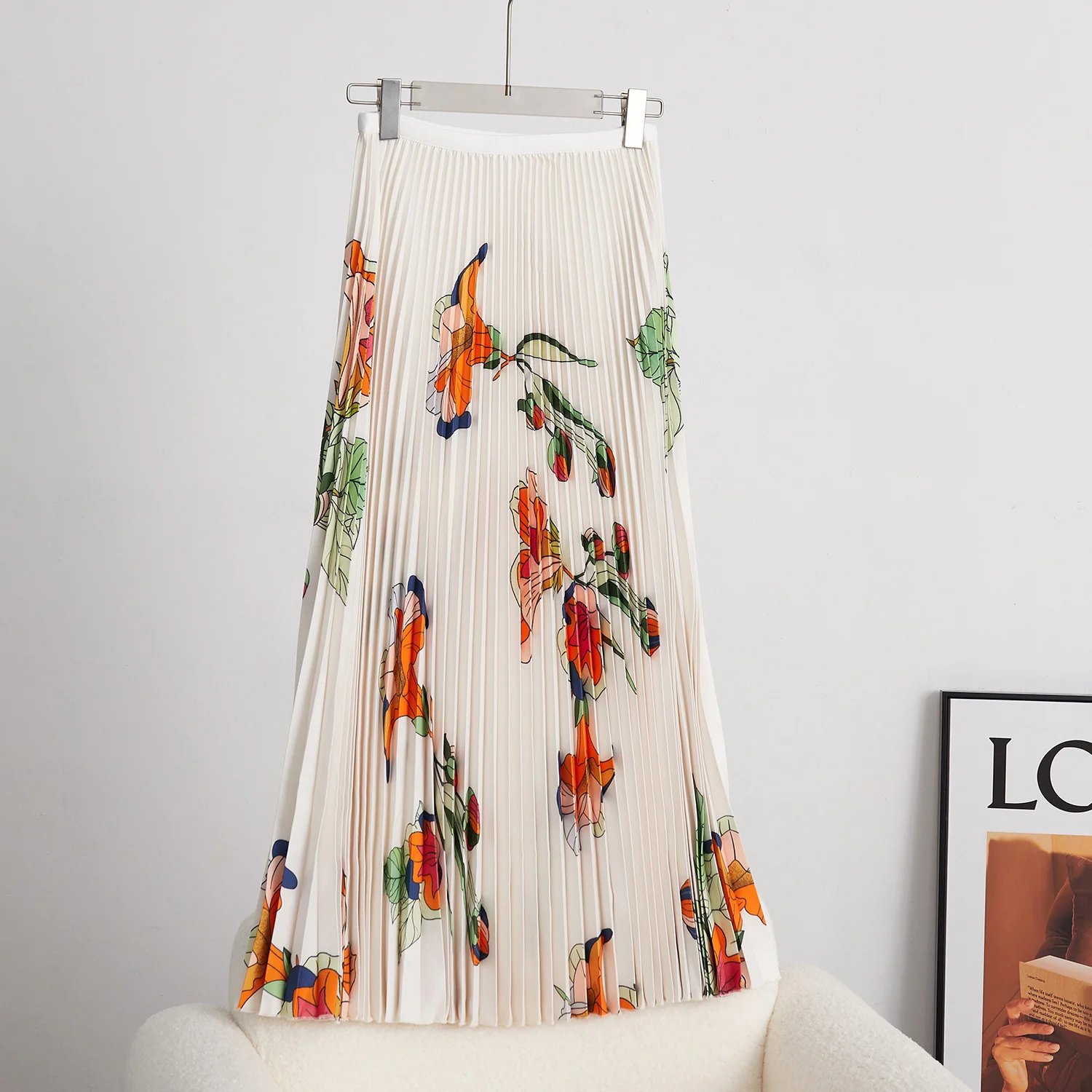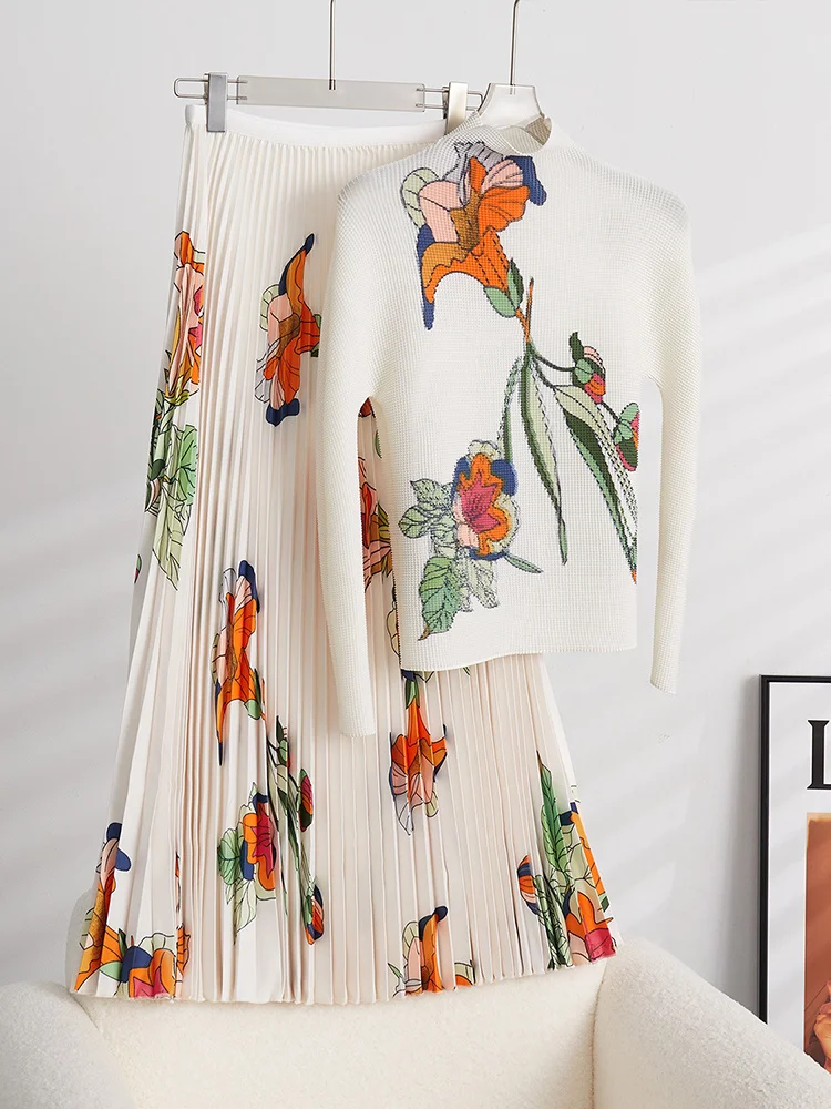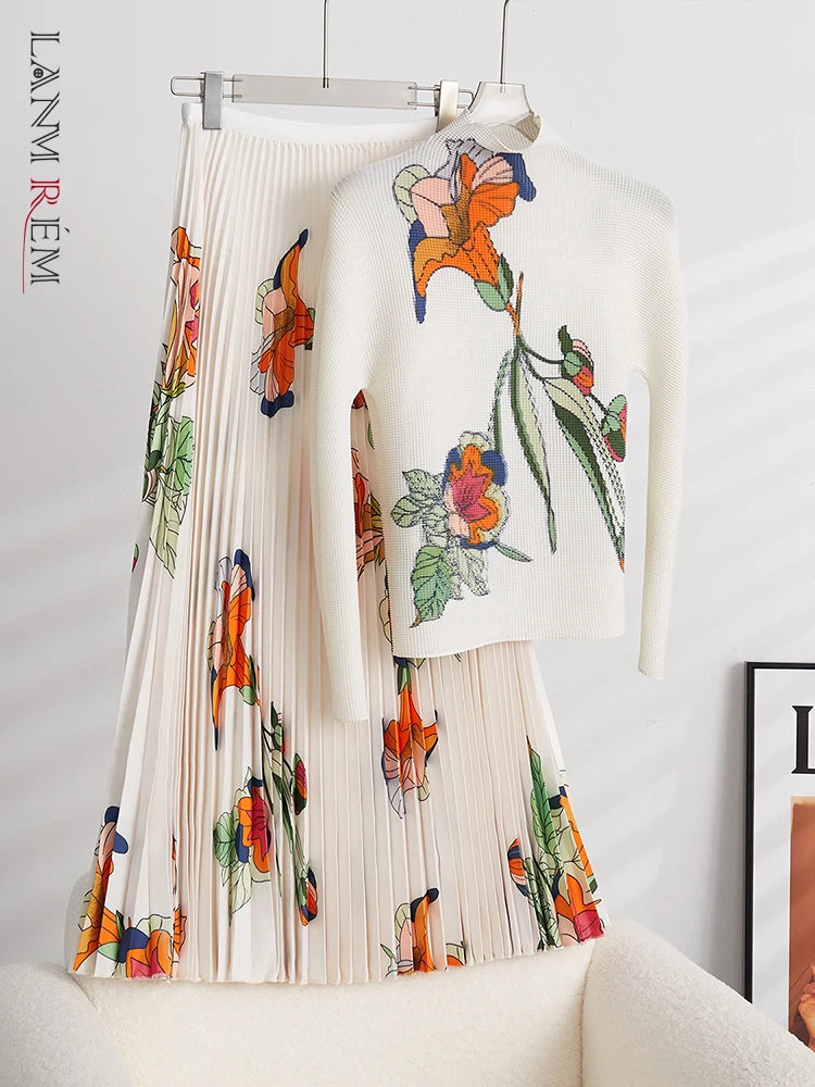 LANMREM Printed New 2 Pieces Skirt Set O-neck Long Sleeves Slim Tops High Elastic Waist Loose Skirts Female Clothes 2024 2YA758
