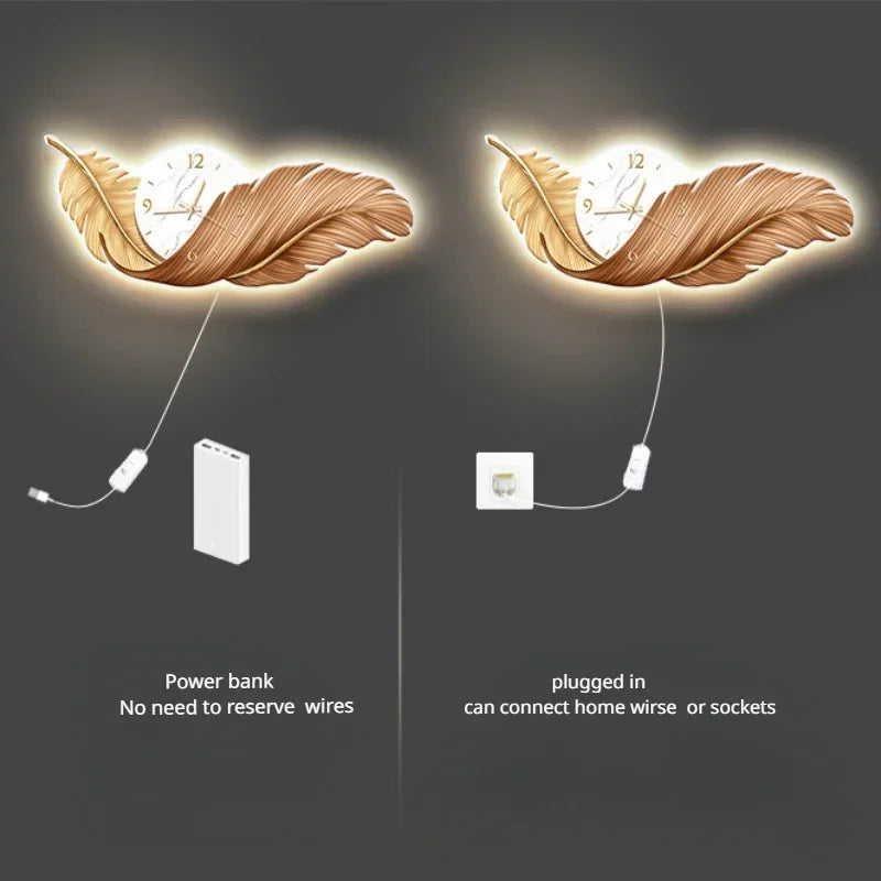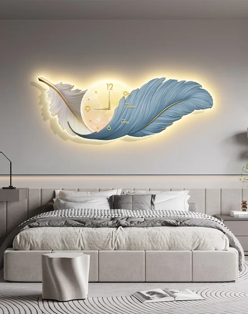 LED Wall Clock Light Luxury Large Art Clocks Living Room Decor Painting Wall Watch Feather Silent Clock Renoj Home Decoration