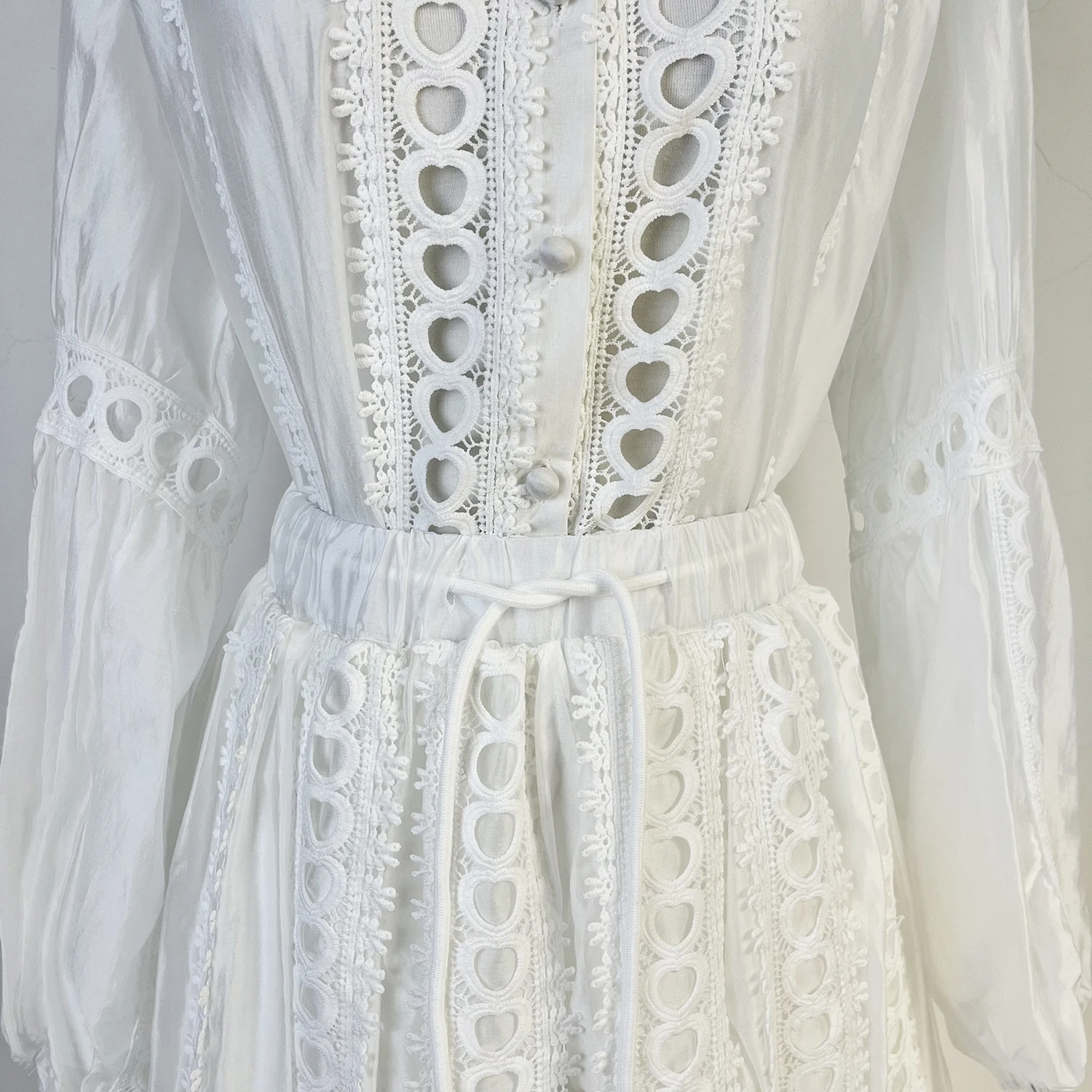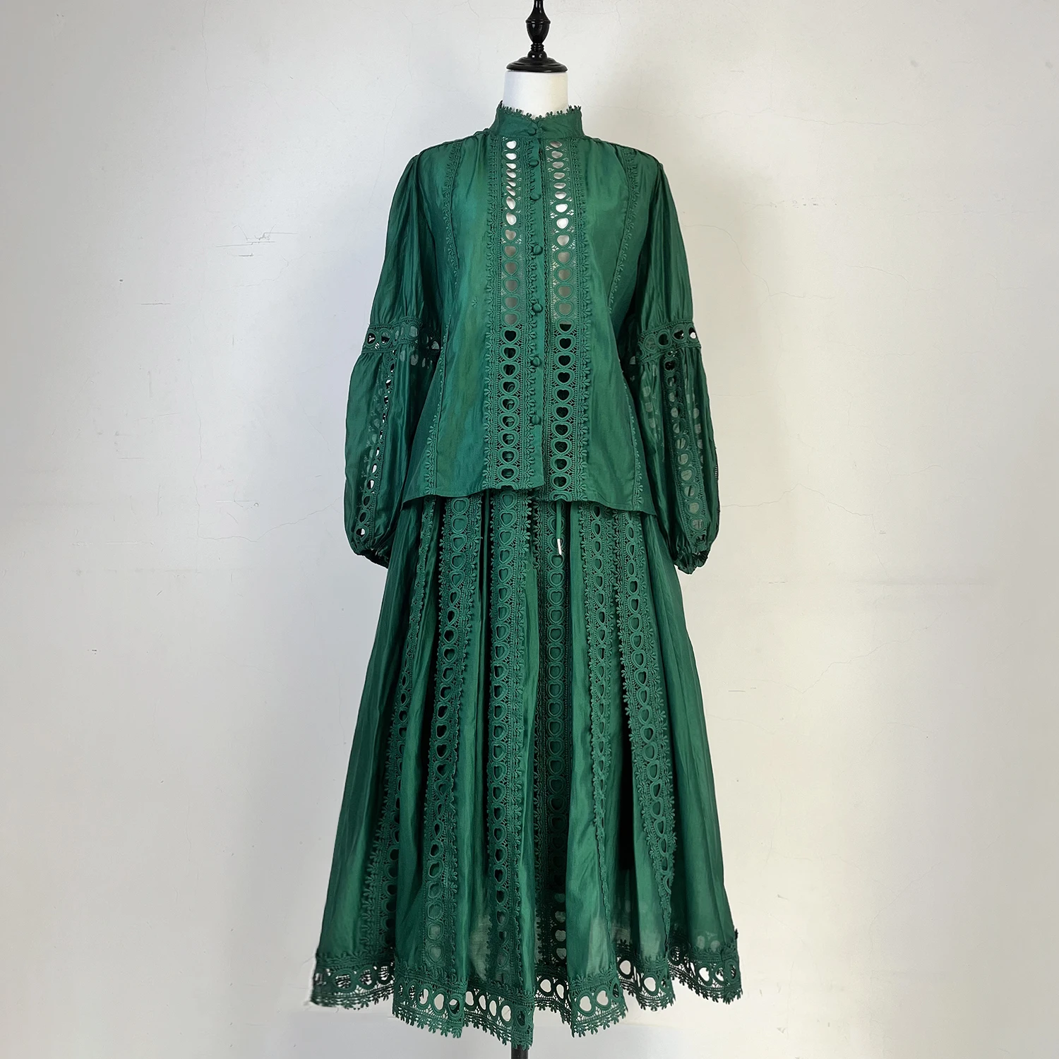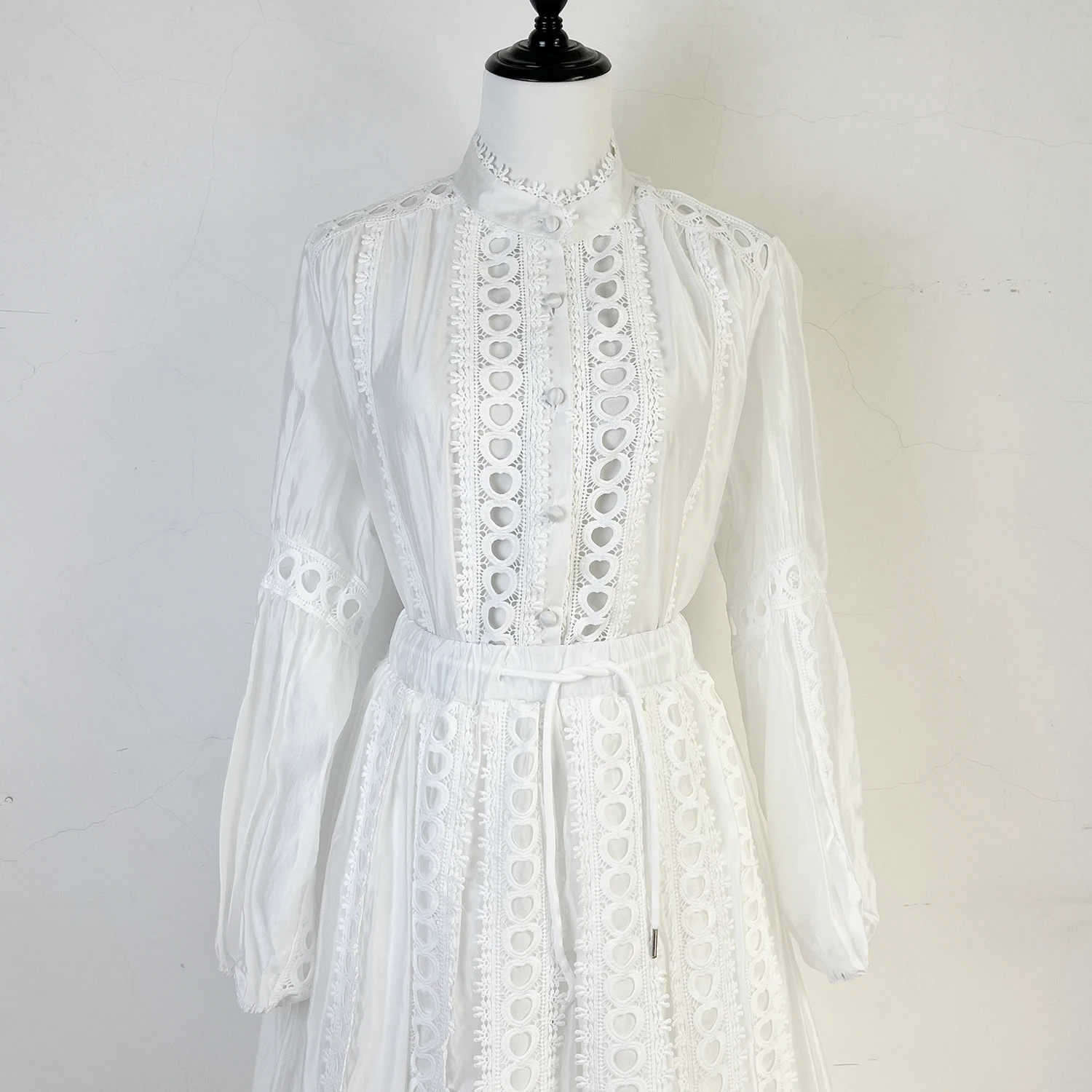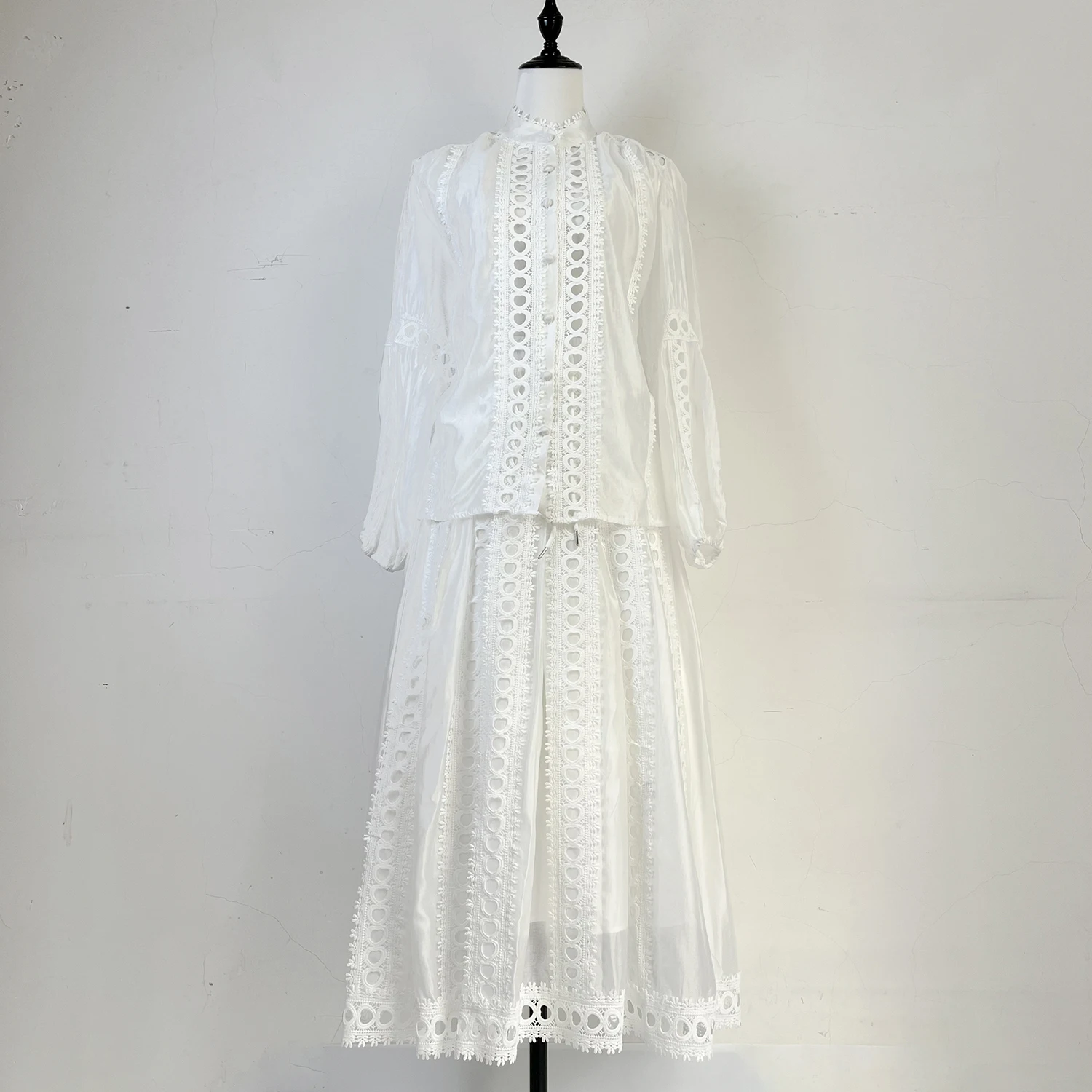 Luxury Long Dresses 2 Piece Sets Women Lace Hollow Out Embroidered Shirt + Maxi Skirts Suits Big Size 2025 Spring Party Vestidos