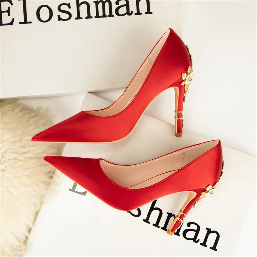 Luxury Metal Flowers Heel Crystal Bridal Shoes For Women Pointed Soft Silk Dress Shoe Shallow Sexy High Heels Pumps Female Party