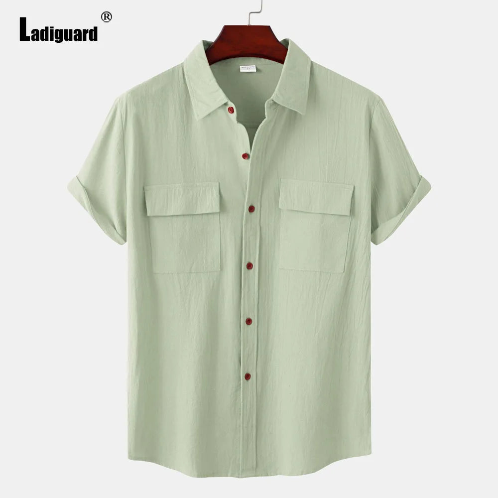 Men Short Sleeve Linen Shirts ,Black Soft Blouse Vintage Casual Stand Pocket Tops mon