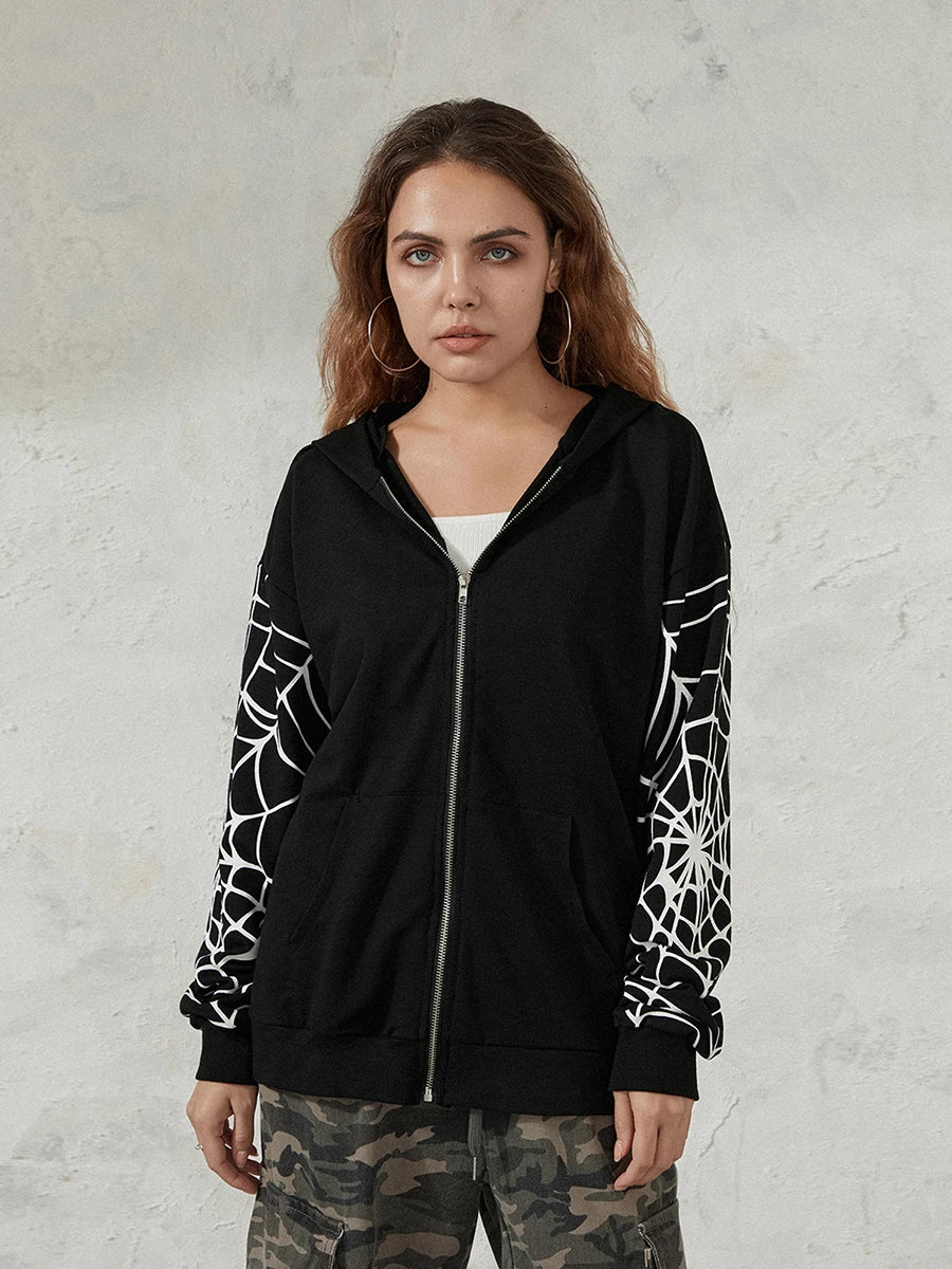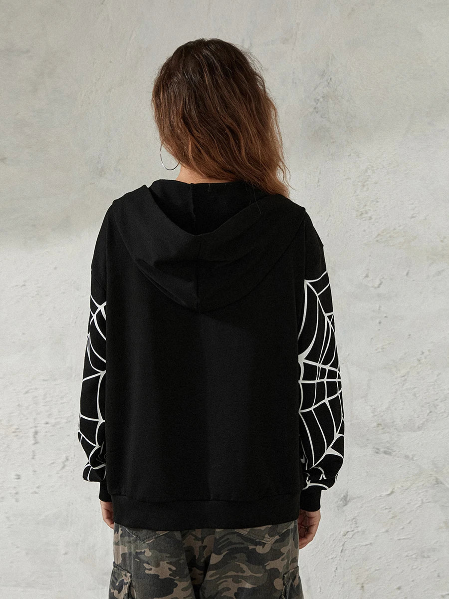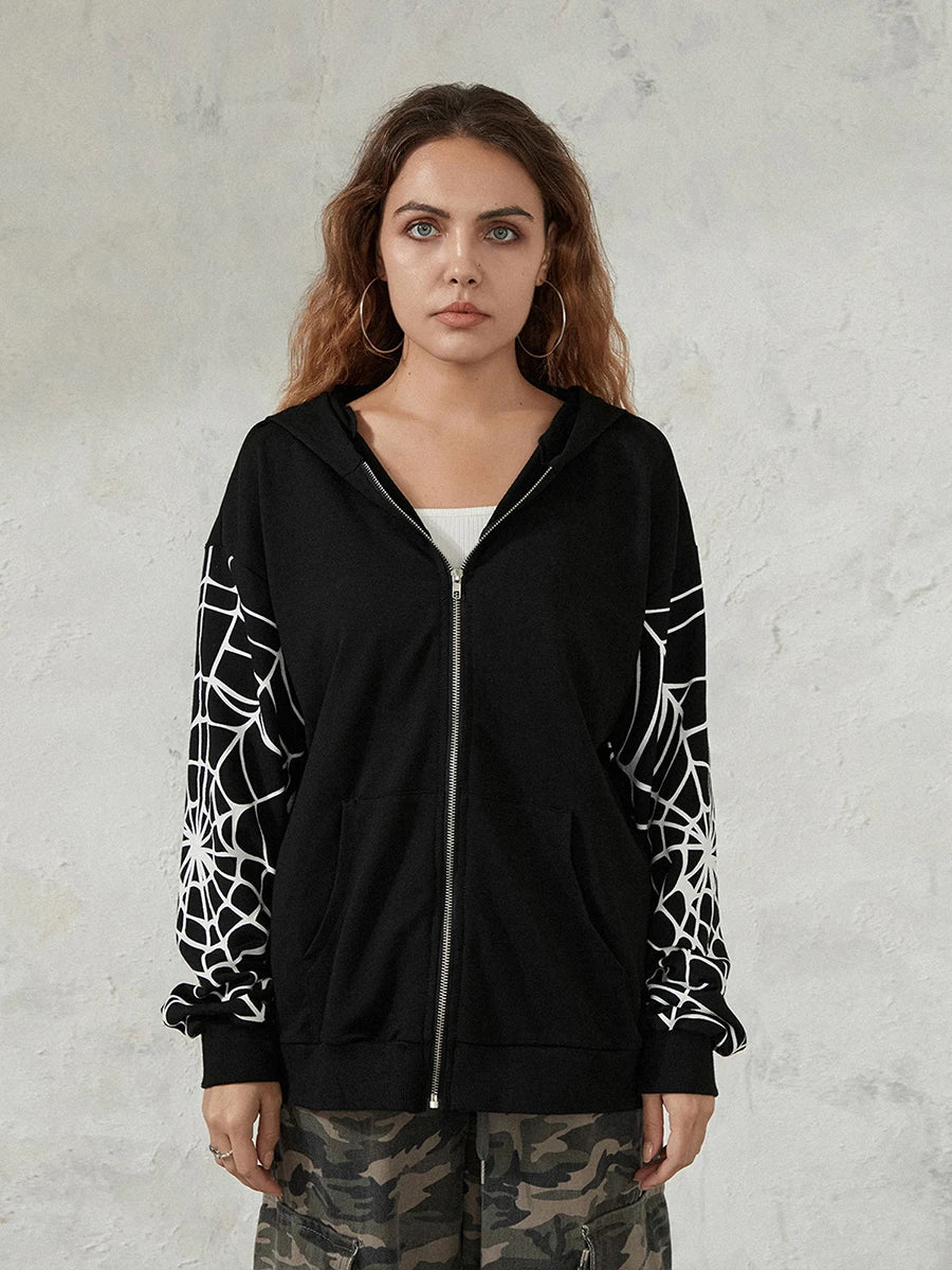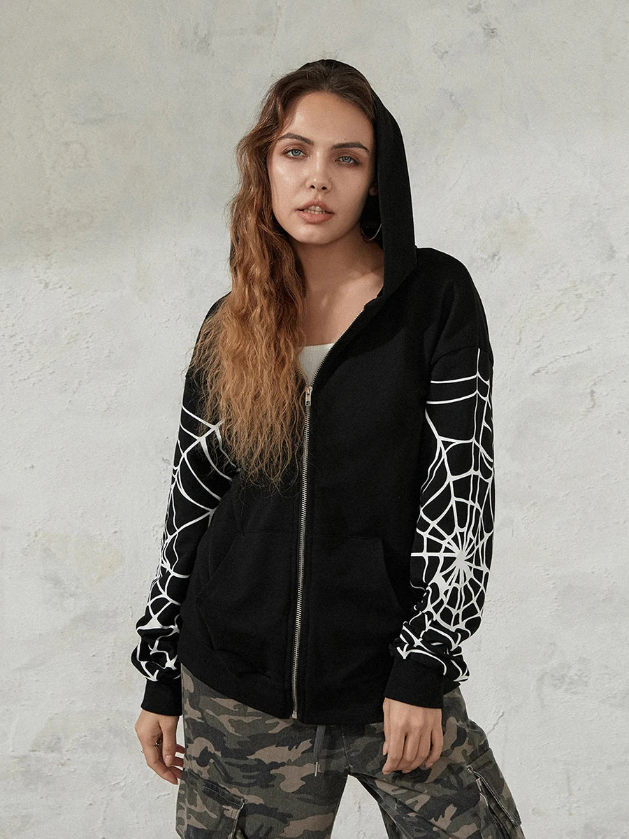Men Women Zip Up Hoodies Fashion Spider Web Print Long Sleeve Oversized Sweatshirts Streetwear Tops