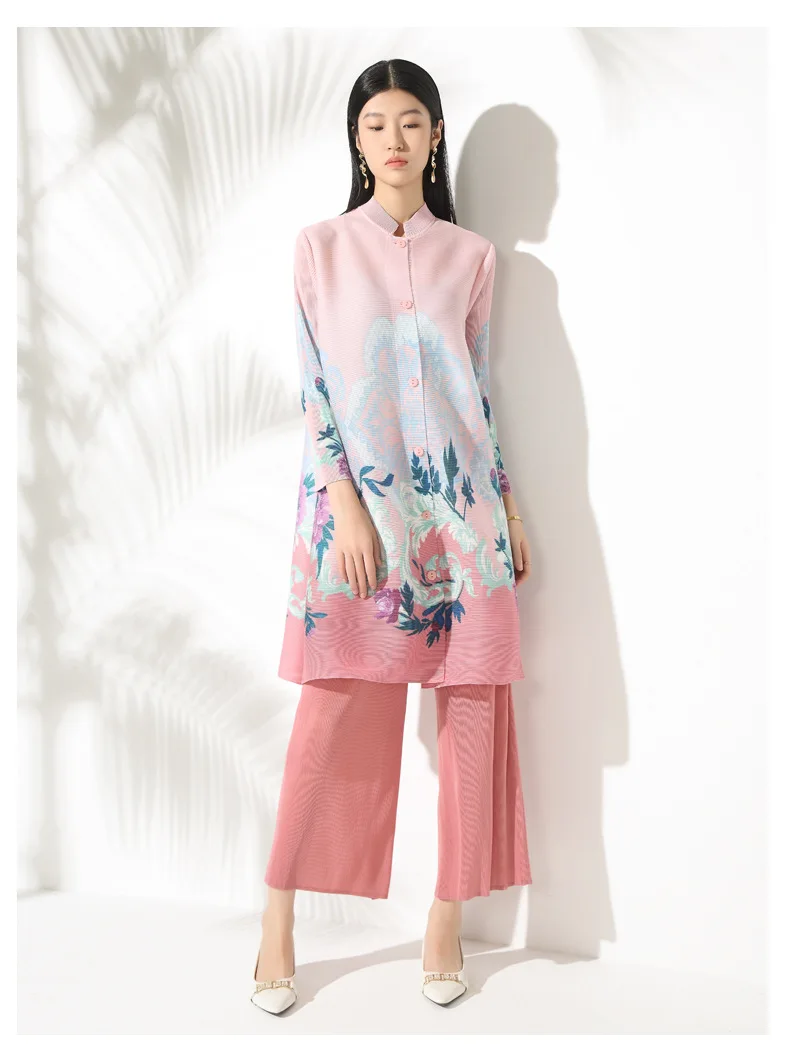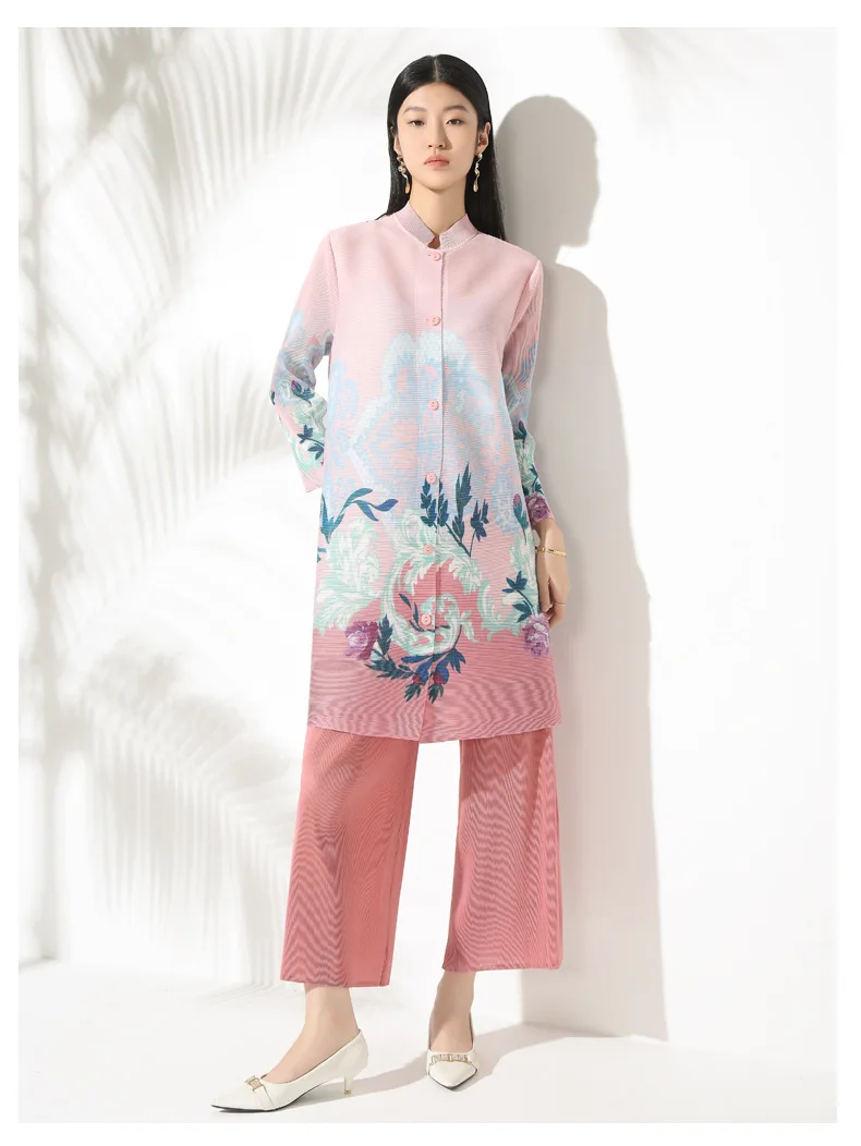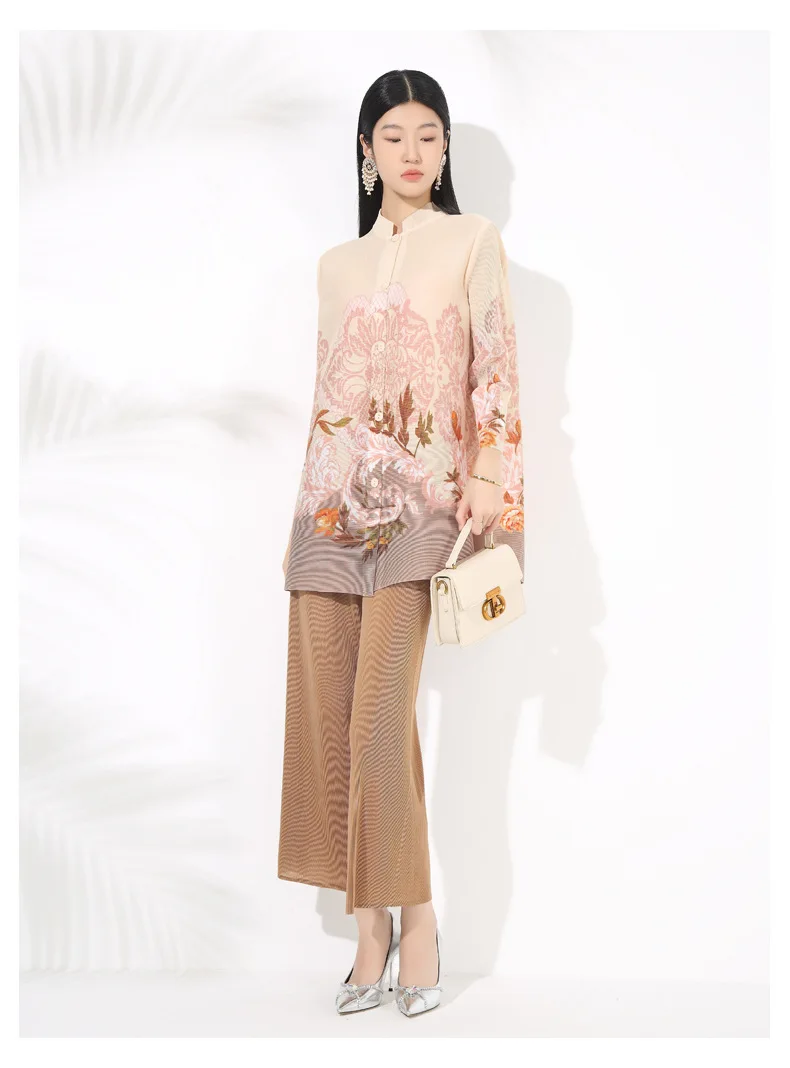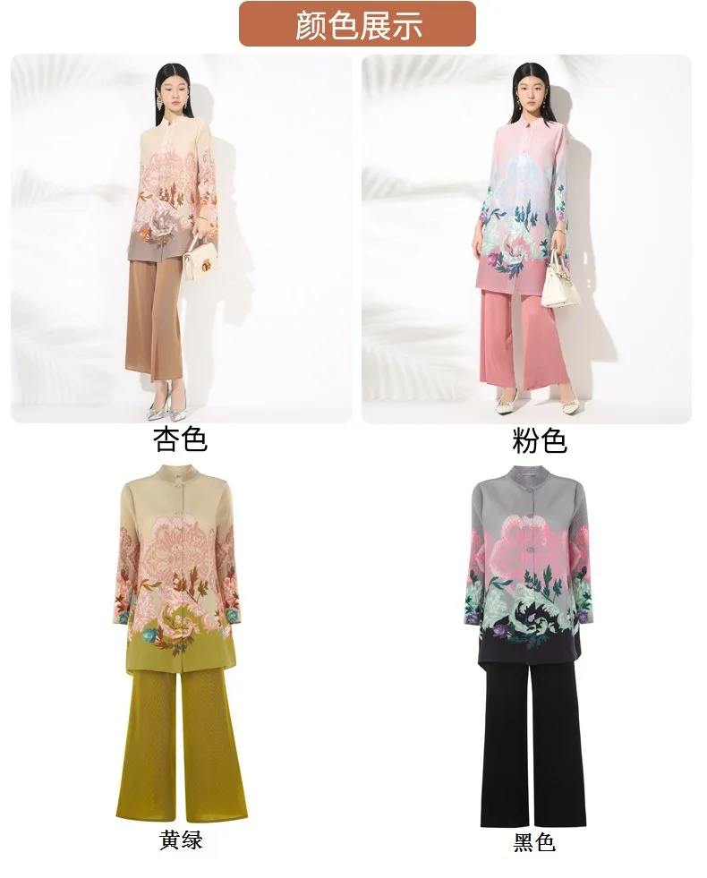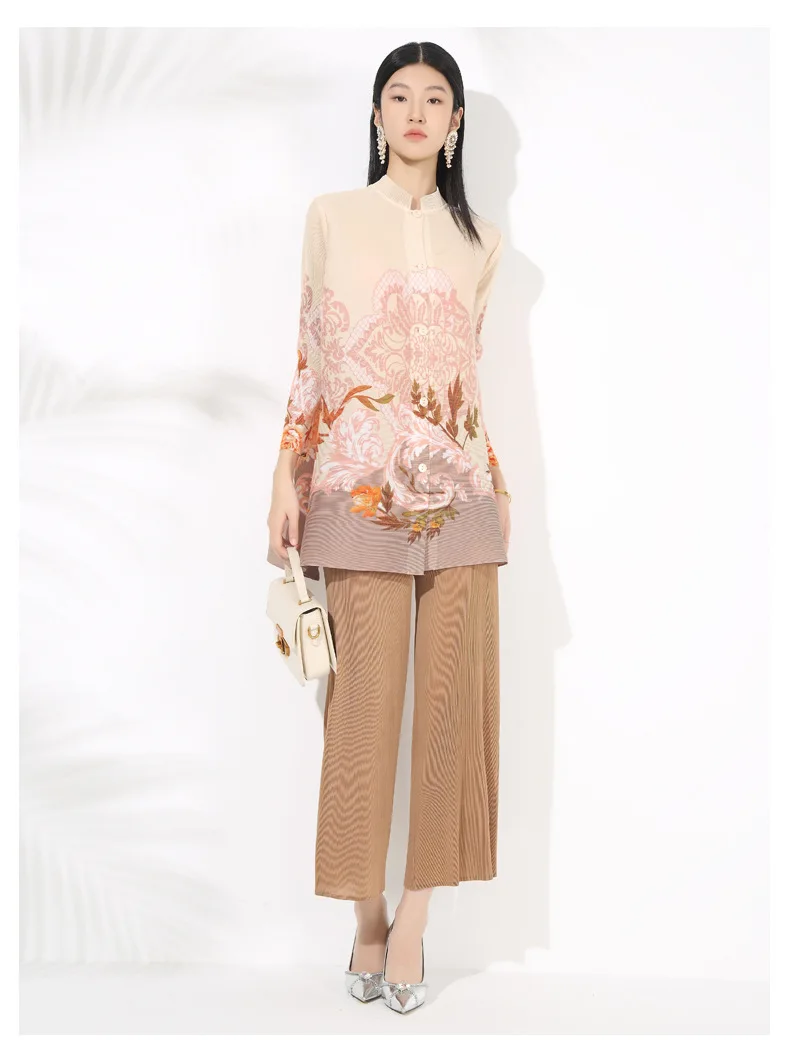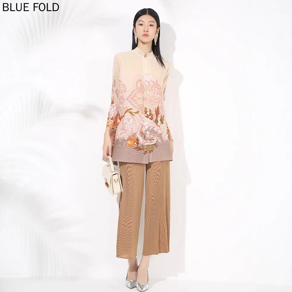 MIYAKE Women's PLEATS Print Casual Suit 2025 Spring New Fashion Stand Collar Midi Top Wide-Leg Pants Two-Piece Set Women Clothes