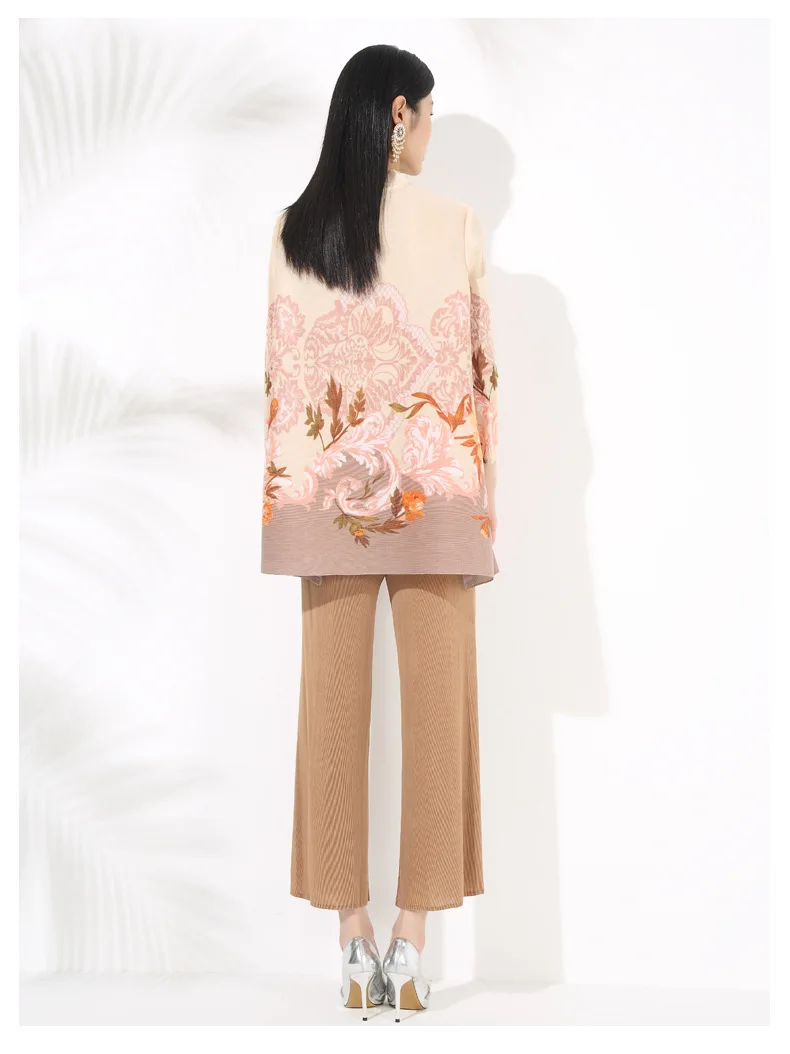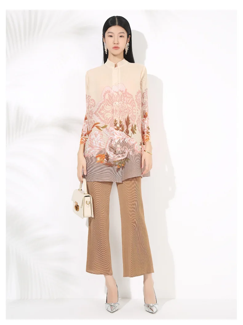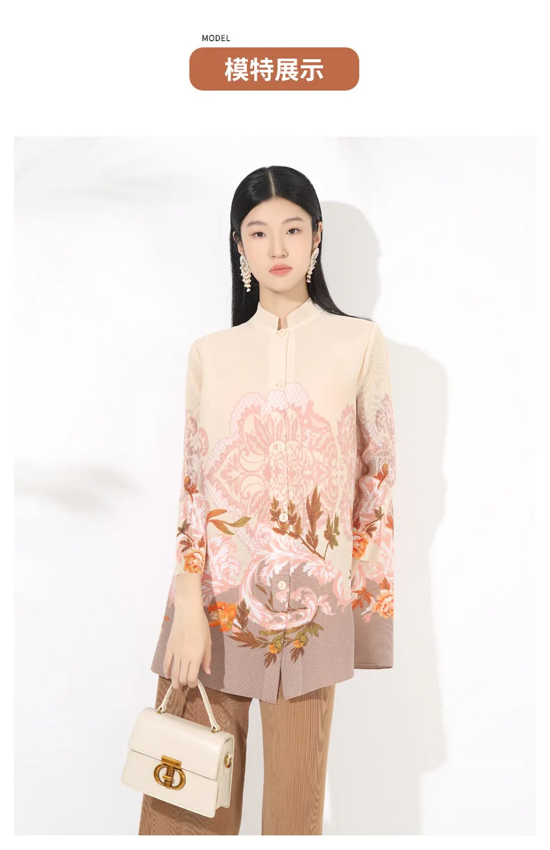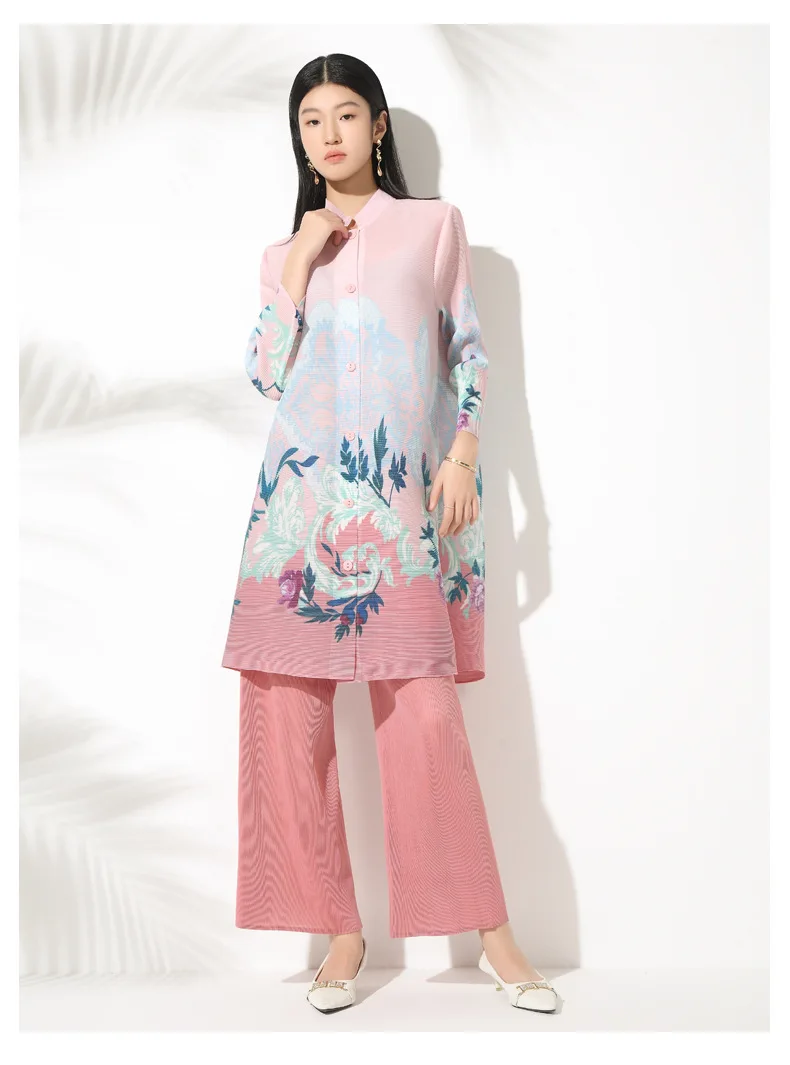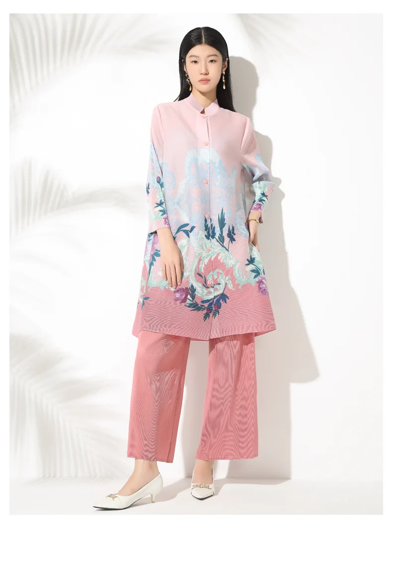MIYAKE Women's PLEATS Print Casual Suit 2025 Spring New Fashion Stand Collar Midi Top Wide-Leg Pants Two-Piece Set Women Clothes
