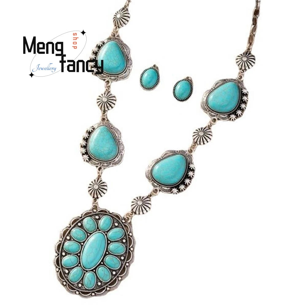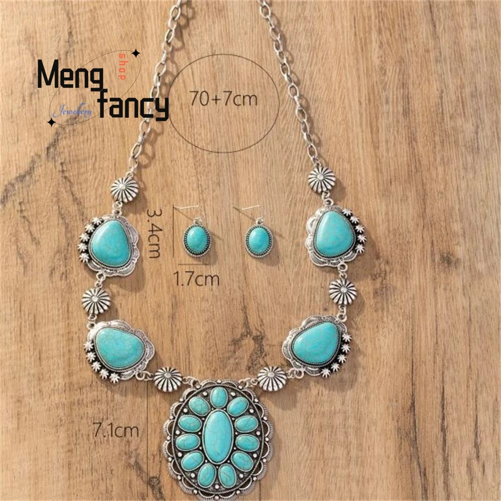 Natural Tibetan Silver Inlay Retro Turquoise Necklace Pendant Earrings Western Style Exaggerated High-grade Fashion Fine Jewelry