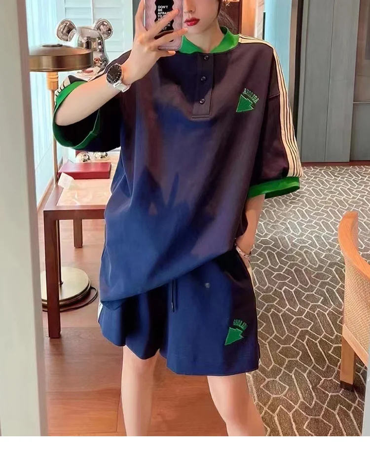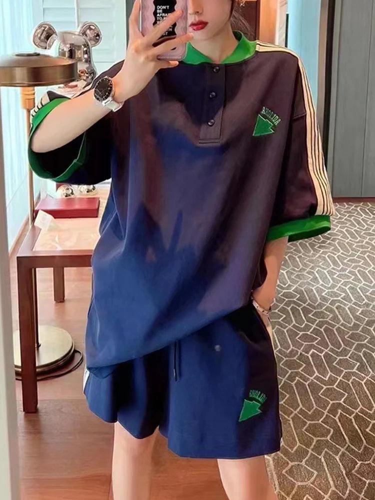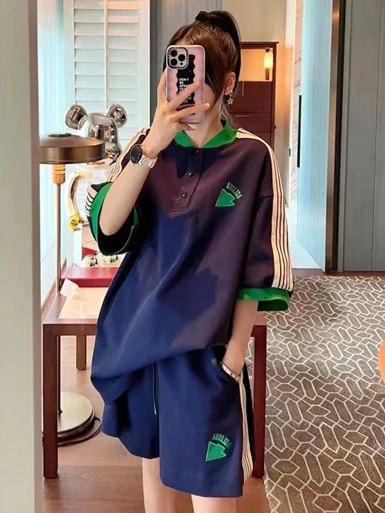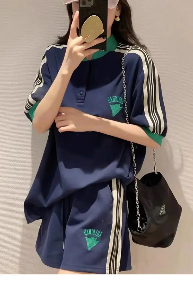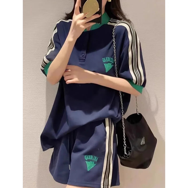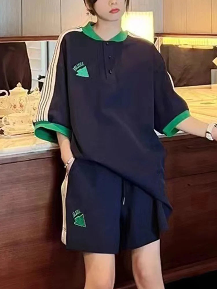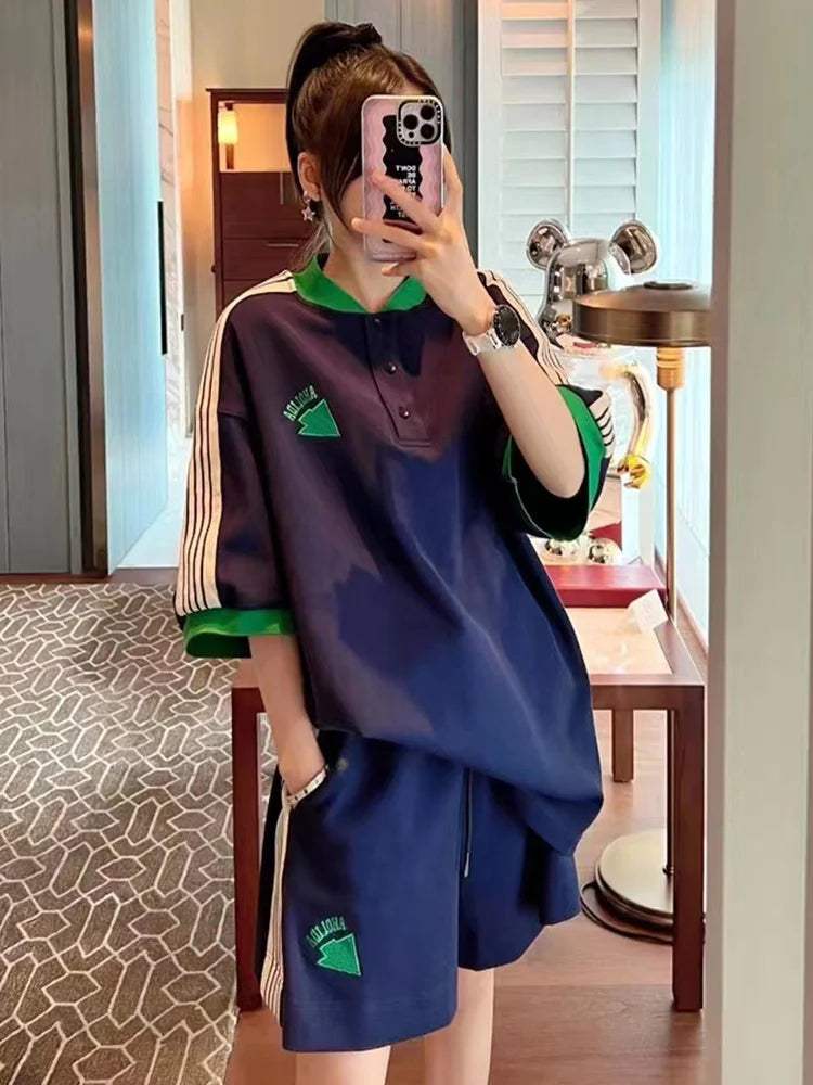 Navy Loose Side Patch Streetwear Tracksuit Summer Shirts Shorts Pants Embroidery Two Piece Sets Womens Outifits Harajuku Casual