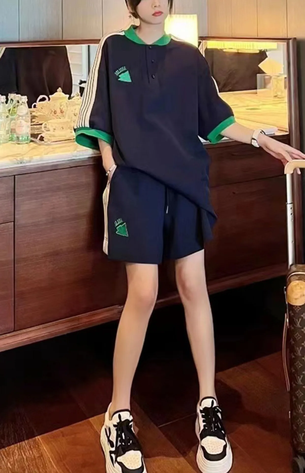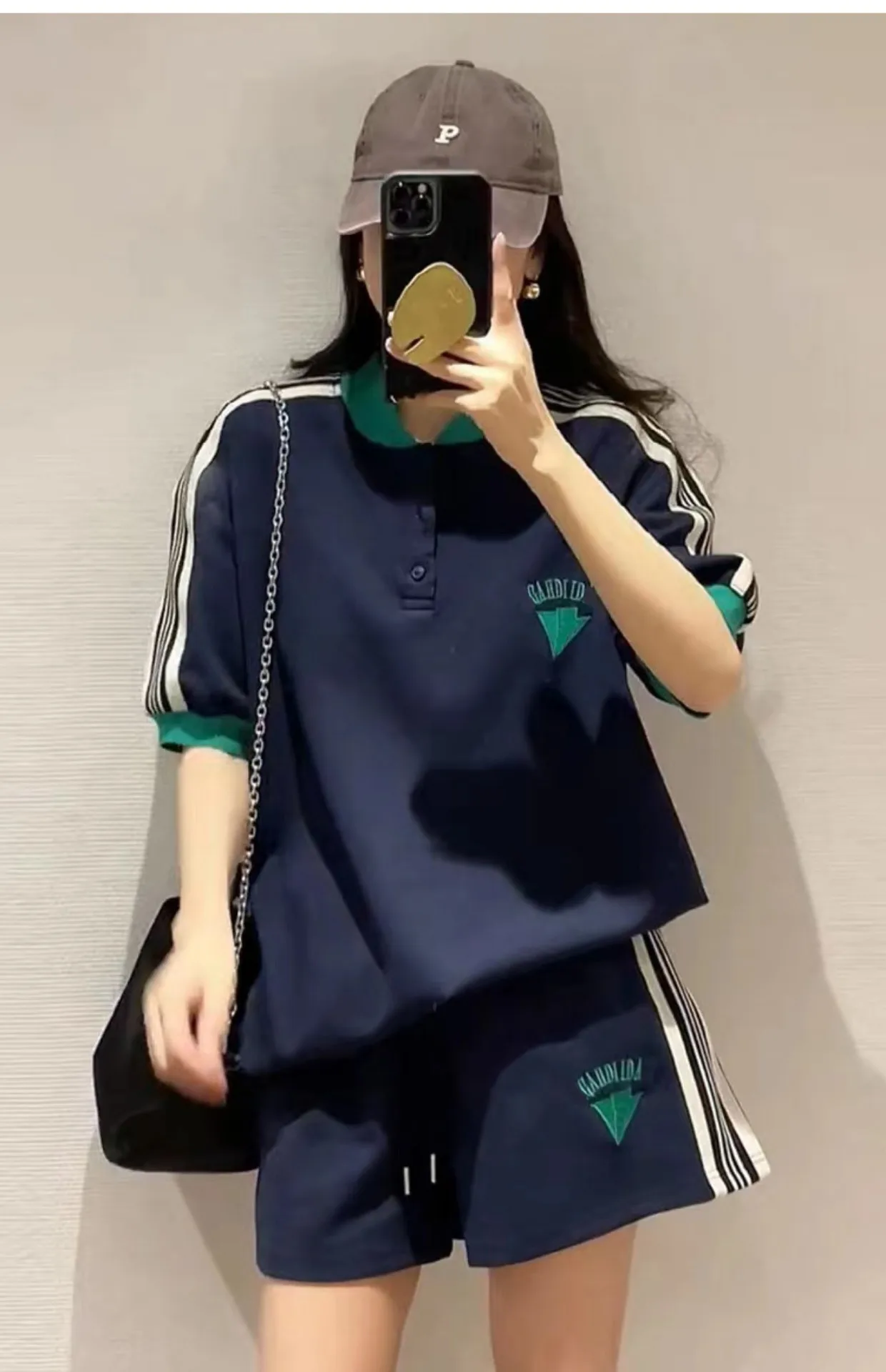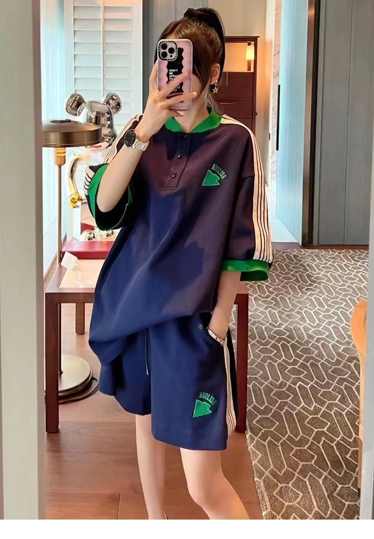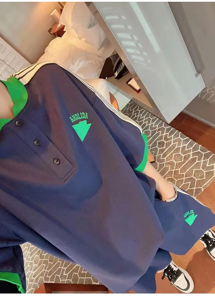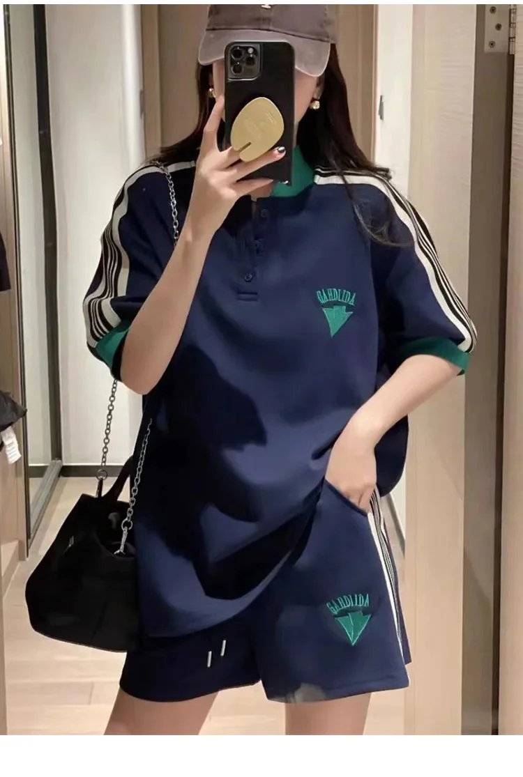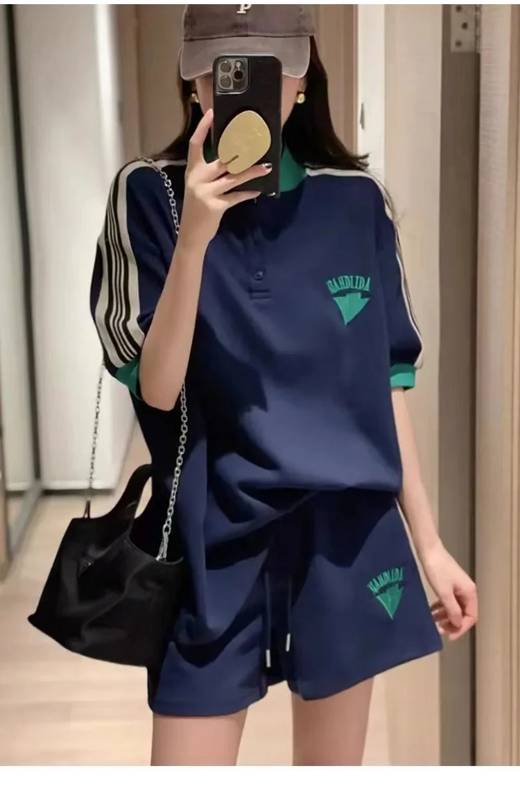 Navy Loose Side Patch Streetwear Tracksuit Summer Shirts Shorts Pants Embroidery Two Piece Sets Womens Outifits Harajuku Casual