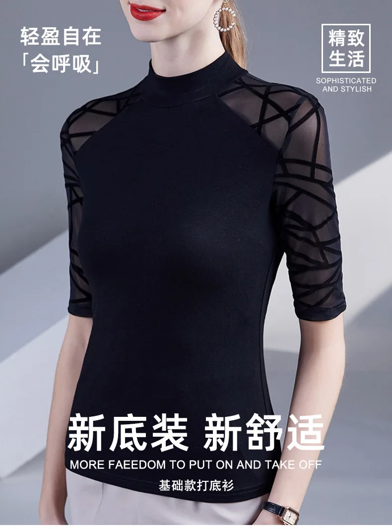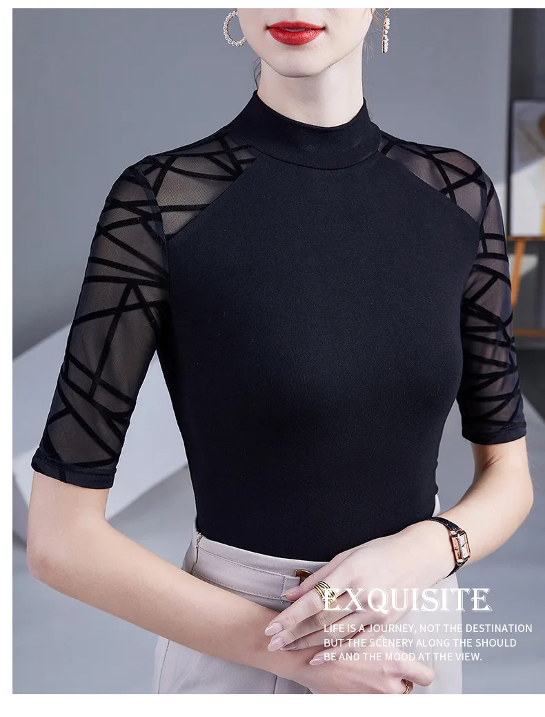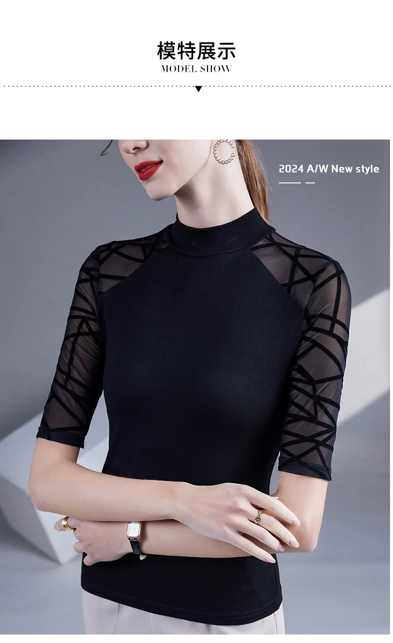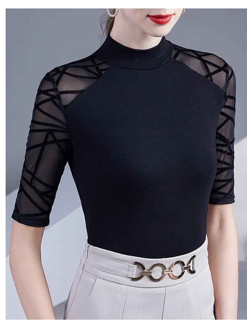 New 2025 clothes - Spring Half Sleeved Women Mesh Tops Fashion Casual Patchwork High Stretch Black T-Shirt M-3XL Clothes