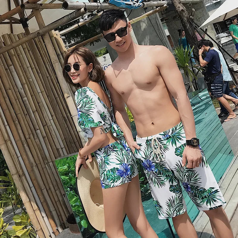 New Matching Swimsuits for Couples Beachwear 3 Pack Set Short Sleeve Women Swimwear Print High Waisted Pants Men Swimming Shorts