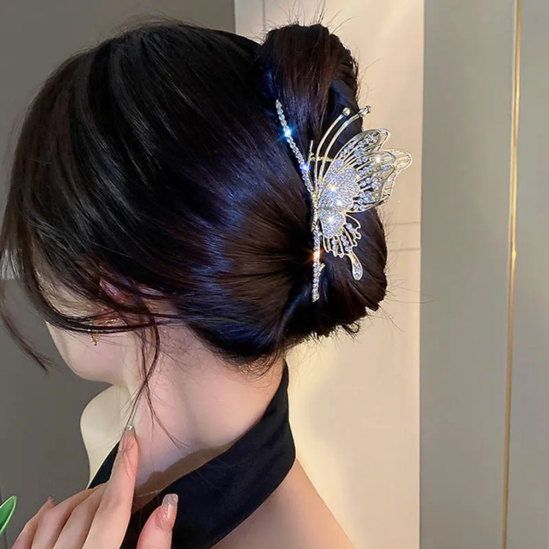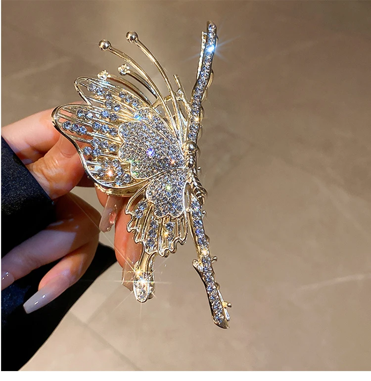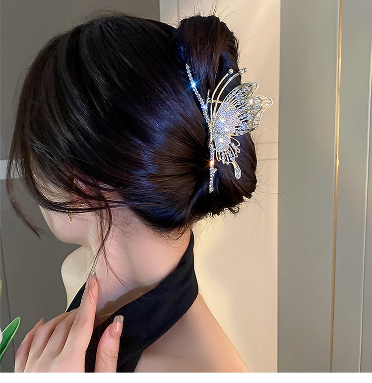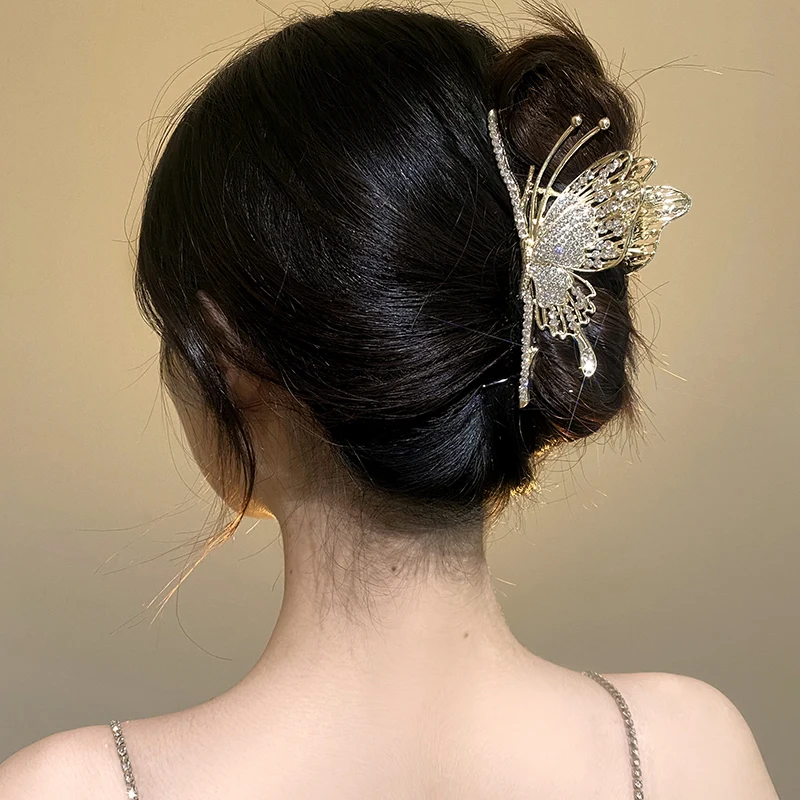 New Metal Black Butterfly Clip Rhinestone Back Head Shark Clip Large Headgear High-end Temperament Hair Accessory