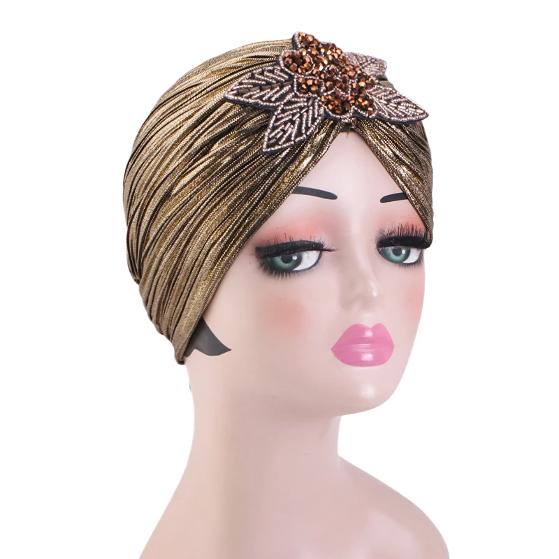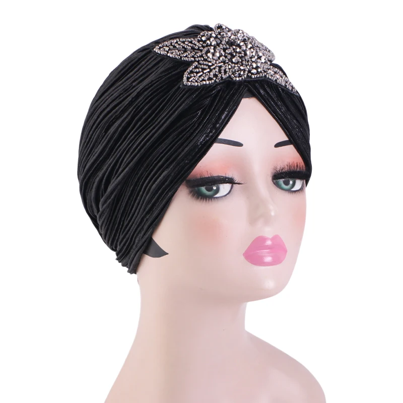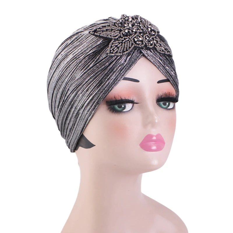 New Rhinestone Flower Turban For Women Elegant Pleated Skull Cap Muslim Hijab Hat Headwraps Elastic Ramadan Beanies Chemo Cap