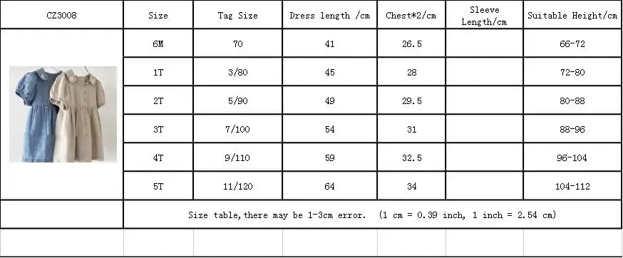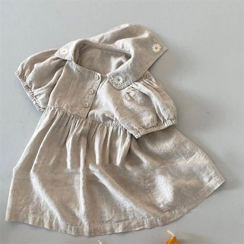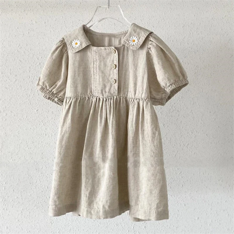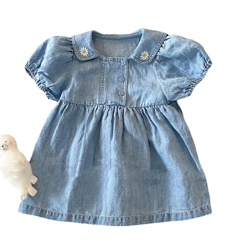 New Summer Girls' Baby Dress Campus Style Flower Embroidery Lapel Bubble Short Sleeve Denim Dress Student Clothes Children Dress