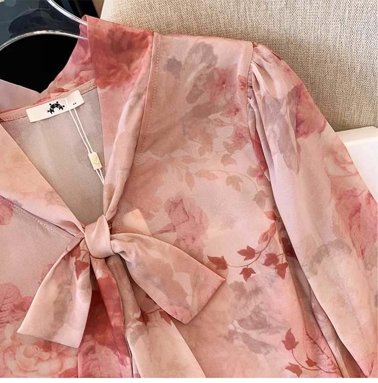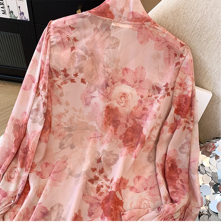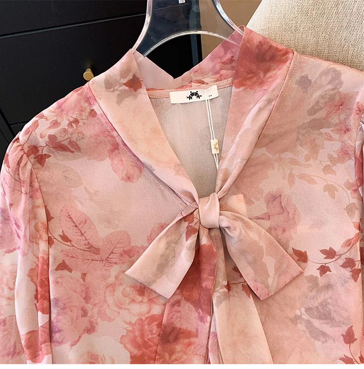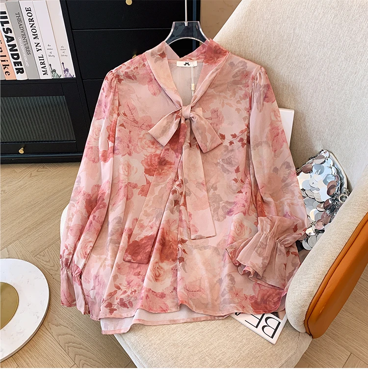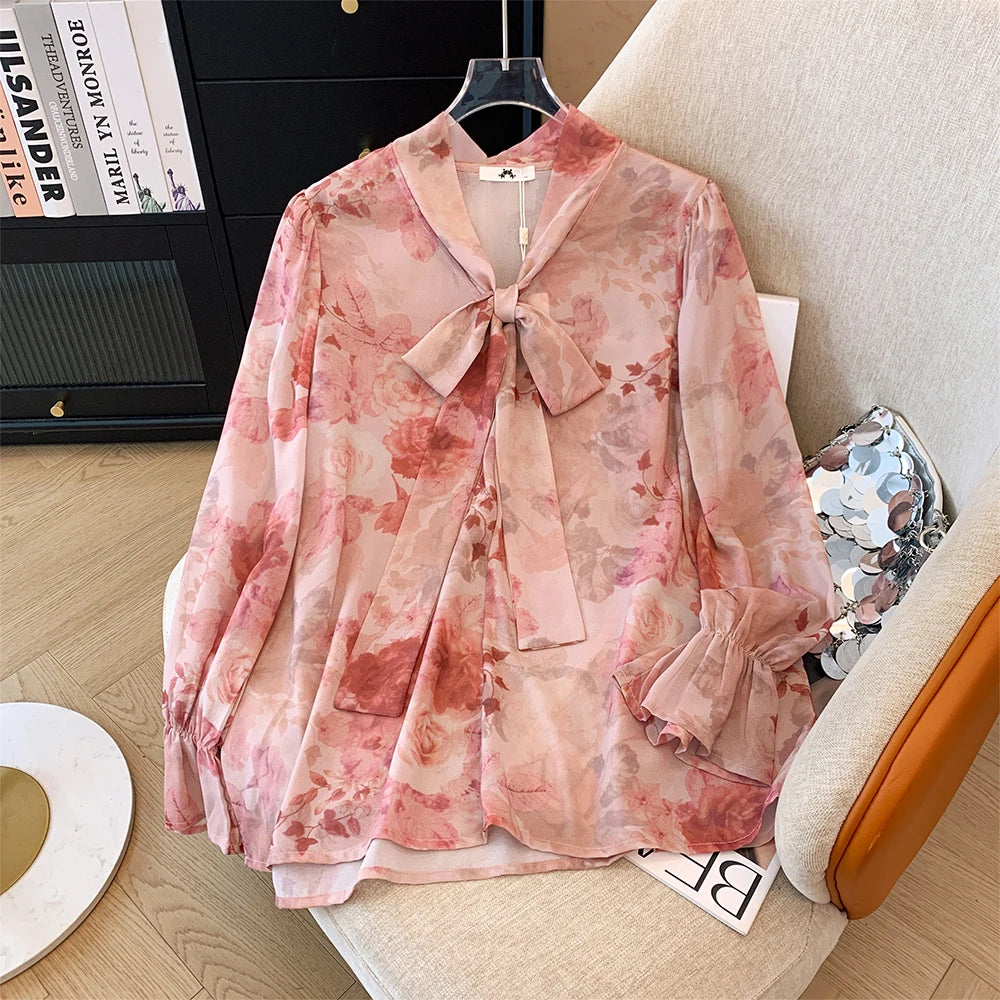 Plus-size Women's Fall Casual Commute Loose and Comfortable shirt Chiffon print long sleeve bow collar lace-up top large 2024