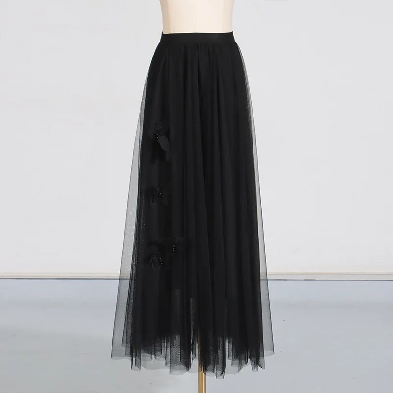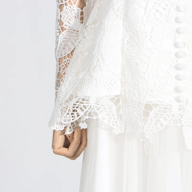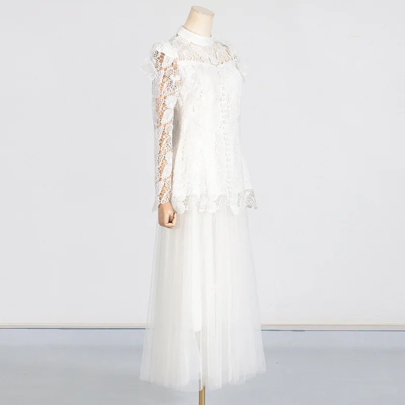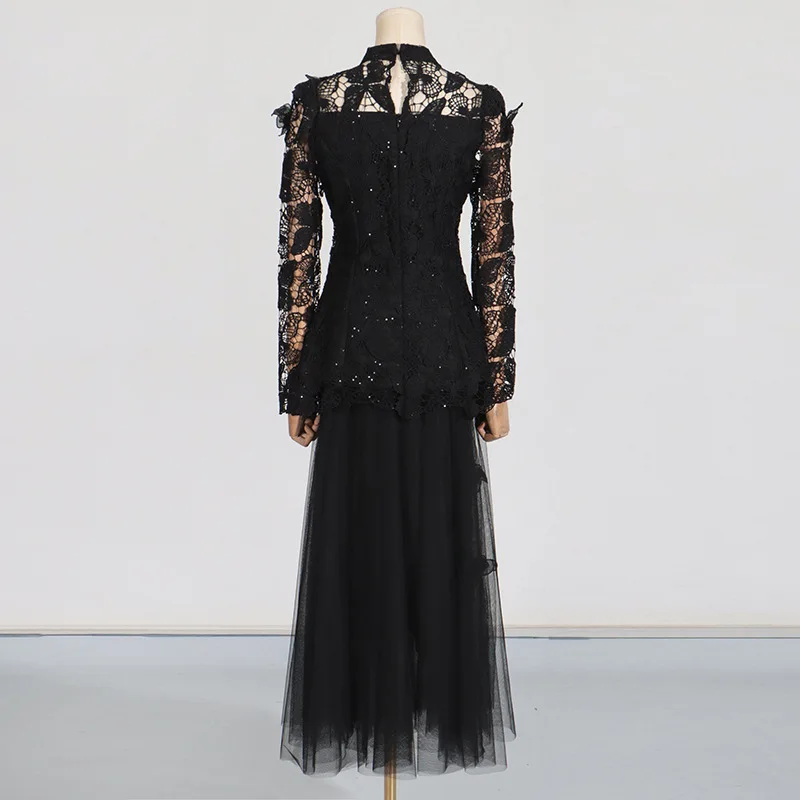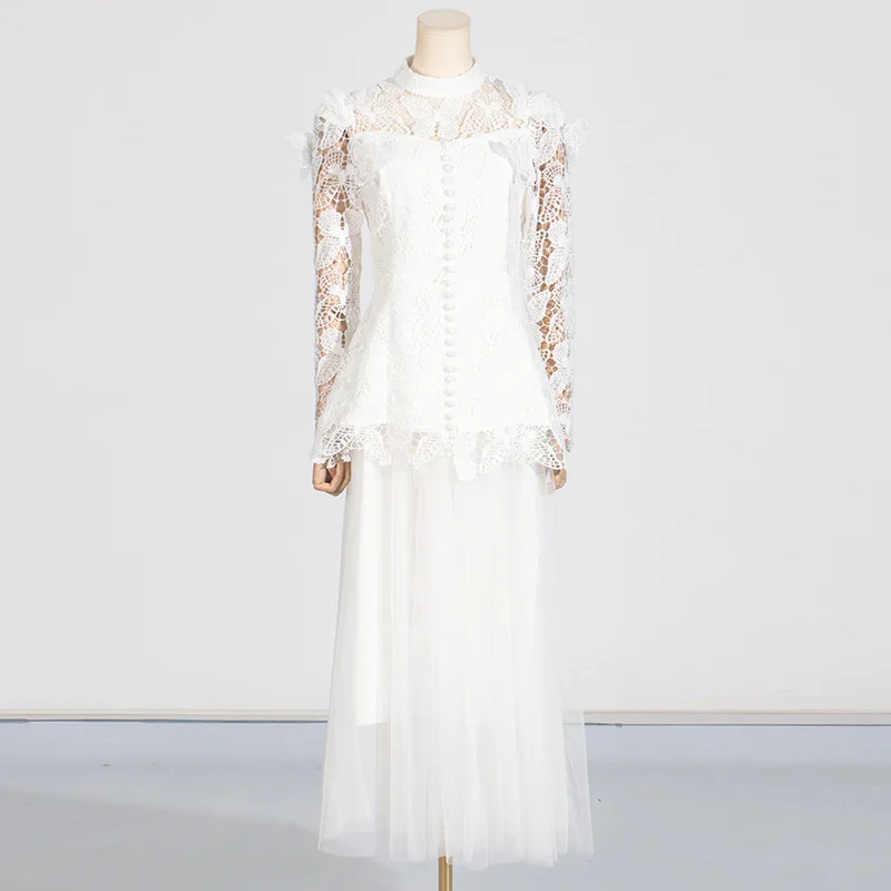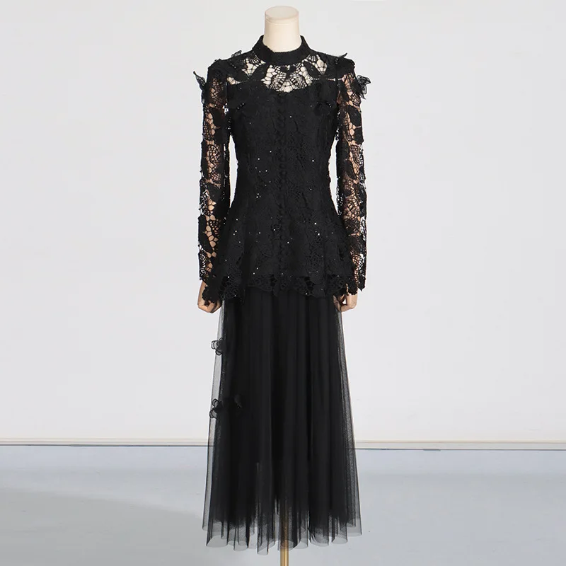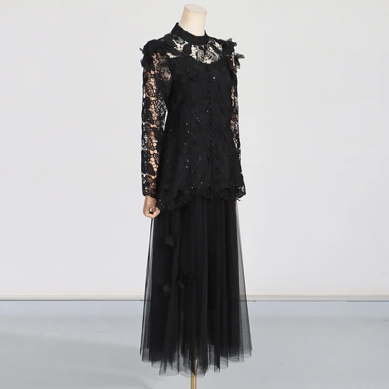 QMQA Fashion Women's Elegant 2 Piece Set Embroidery Long Sleeve Top High Waist Mesh Skirt Sets 2025 Spring Female New QM78