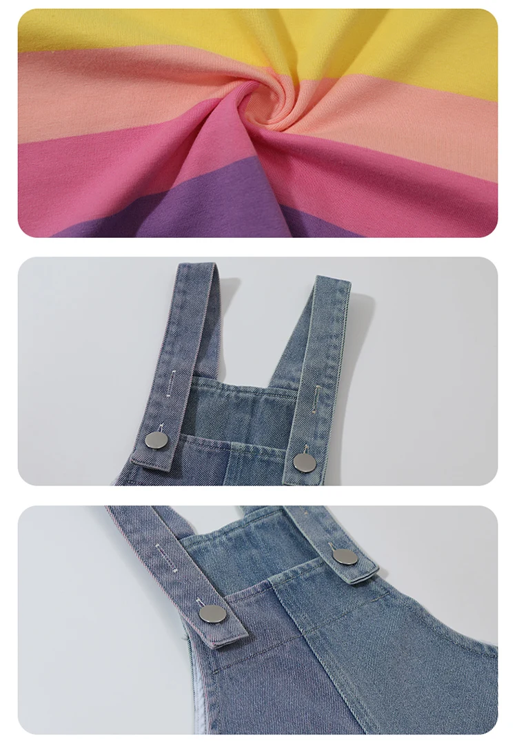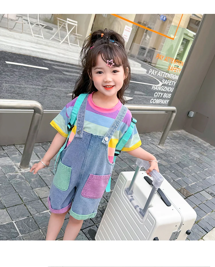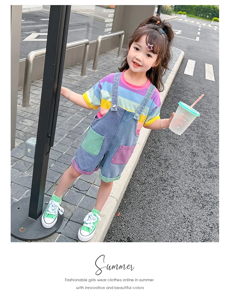 Rainbow T-Shirt Summer Bib Pants Baby Girls Shorts Jumpsuit Set Cute Colorful Striped Short Sleeve Tops+Denim Short overalls Set
