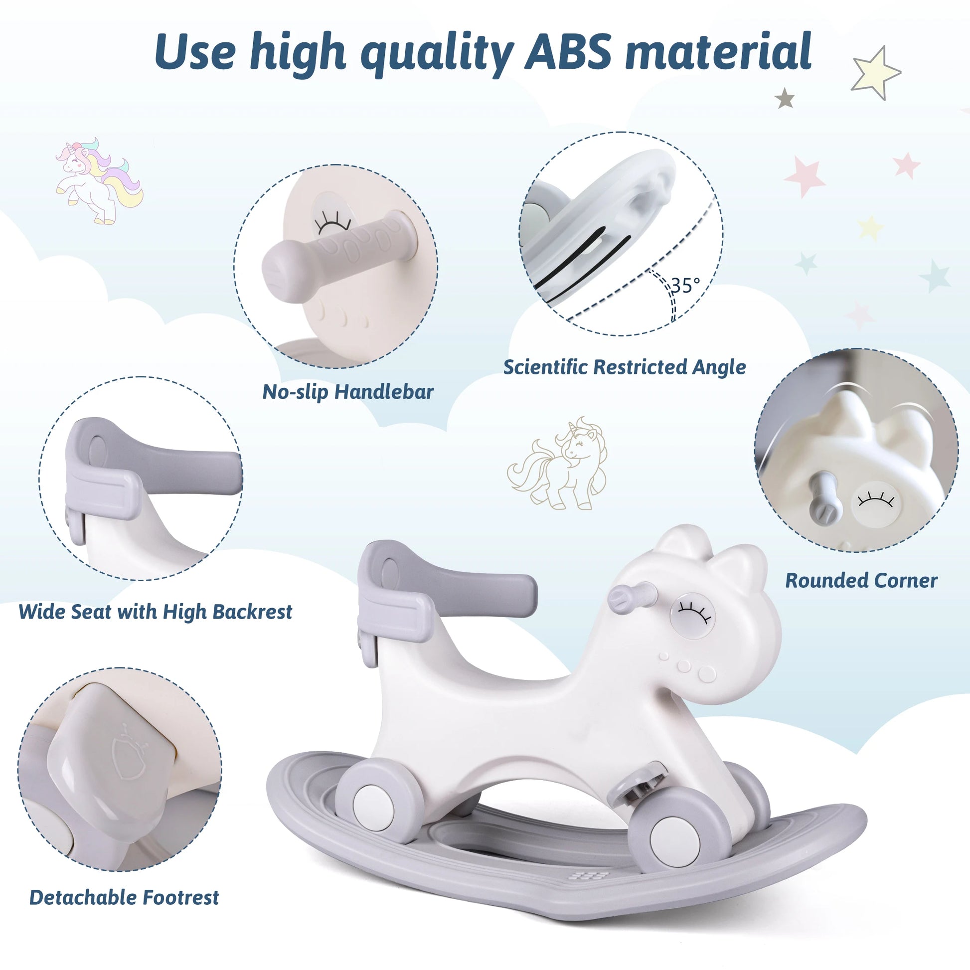 --【A secure and cozy option】Ideal for kids' height, enabling them to effortlessly climb onto and off the rocking horse and enjoy swaying independently. The entire rocking horse surface is sleek, with rounded plastic edges to avoid any collisions. It features a handle and a curved backrest, providing children with stability while rocking back and forth.