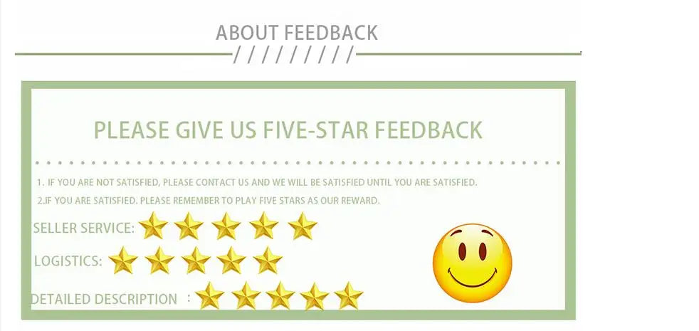 Your feedback is very important to us. If you are happy with us, please remember to leave us positive feedback (5 stars).If you have any dissatisfaction, please give us the opportunity to resolve the problem before leave us a negative feedback. Your satisfaction pursuit our target.