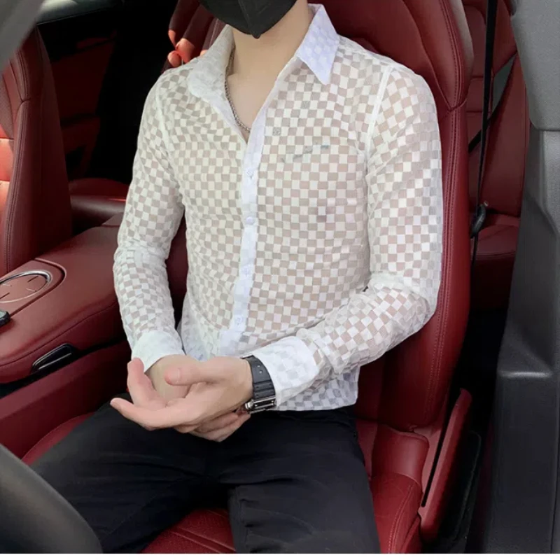 Spring Autumn New Fashion Plaid a Peaked Collar Men's Clothing Shirts Long Sleeve Button Hollow Out Slim Korean Chaopai Blouse
