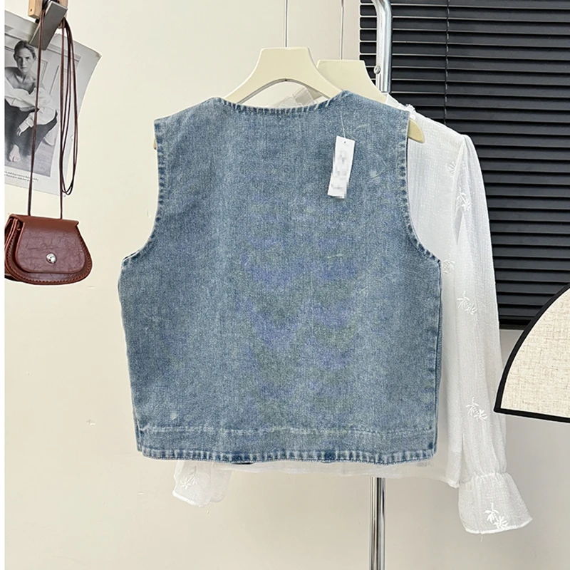 Spring Autumn V-neck Denim Vest Coat Women Korean Style School Ladies Petite Girls Cute Cover-Up Tank Top Jacket
