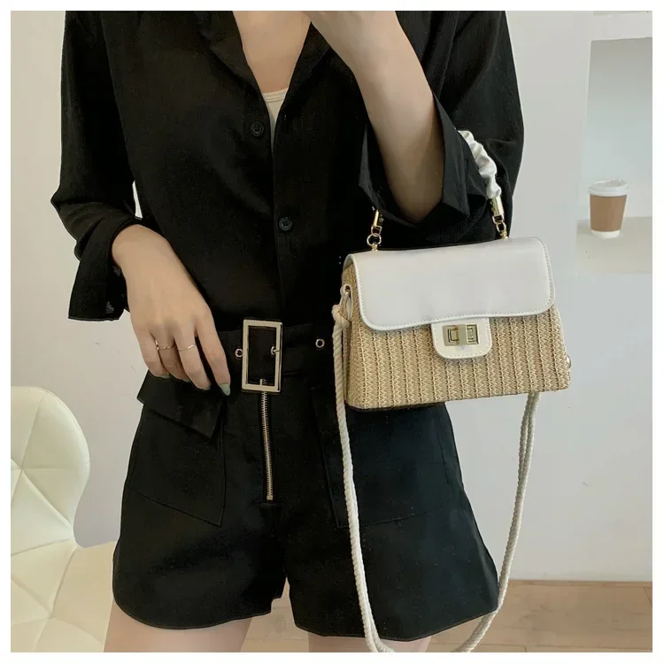 Straw Beach Bag for Women 2021 Summer Pleated Handle Luxury Designer Contrast Color Crossbody Purse and Handbag Lady Bolsos