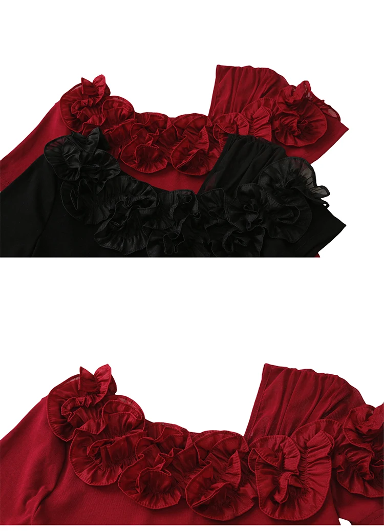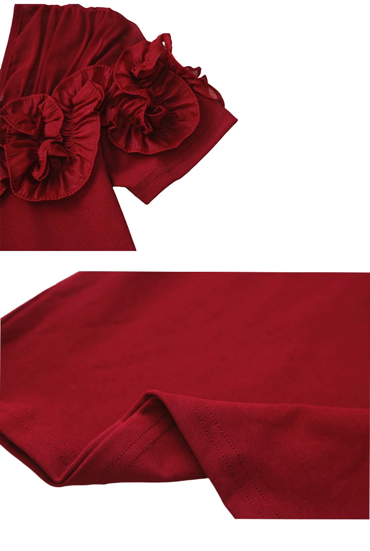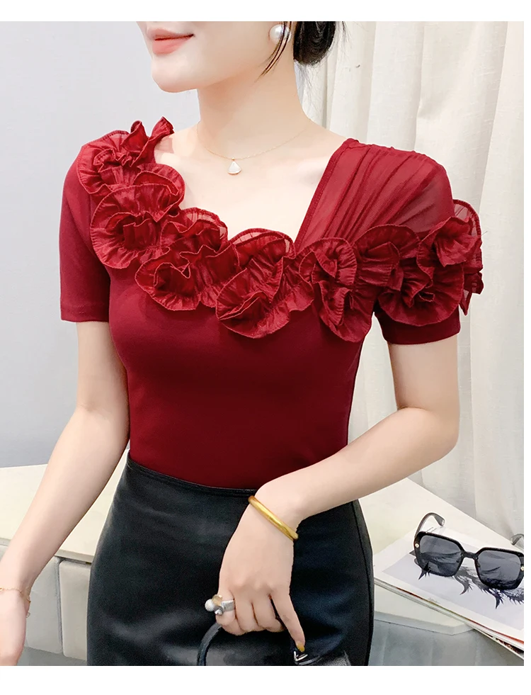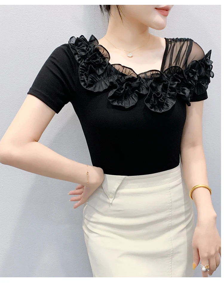 Summer Cotton T-shirts Chic Asymmetric Neckline Off-Shoulder Ruffle Trim Slim Fit Tee Exclusive Boutique Women's Casual Top