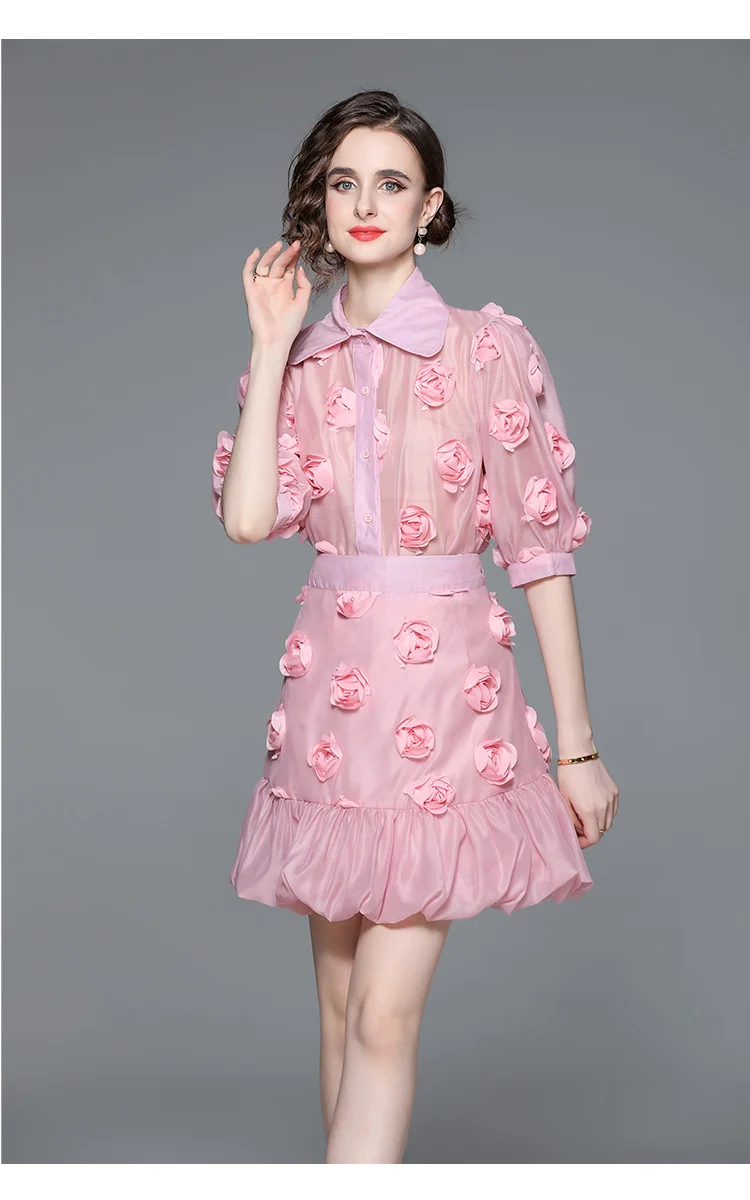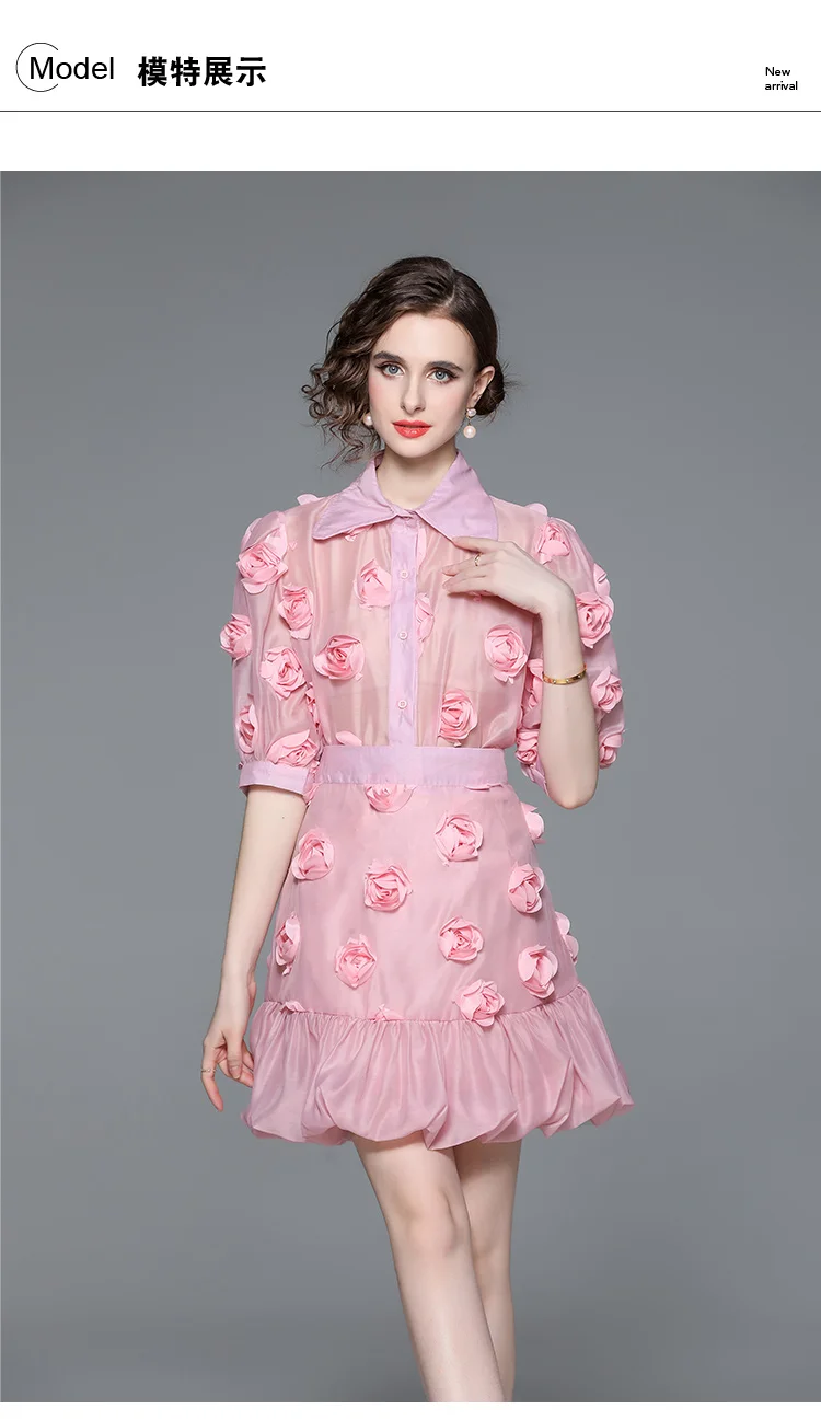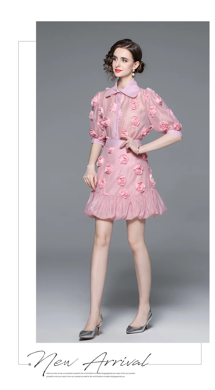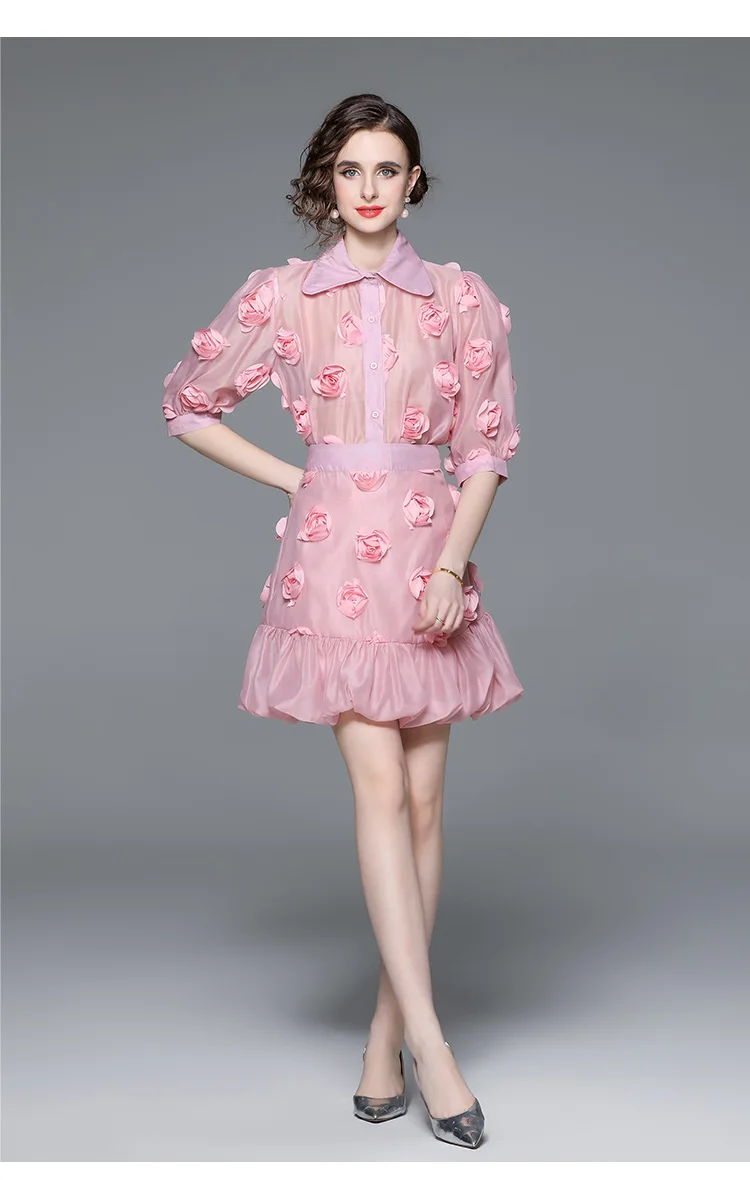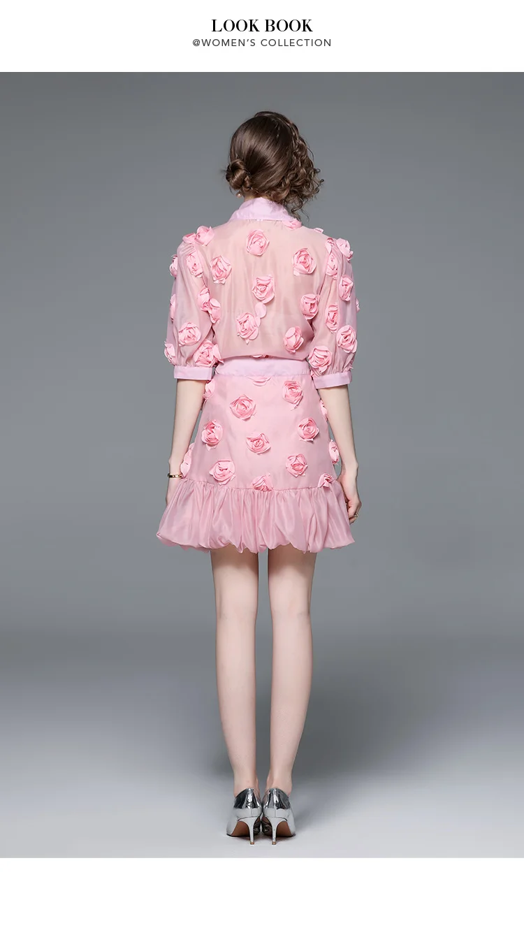 Summer Runway 2 Pieces Suit Women's Lapel Puff Sleeve 3D Applique Flower Pink Blouses and Mini Ruffles Skirt Set Clothing N8698
