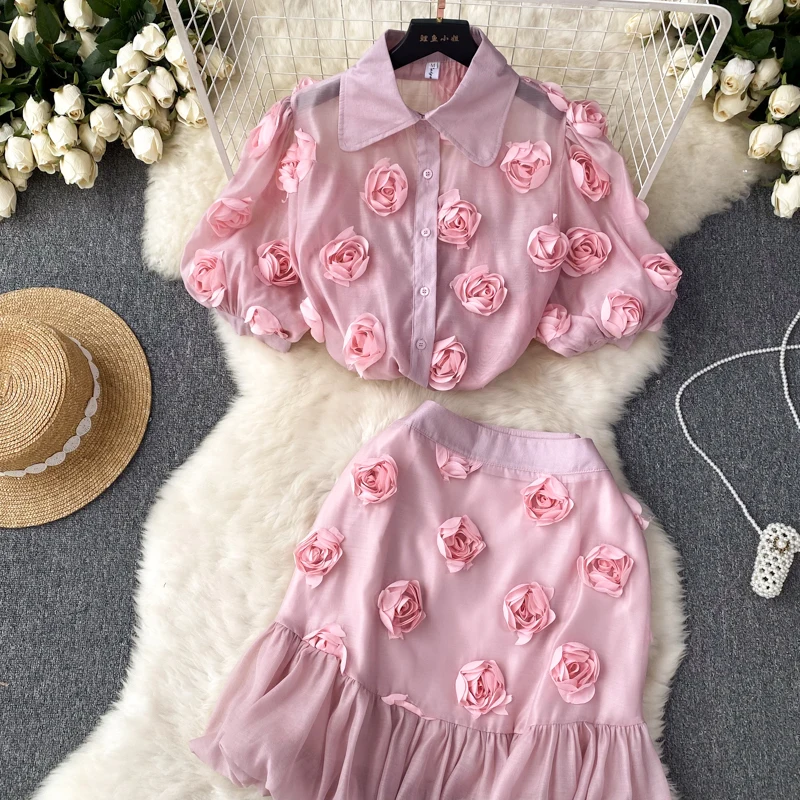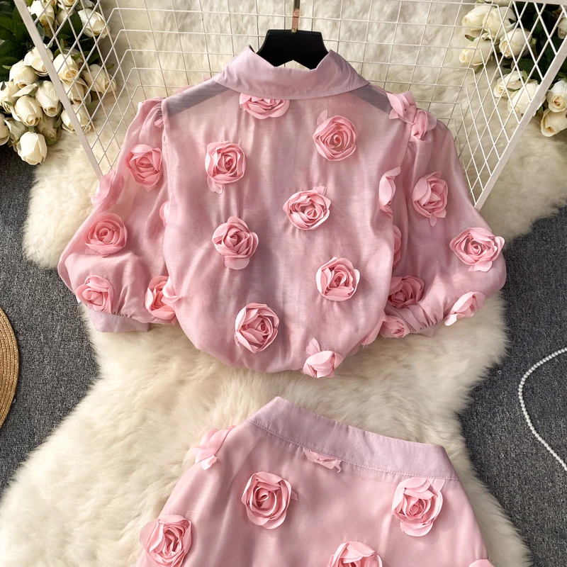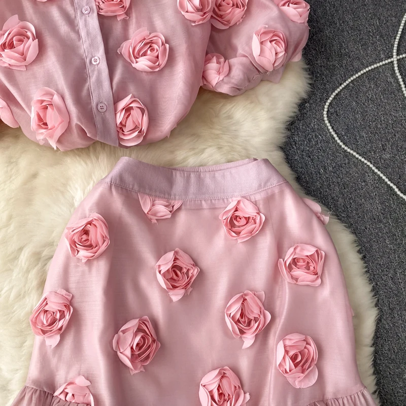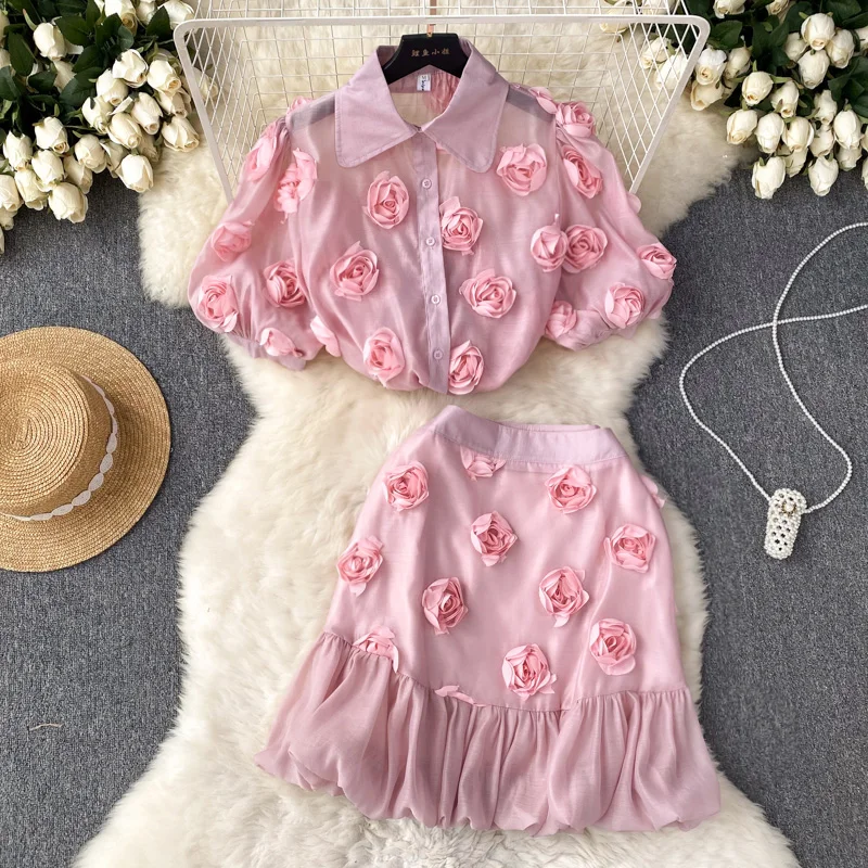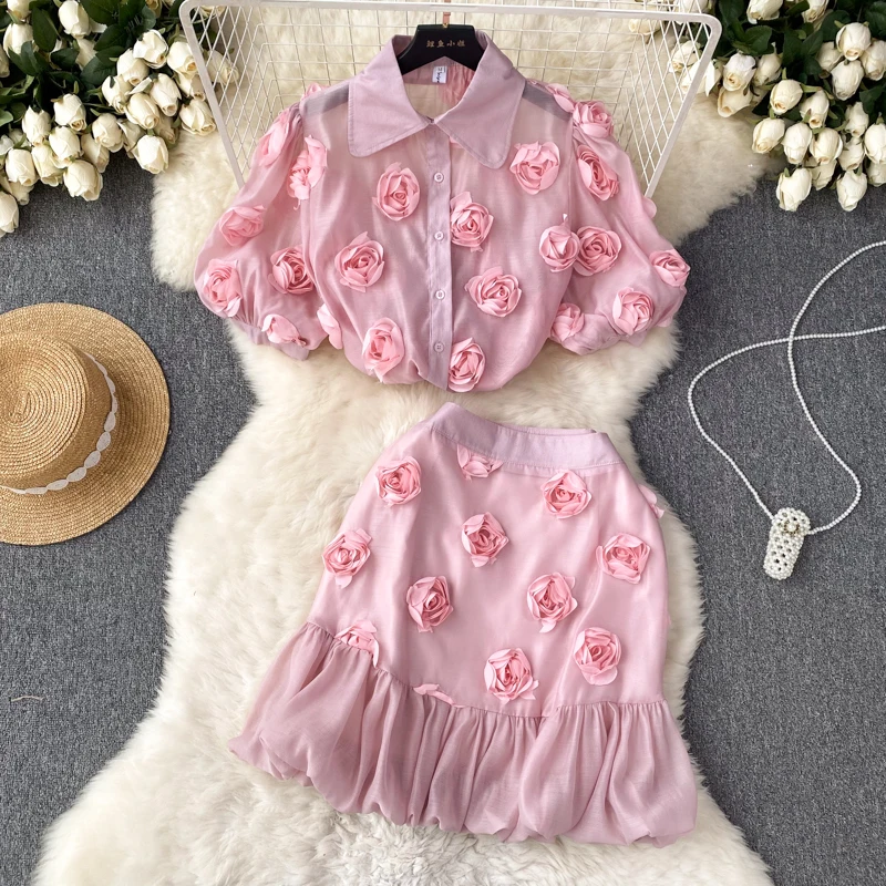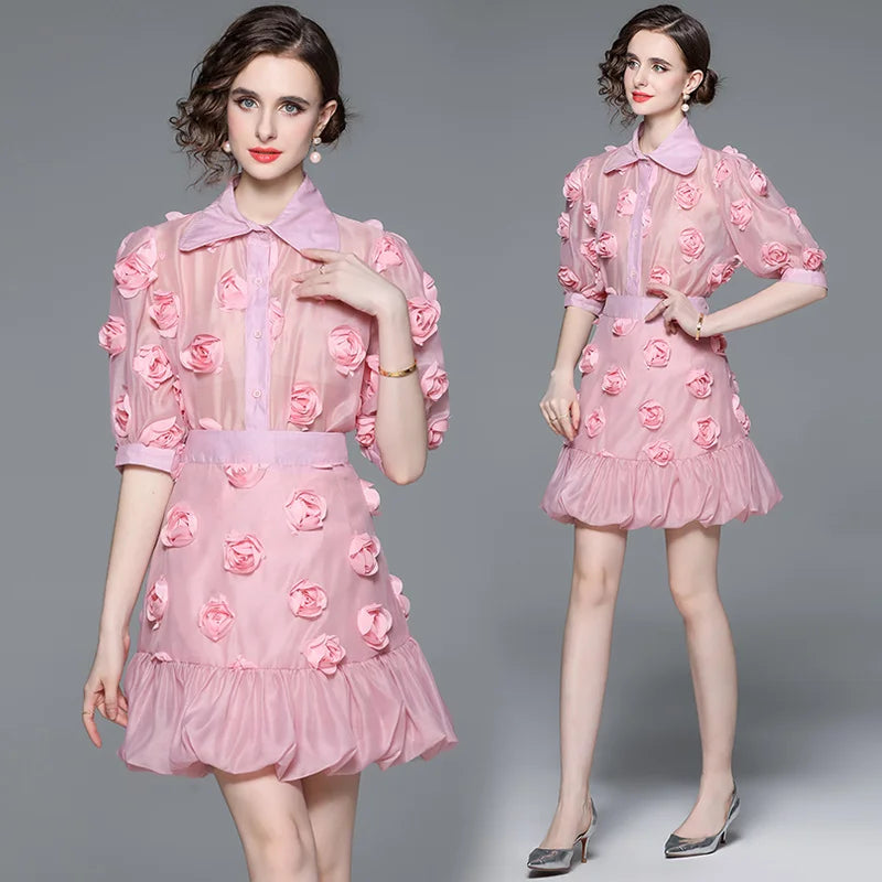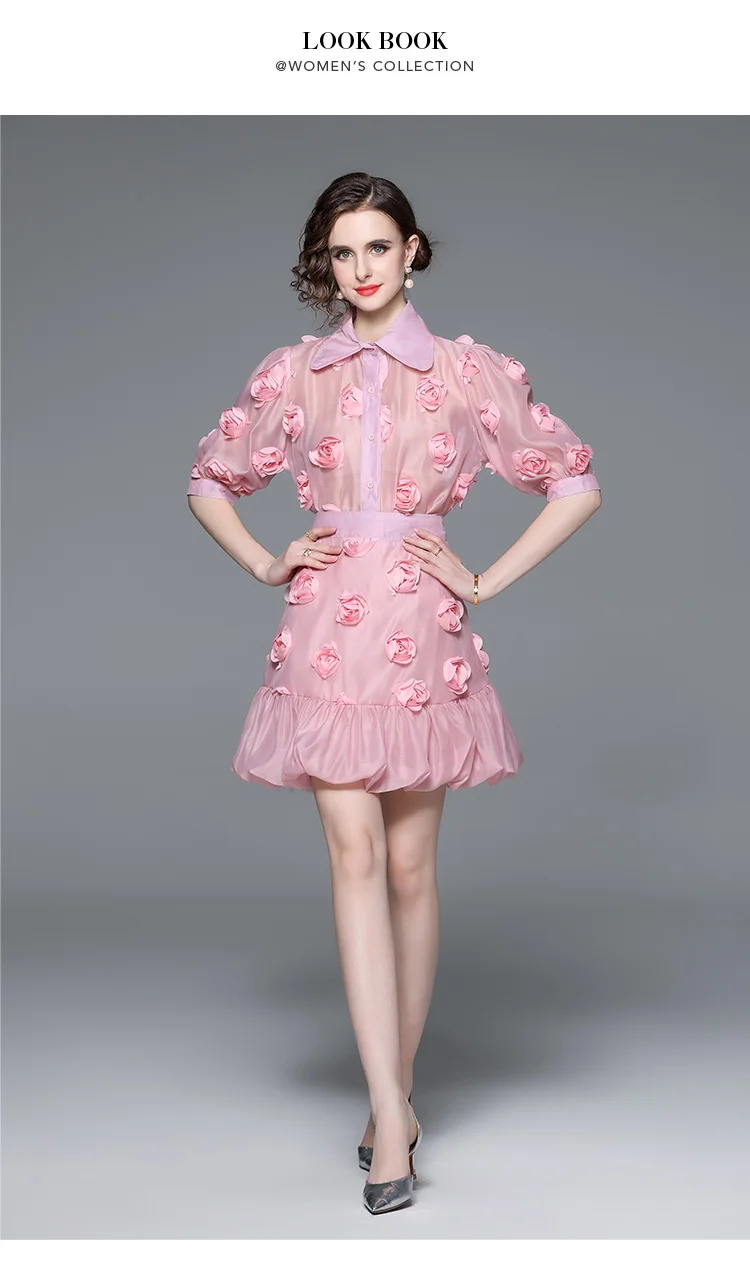 Summer Runway 2 Pieces Suit Women's Lapel Puff Sleeve 3D Applique Flower Pink Blouses and Mini Ruffles Skirt Set Clothing N8698