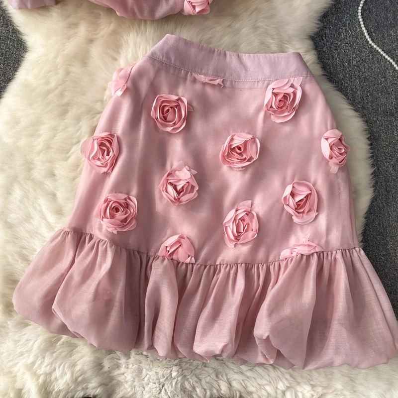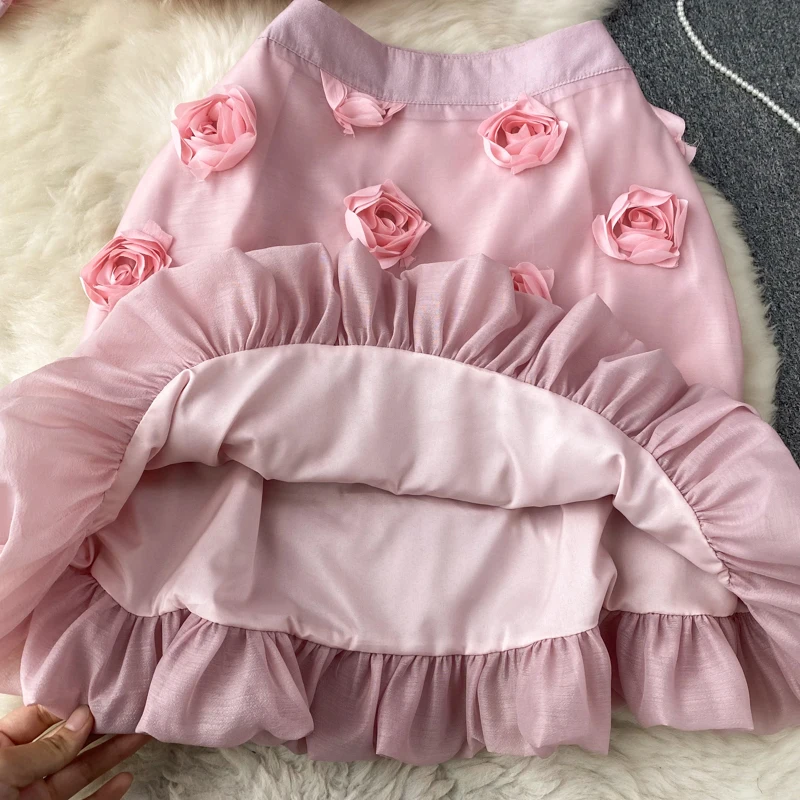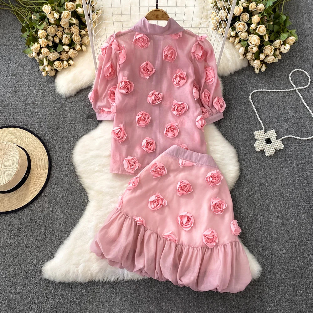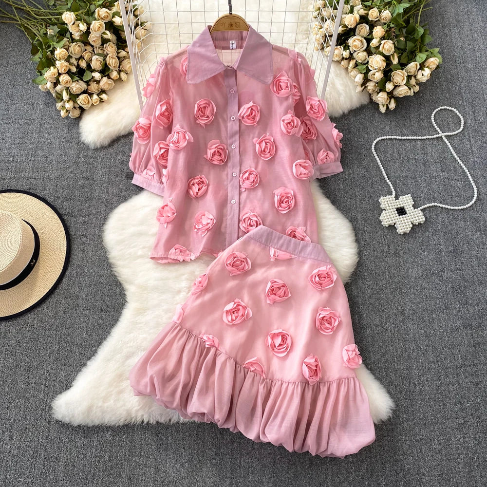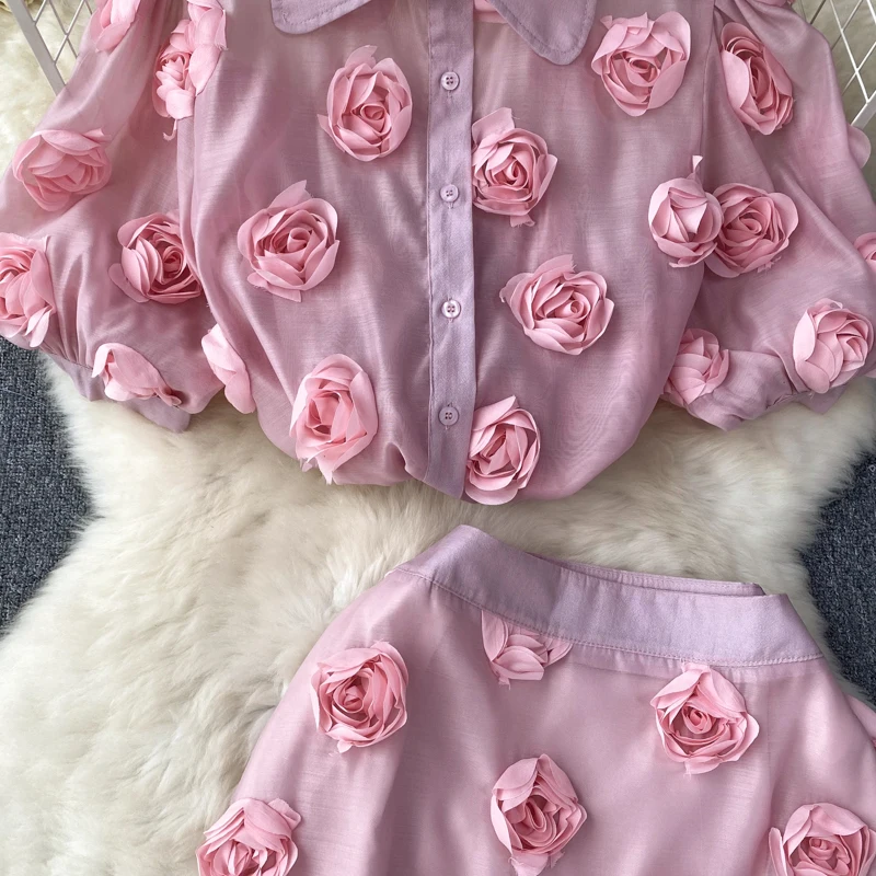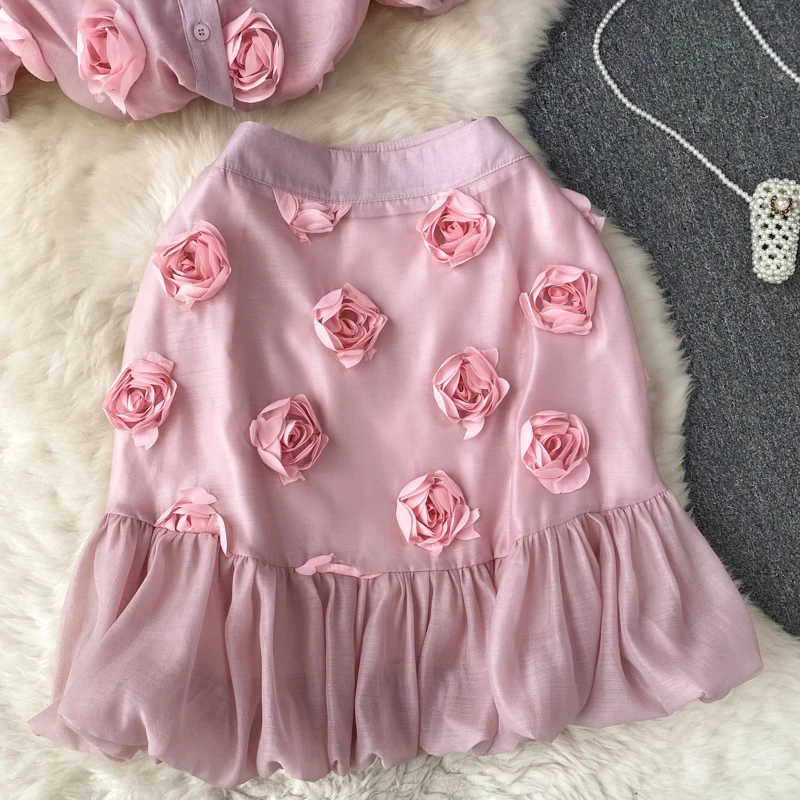 Summer Runway 2 Pieces Suit Women's Lapel Puff Sleeve 3D Applique Flower Pink Blouses and Mini Ruffles Skirt Set Clothing N8698