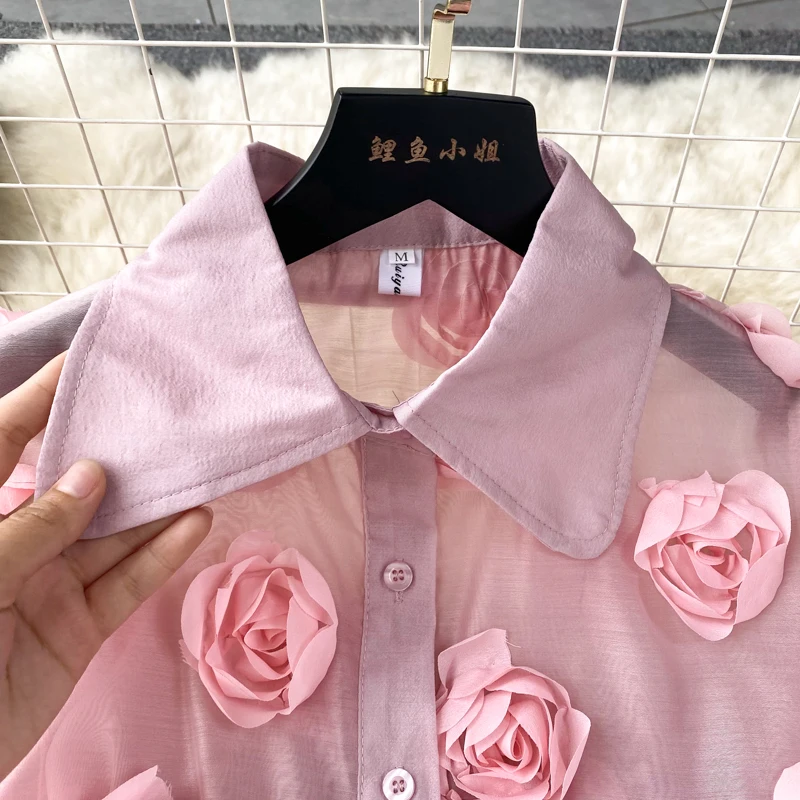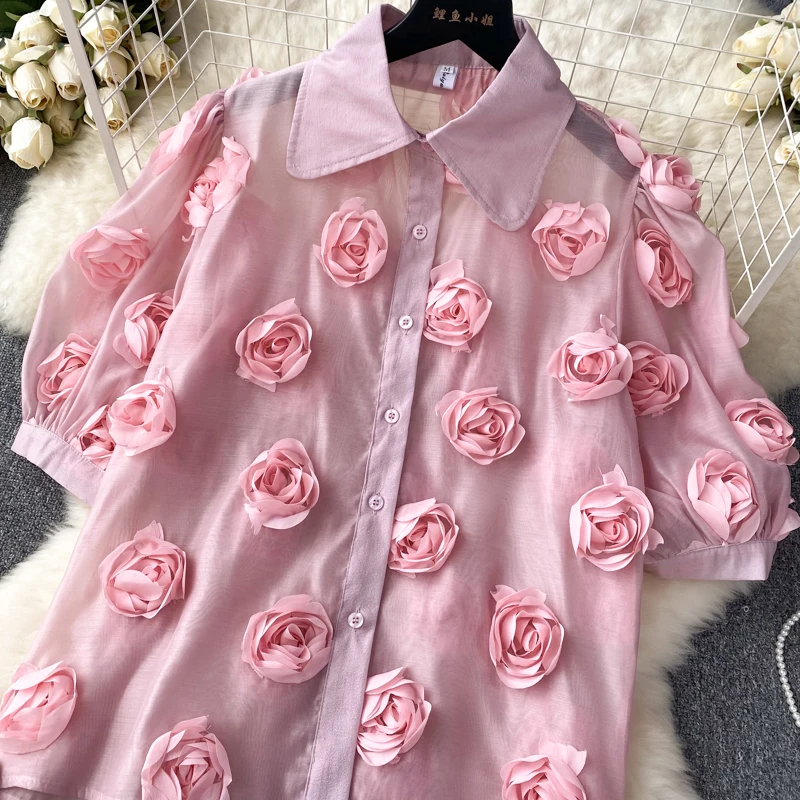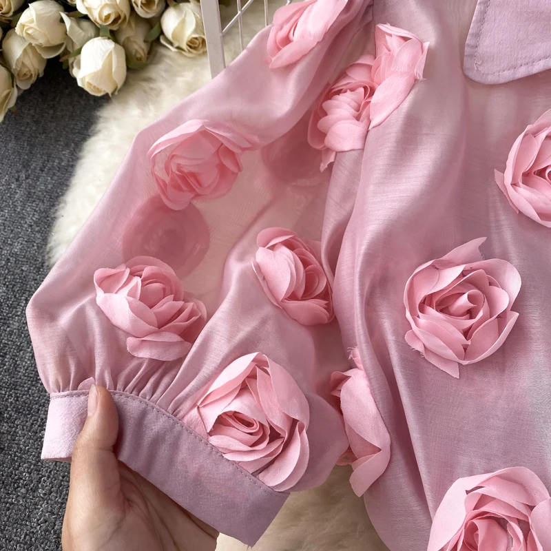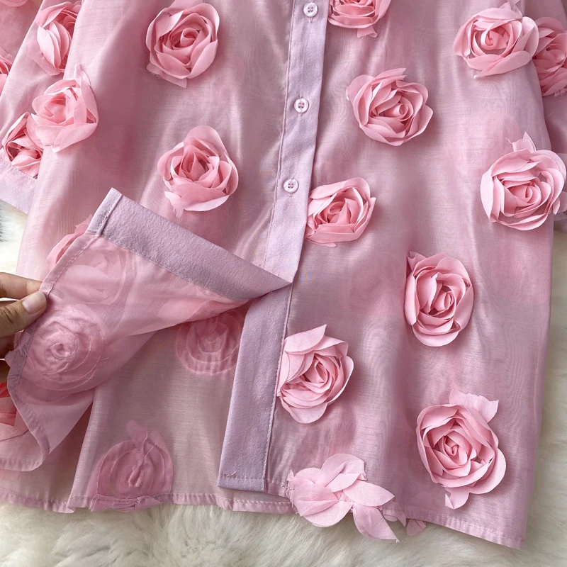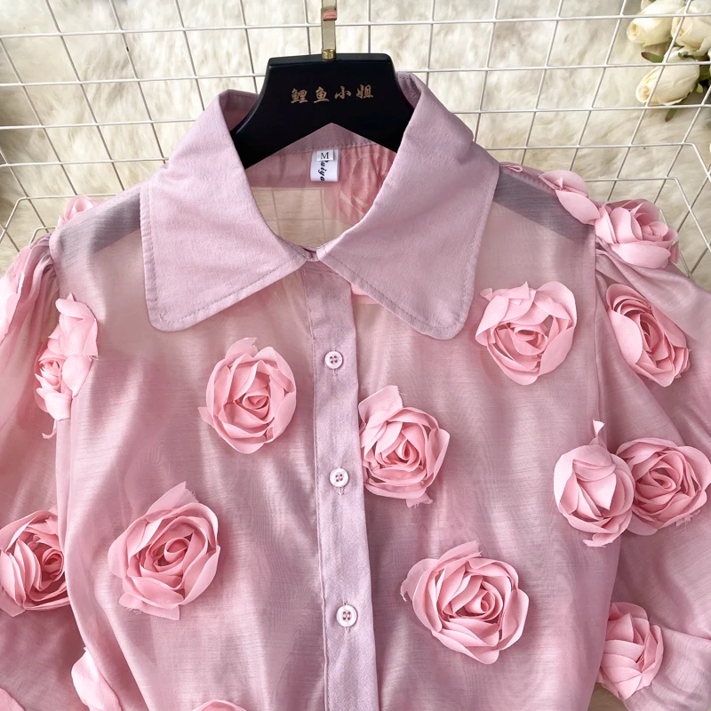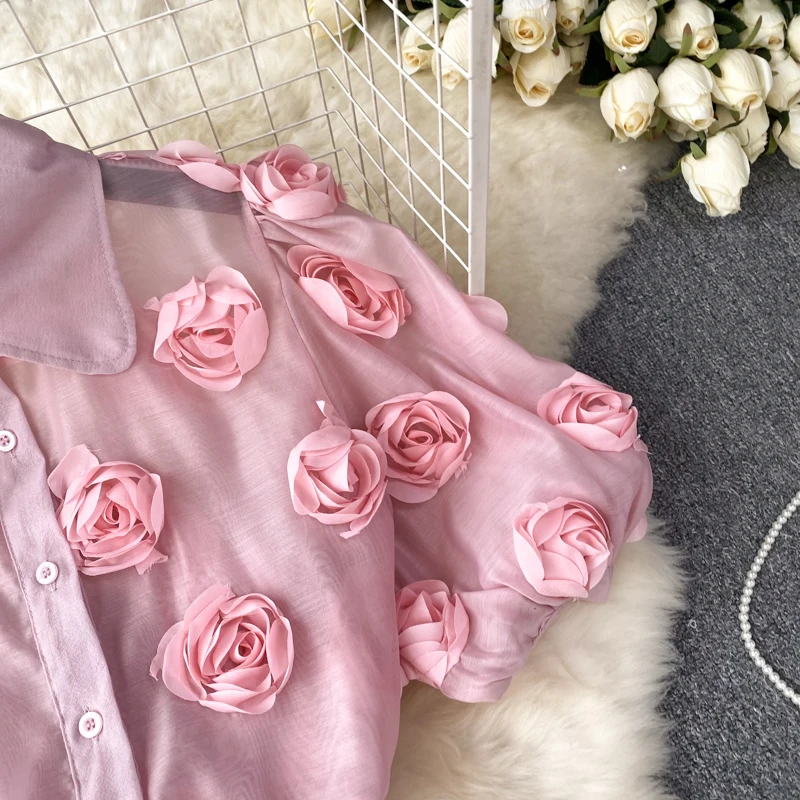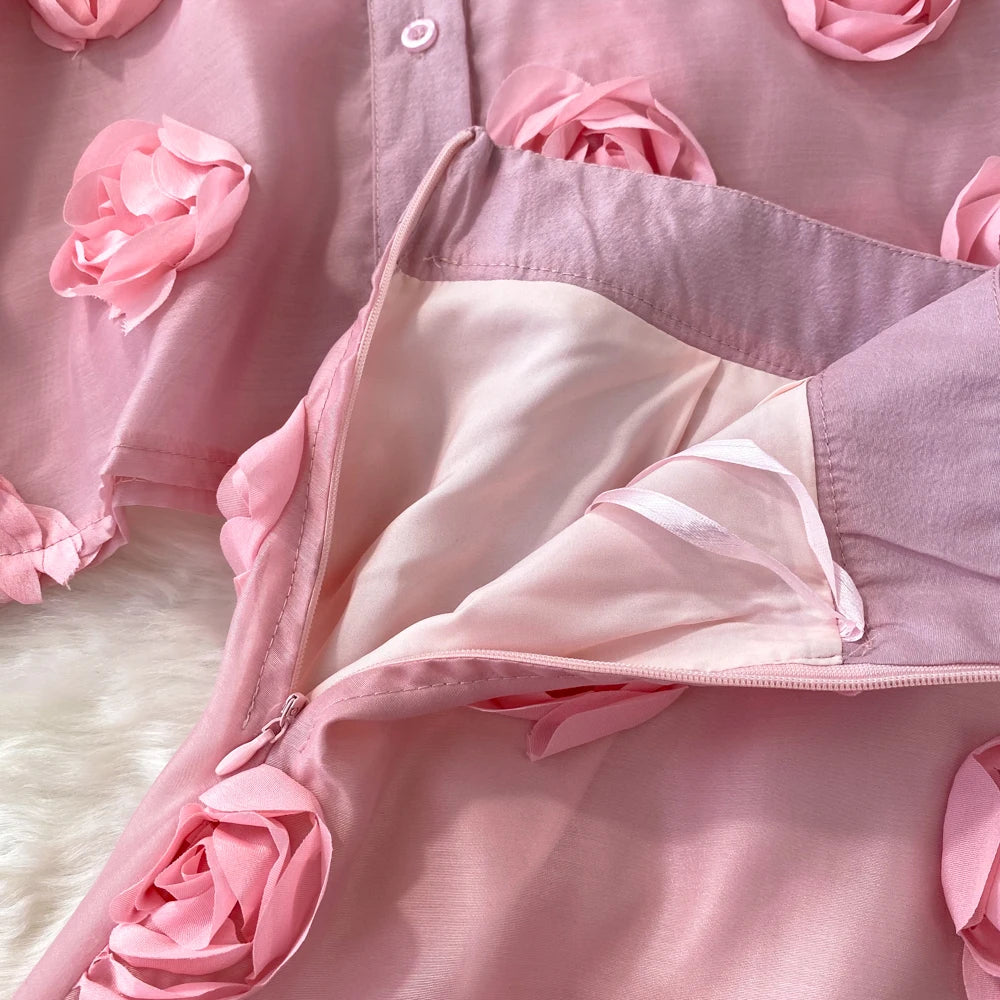Summer Runway 2 Pieces Suit Women's Lapel Puff Sleeve 3D Applique Flower Pink Blouses and Mini Ruffles Skirt Set Clothing N8698