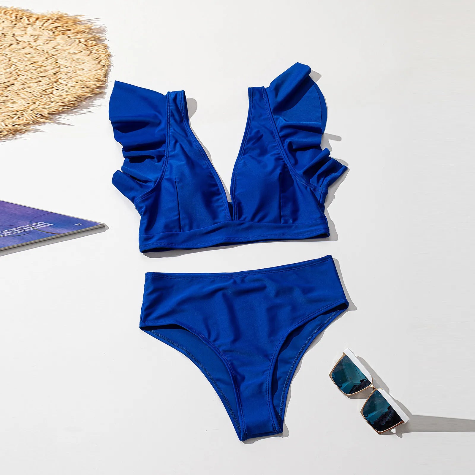 Summer Women 2023 High Waist Bikinis Ruffle Swimwear Swimuit Female Retro Solid Color Beachewear Bikini Set Women's Clothing