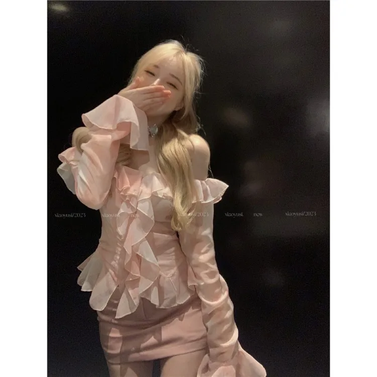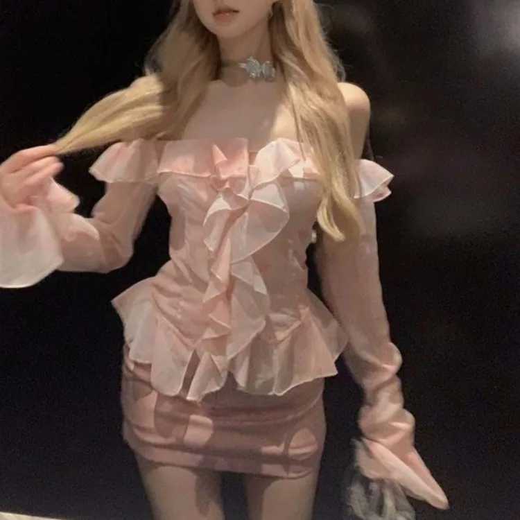 Sweet Pink Off Shoulder Ruffles Long Sleeve Shirts Women+ Y2k High Waist Bodycon Skirts 2024 Summer New Two Piece Sets