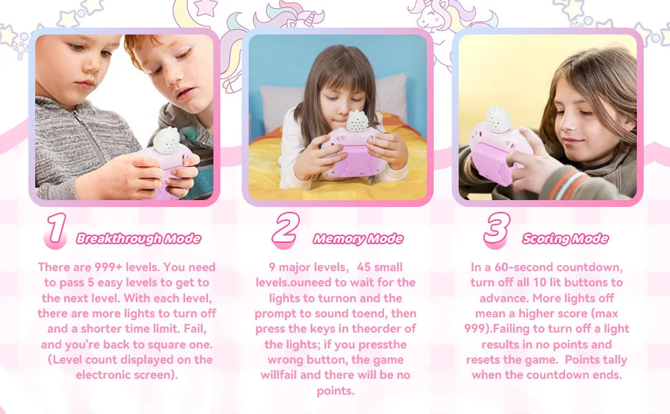 During the game, when you press the silicone bubbles, there may be a situation that the LEDs can not be turned off, you just need to touch your finger to the bottom of the silicone bubbles to make the LEDs go out. This is a normal phenomenon, because the LED is through the silicone bubble to push the switch on the PCBA board to turn off, if the bubble to push the switch on the PCBA board is too small strength will not be able to turn off the LED.