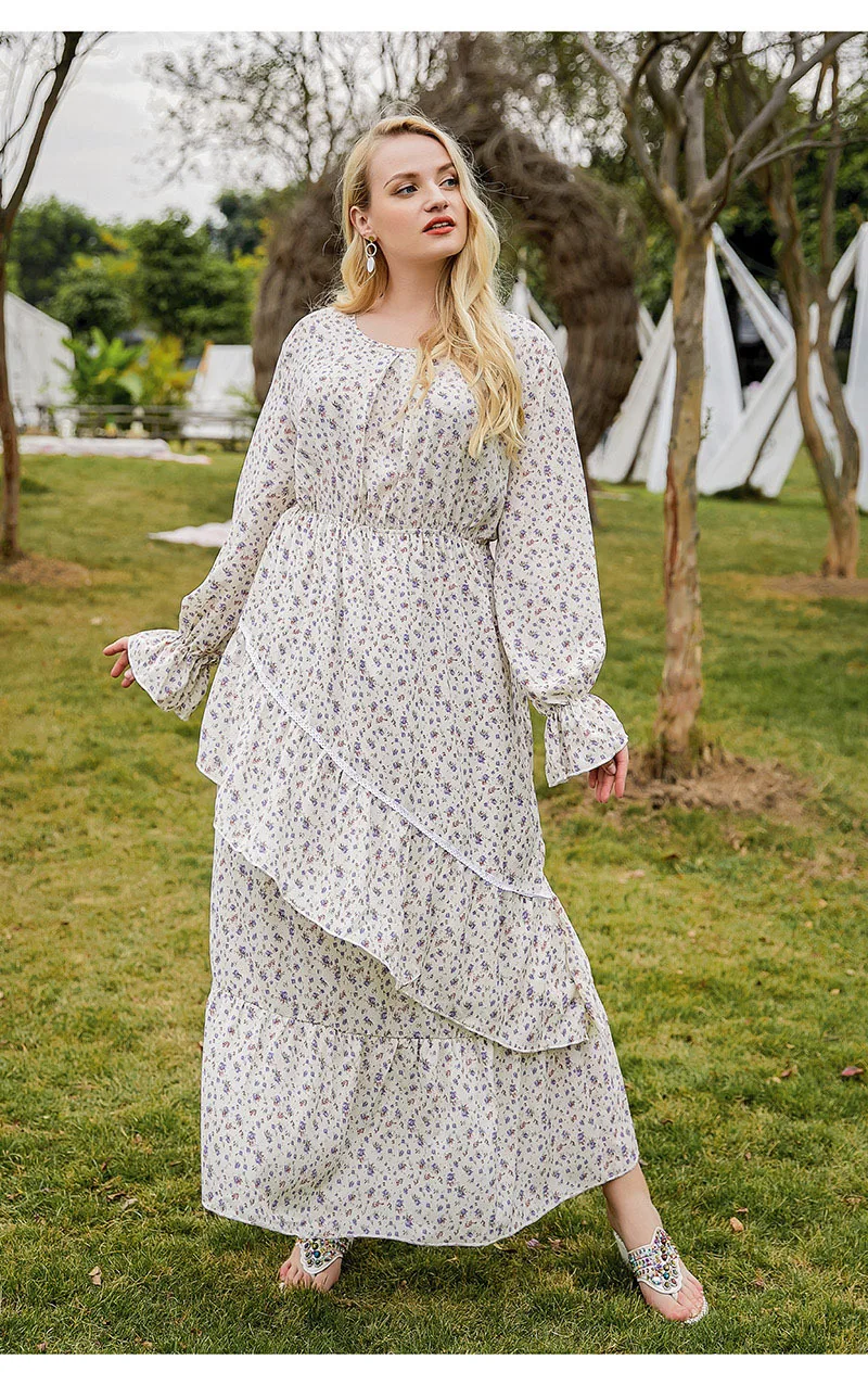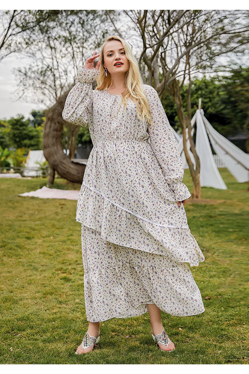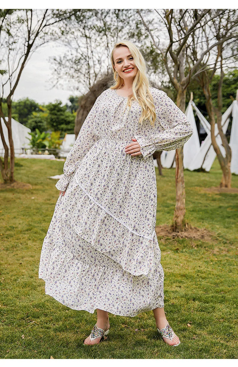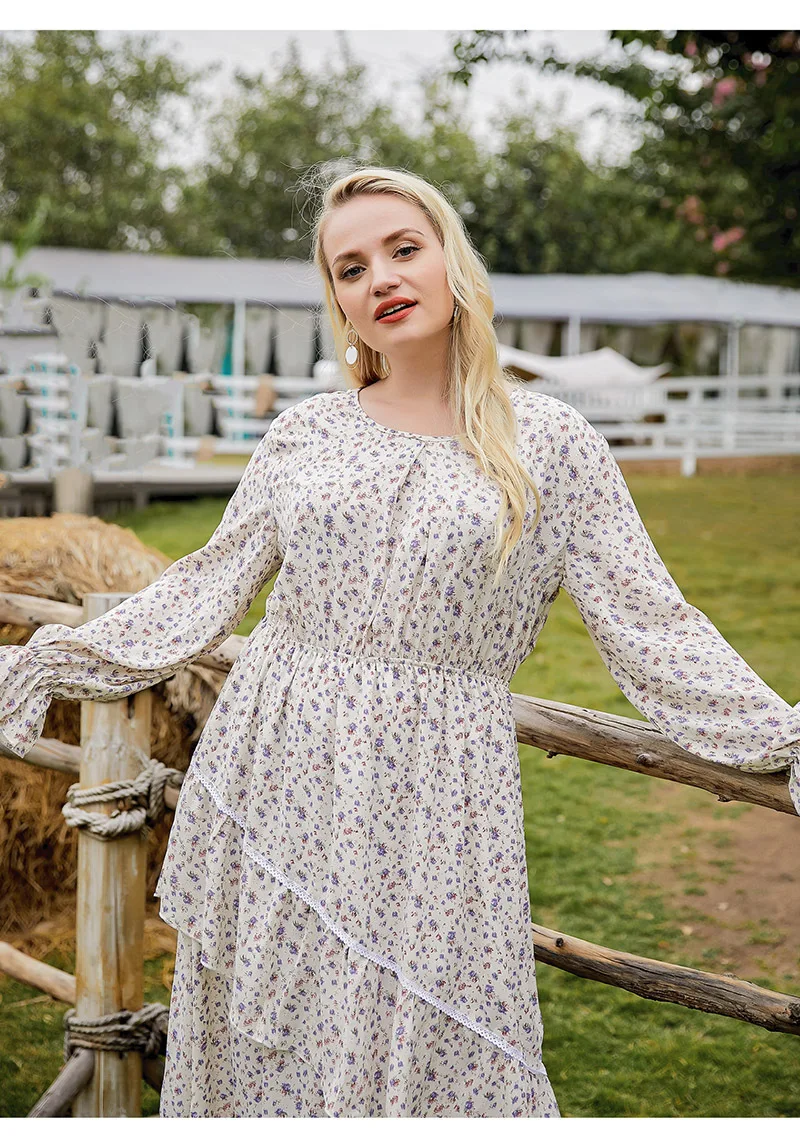 Vigojany 2025 Spring Autumn Ruffle Plus Size Dress Print Lantern Long Sleeve Loose Large Big Dress Lady Chubby Curvy Dresses